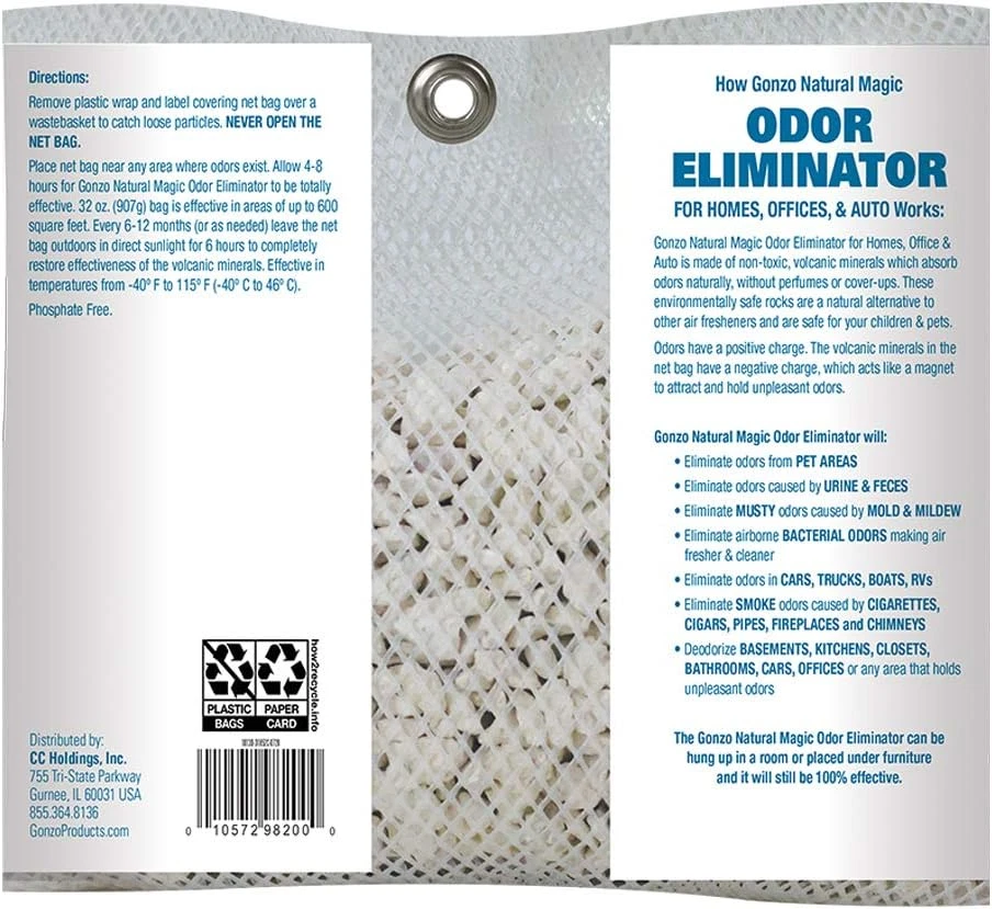 Revive - Non-toxic odor eliminator is fragrance-free and keeps spaces smelling fresh, naturally. Effective - Safe and natural alternative to other air fresheners and safe to use around kids & pets. Long-Lasting - Recharge every 6-12 months to restore volcanic minerals & eliminate odors for up to two years. Recommended - Kitchen, basement, bathroom, bedroom, car, office, garage, locker room, laundry room, attic, crawlspace, etc. Versatile - Eliminates odors from pet areas, garbage cans, smoke odors, shoes, gym bags, sporting equipment, refrigerators, etc. Product Description Here at Gonzo Natural Magic, we design products that help you keep your home free of unwanted odors & stubborn stains while keeping your home smelling strikingly fresh. This one-of-a-kind multi-action formula is rejuvenating, long-lasting & consistently effective. Gonzo Natural Magic Odor Eliminator contains volcanic rocks that are all-natural, fragrance-free, allergen-free, non-toxic mineral rocks that trap and destroy offensive odors, excess moisture & other harmful pollutants. Because odors have a positive charge and volcanic minerals have a negative charge, the Gonzo Natural Magic Odor Eliminator for Homes, Office & Auto naturally acts as a magnet to attract and hold unpleasant odors. This product is a porous structure with millions of microscopic holes that continuously attract and absorb airborne bacterial odors while allowing fresh air to flow through the pores to clean the air around it, delivering a clean & fresh scent in areas of up to 600 square feet. The environmentally safe Gonzo Natural Odor Eliminator will destroy unwanted odors from pet areas, odors caused by urine and feces, musty odors caused by mold and mildew, airborne bacterial odors, odors in cars, trucks, boats, RVs, smoke odors caused by cigarettes, cigars, pipes, fireplaces and chimneys, deodorize basements, kitchens, closets, bathrooms or any area that holds unpleasant odors. The chemical-free, Gonzo Natural Magic All-Natural Volcanic Mineral Odor Eliminator for Homes, Office & Auto can be recharged to freshen air for up to two years. Simply place the bag in direct sunlight for at least 6 hours, every 6-12 months to restore the effectiveness of the volcanic minerals. This is a unique, all-natural & "ready-to-use" product that reveals the fresh smell of a clean home & makes the Gonzo Natural Magic Odor Eliminator an essential for everyday treatment. When life has you in stinky situations, you can count on us to create an environment of clean and odor free air. Eliminate Odors Naturally *Ingredients - Contains Zeolite Rocks Gonzo Odor Eliminator is made of non-toxic, volcanic minerals which absorb odors and moisture naturally, without perfumes or cover-ups. These environmentally safe rocks are a safe and natural alternative to other air fresheners and are safe for your children and pets. *Ingredients - Contains Zeolite Rocks Multiple Areas for Use Gonzo Odor Eliminator will eliminate odors from pet areas, odors caused by urine and feces, musty odors caused by mold and mildew, airborne bacterial odors, odors in cars, trucks, boats, RVs, smoke odors caused by cigarettes, cigars, pipes, fireplaces and chimneys, deodorize basements, kitchens, closets, bathrooms or any area that holds unpleasant odors. Traps Unpleasant Odors and Rechargable Gonzo Odor Eliminator's volcanic rocks are an all-natural mineral. Odors have a positive charge. The volcanic minerals have a negative charge, which acts like a magnet to attract and hold unpleasant odors. Every 6-12 months (or as needed) leave the bag outdoors in the direct sunlight for 6 hours to completely restore the effectiveness of the volcanic mineral.