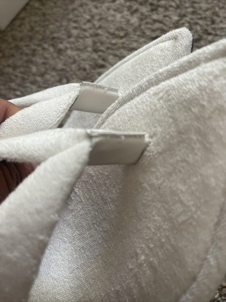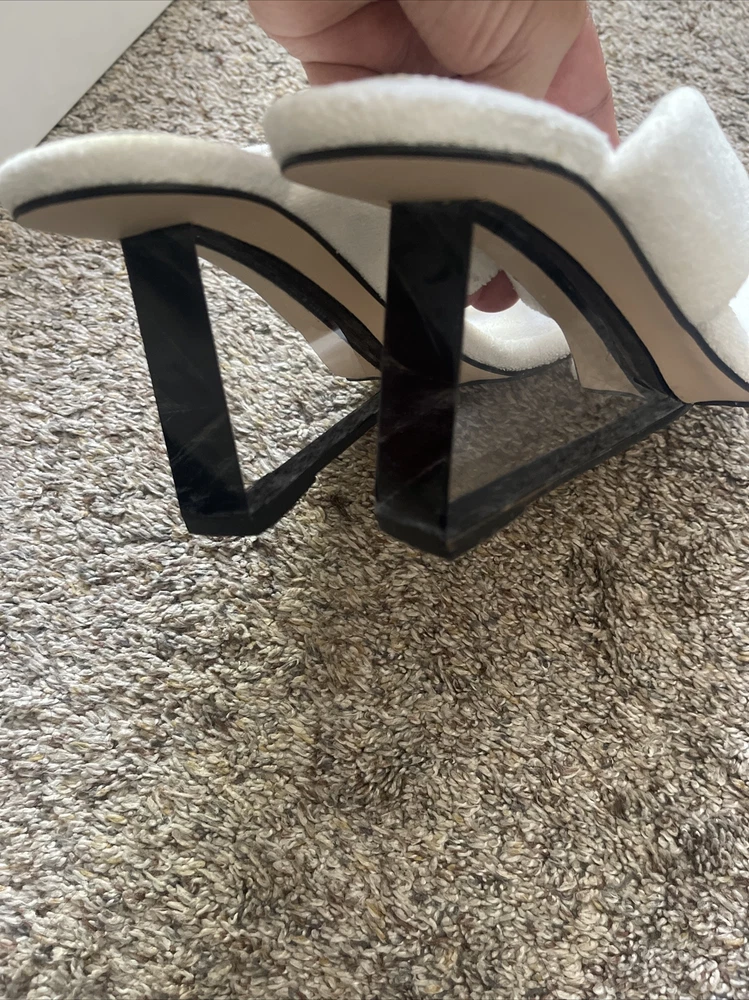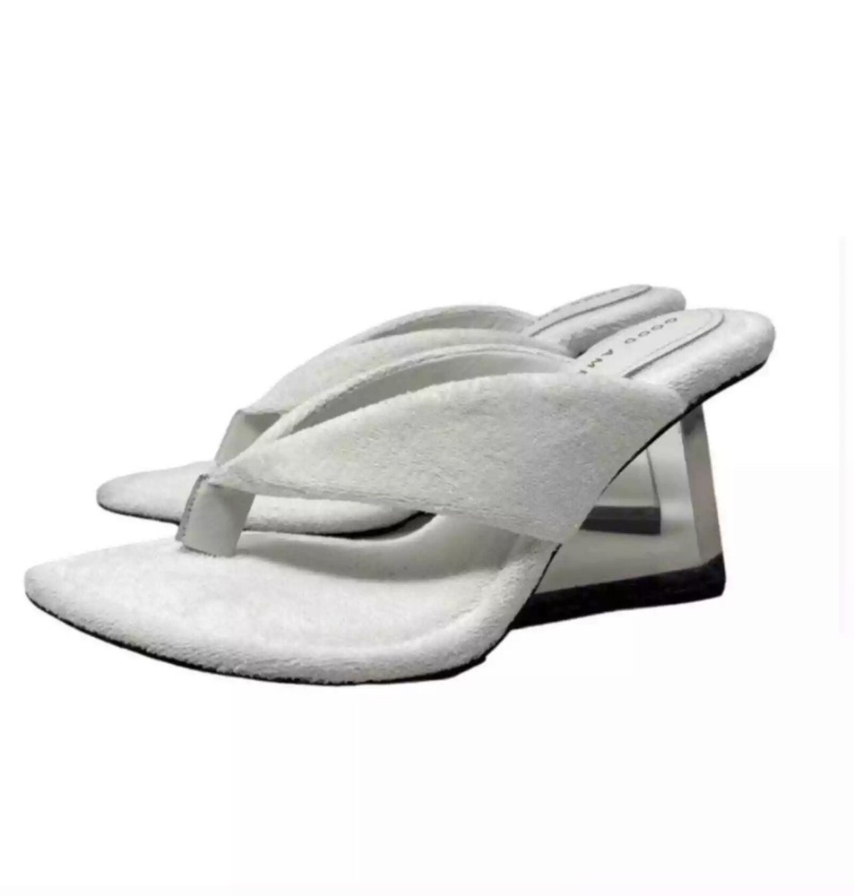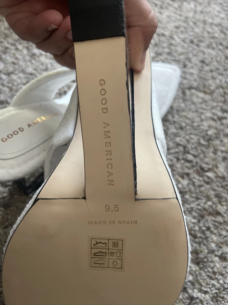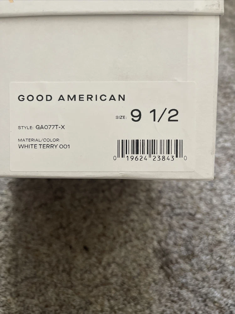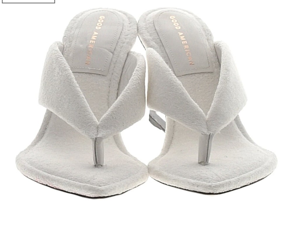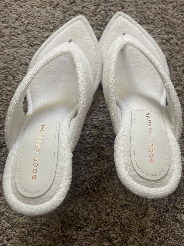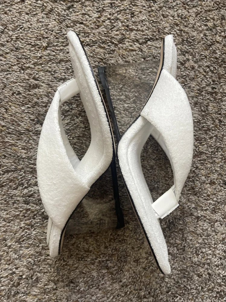 Good American GA077T size US 9 1/2 Cinderella Wedge Glass Heel White Terry Please review all pictures as this is the item you will receive. Please message me with any questions. Thank you SSA