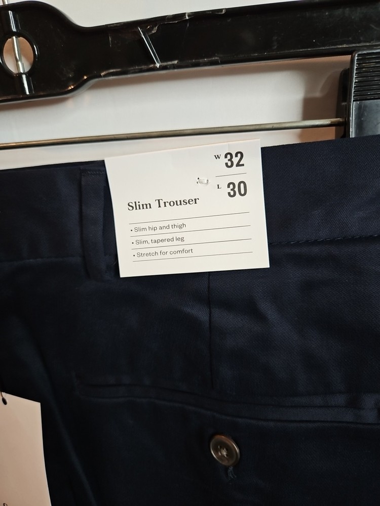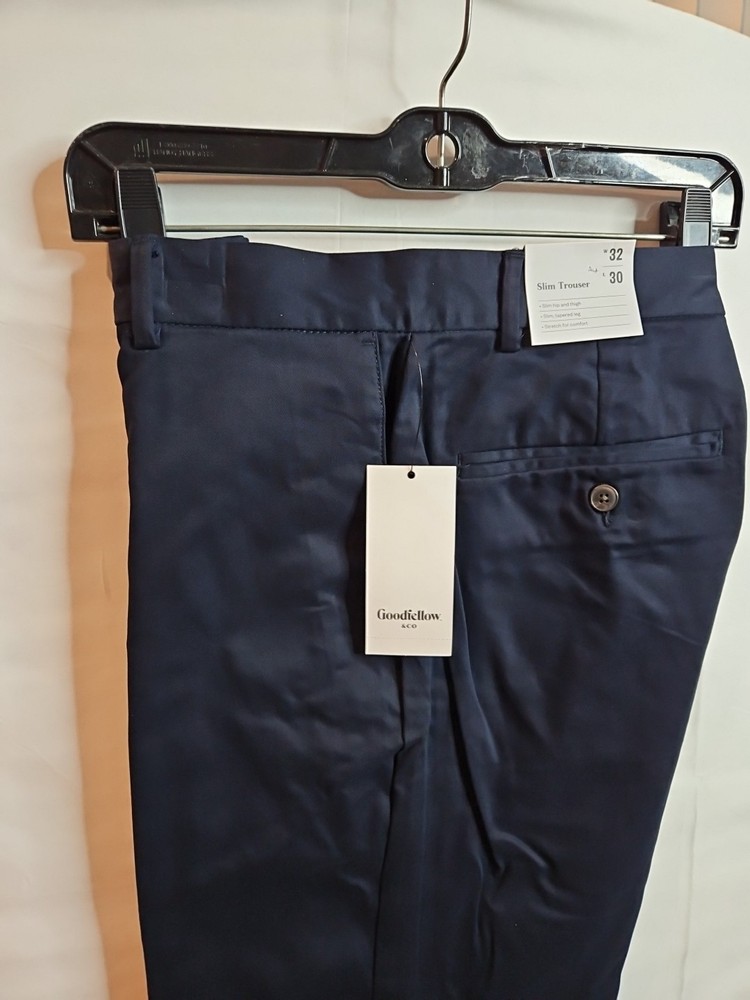 The Goodfellow & Co Men's Size W 32 / L 30 Navy Blue Slim Trousers Pants are versatile and stylish dress pants perfect for various occasions such as workwear, business, or casual wear. Made from a blend of spandex, cotton, and cotton blend materials, these pants offer a slim fit with a flat front and straight leg design. The navy blue color and solid pattern make them easy to pair with different tops and shoes for a polished look. With features like pockets and machine washable care, these trousers are a practical and stylish addition to any man's wardrobe. Smoke and pet free home. Thanks for your interest.