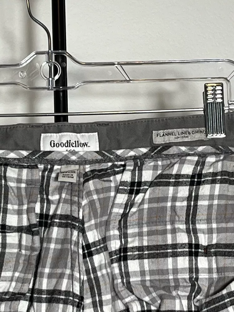 Goodfellow & Co gray chino pants. The pants feature a comfortable and durable cotton fabric with a flannel lining to keep you warm and cozy in colder seasons. Easy-care, windproof, and insulated features make them a reliable choice for any weather. Gently Used. No tears, holes, stains or snags. Shell 90% Cotton 2% Spandex Lining 100% cotton Machine Washable Size: 36 x 30 Measured Flat (across): Waist 18.5 inches Rise 12 inches Inseam 30 inches Thigh 11 inches **Need additional pictures or have questions?? Don't hesitate to message. Take a peek at SweetShine's other listings. Thanks for viewing.