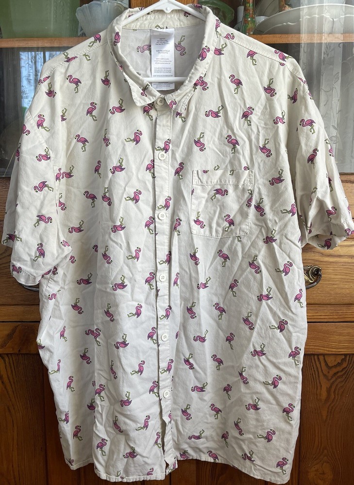 Different brands but measure same, 27 long armpit to armpit and 28 inches long. The first is a navy yellow lemon print shirt Goodfellow xxl. The second is an Isaac Morrison Limited, IML, pink and white(cream) flamingo print shirt, XXL Both excellent condition.