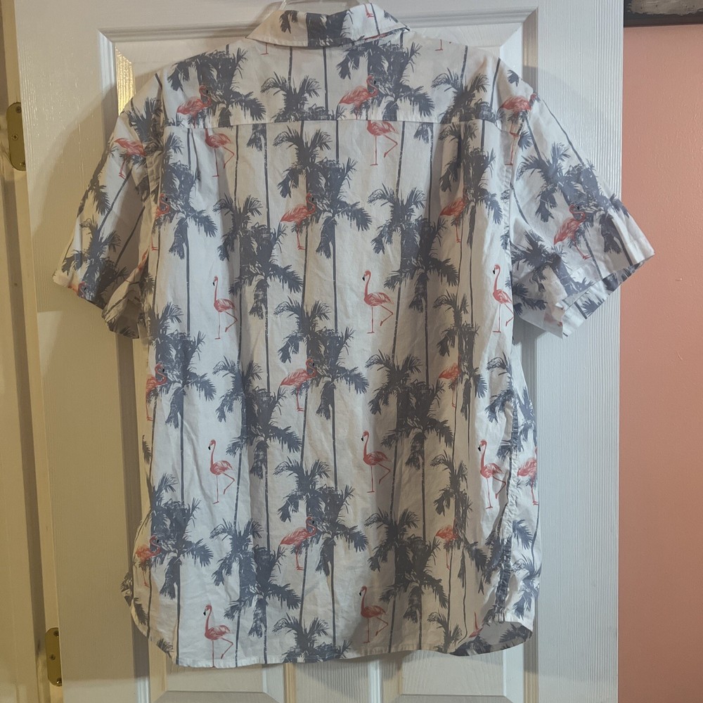 Get ready to make a statement with this Goodfellow men's button-up shirt. The white color and animal print pattern of the shirt will make you stand out in a crowd. The short sleeves and collared neckline make it perfect for both travel and casual occasions. The shirt is made with a regular fit and a point collar style. It features a button closure and is available in size 2XL. The shirt is perfect for men who want to add a touch of fun to their wardrobe. The flamingo theme of the shirt is sure to turn heads.