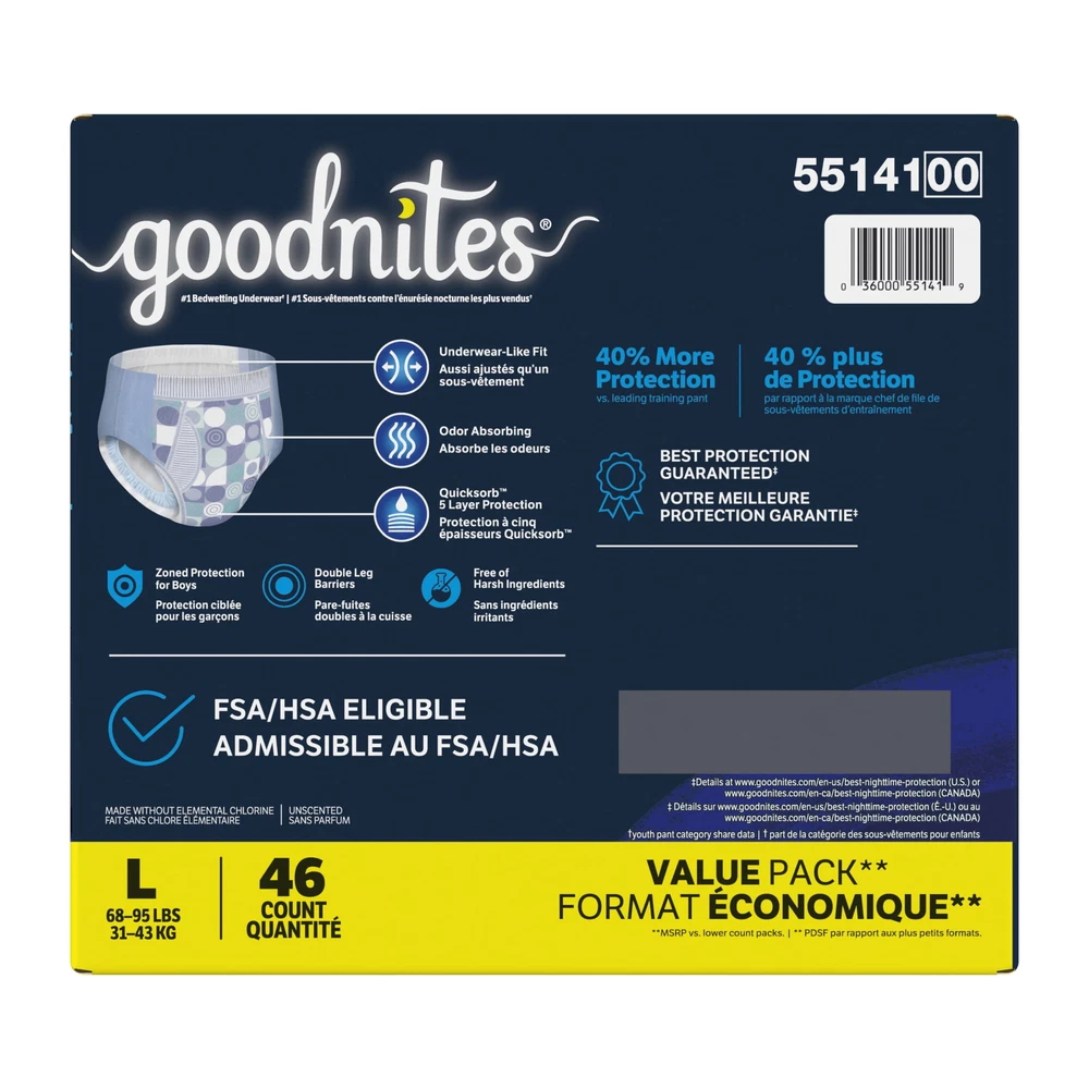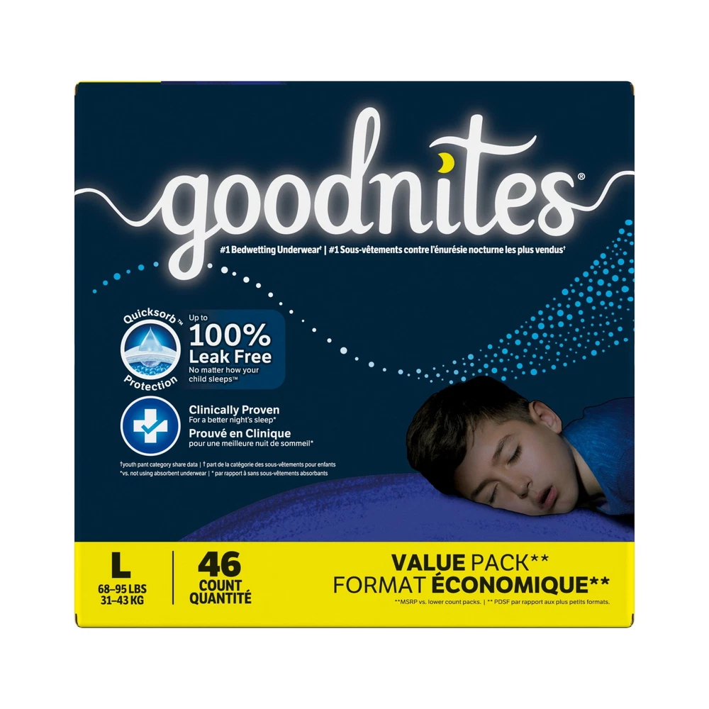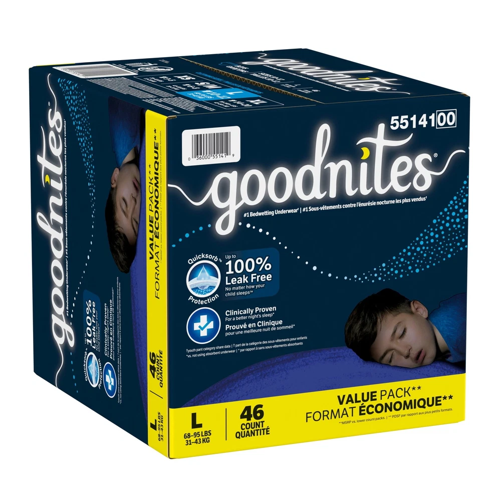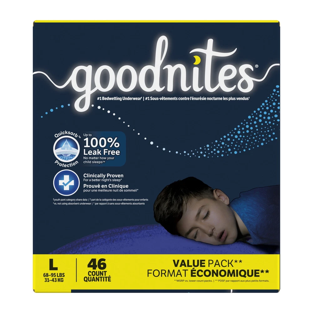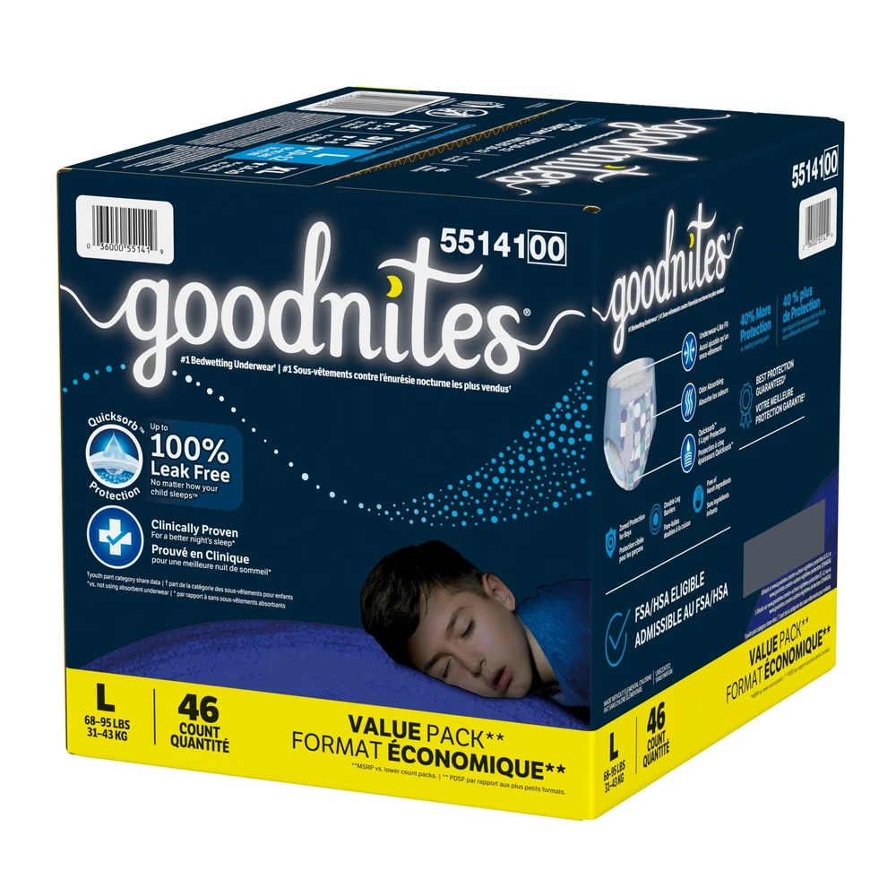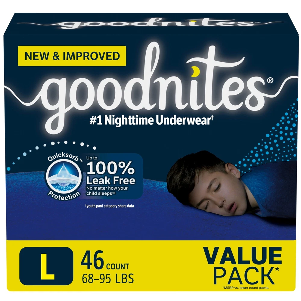 Help your kids wake up every morning feeling awesome with the NEW AND IMPROVED Goodnites Nighttime Bedwetting Underwear, the #1 bedwetting underwear*. For protection where boys need it most, these overnight underwear are made with Quicksorb Protection to provide up to 100% leak-free nights no matter how your child sleeps. Goodnites Boys’ Bedwetting Underwear features a new and improved gap-free fit around the legs*** for comfortable overnight protection. Not only that, but Goodnites Nighttime Underwear for Boys has 35% less leaks**** and holds 3 water bottles**. Unlike potty training pants, Goodnites overnight bedwetting underwear discreetly absorb odor and offer 40% more protection vs. the leading training pant. Plus, these disposable bedwetting underwear are hypoallergenic and are free of added fragrances and elemental chlorine bleaching. Goodnites Boys' Bedwetting Underwear comes with Marvel superhero designs and offer more sizes for a comfortable, tailored fit up to 140+ lbs. Goodnites are available in Size XS (28-43 lbs), Size S/M (43-68 lbs), Size L (68-95 lbs) and Size XL (95-140+ lbs). Goodnites nighttime products are FSA/HSA-eligible in the US. (*Youth Pant category share data) (**Across all offered sizes, among national brands. Three 8 oz. water bottles, 24 oz. total) (***vs. previous Goodnites) (****Boys Large vs. other national brand) On Nov 15, 2024 at 23:46:08 PST, seller added the following information: