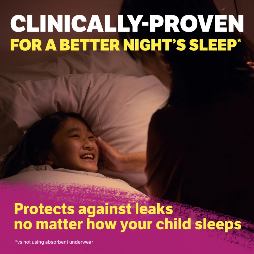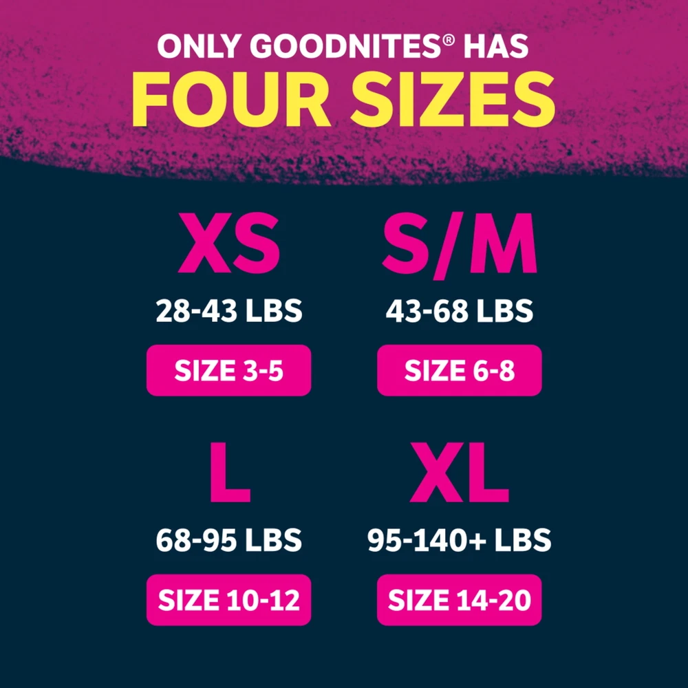 Product details Help your kids wake up every morning feeling awesome with Goodnites Nighttime Bedwetting Underwear, the #1 bedwetting underwear*. For protection where girls need it most, these overnight underwear are made with Quicksorb Protection to provide up to 100% leak-free nights no matter how your child sleeps. Goodnites Girls’ Bedwetting Underwear features a new and improved gap-free fit around the legs*** for comfortable overnight protection. Not only that, but Goodnites Nighttime Underwear for Girls holds 3 water bottles**. Unlike potty training pants, Goodnites overnight bedwetting underwear discreetly absorb odor and offer 40% more protection vs. the leading training pant. Plus, these disposable bedwetting underwear are hypoallergenic and are free of added fragrances and elemental chlorine bleaching. Goodnites Girls' Bedwetting Underwear comes with Disney designs and offer more sizes for a comfortable, tailored fit up to 140+ lbs. Goodnites are available in Size XS (28-43 lbs), Size S/M (43-68 lbs), Size L (68-95 lbs) and Size XL (95-140+ lbs). Goodnites nighttime products are FSA/HSA-eligible in the US. (*Youth Pant category share data) (**Across all offered sizes, among national brands. Three 8 oz. water bottles, 24 oz. total) (***vs. previous Goodnites) On Nov 16, 2024 at 01:02:15 PST, seller added the following information: