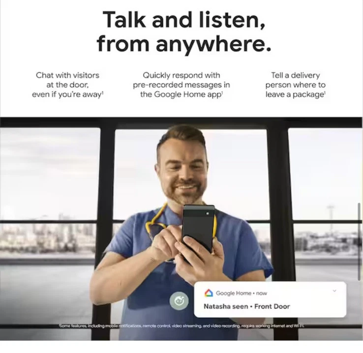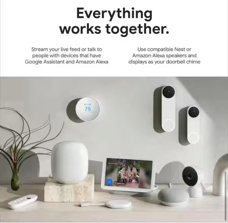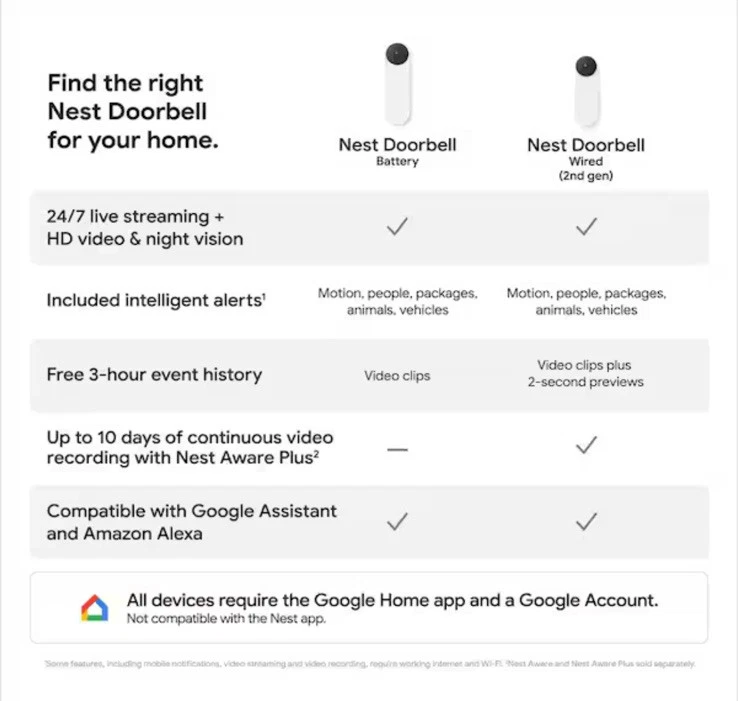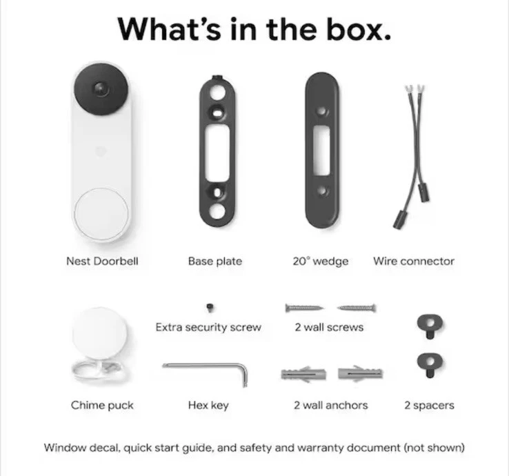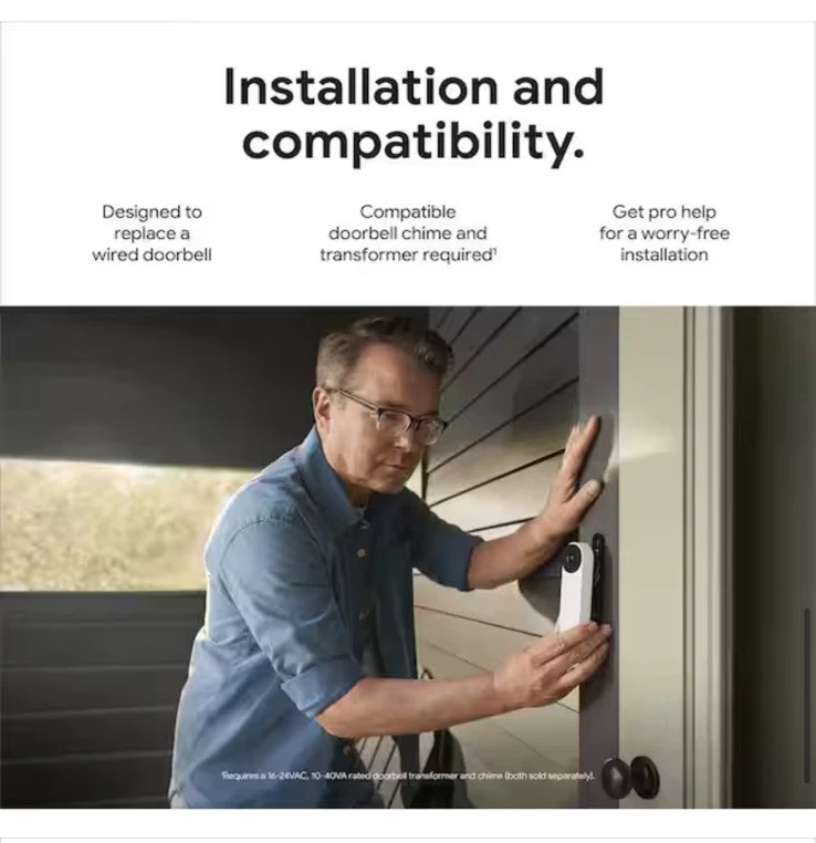 The 2nd-gen wired Nest Doorbell is always on, so you can know what's happening at your front door around the clock [1]. Get intelligent alerts about people, packages, and animals, and 3 hours of event video history - no subscription required. Add up to 10 days of continuous recording with Nest Aware Plus [2]. And set up and manage your video doorbell easily using the Google Home app [3]. Includes intelligent alerts, which can tell the difference between a person, package, animal, and vehicle. Get peace of mind knowing you can check in 24/7 without having to recharge batteries [1] HDR helps you see details in sunlight or shadows, while night vision helps you see in the dark. A taller, enhanced camera view lets you see people head to toe and packages left on the ground as close as 8 inches from your door. Quickly respond to someone at your door with pre-recorded messages like "Just a sec, we'll be right there," or "You can just leave it. Thanks!" [1] If Wi-Fi goes out, the Nest Doorbell automatically records events for up to an hour. When it's back online, you can see exactly what you missed. Chat through the doorbell to let friends know you'll be right there. Or tell a delivery person where to leave a package. Set up and manage your Nest Doorbell using the Google Home app [1]; You can also view the live video feed at home.google.com. Doorbell works with compatible doorbell transformers; Requires a 16-24VAC, 10-40VA rated doorbell transformer and chime (both sold separately); May require replacing existing hardware Disclaimers: 1. Some features, including mobile notifications, remote control, video streaming, and video recording, require working internet and Wi-Fi 2. Continuous video recording requires a Nest Aware Plus subscription 3. To learn more, visit g.co/nest/cam-mem Product Information Internet # 322549632 Model # GA03695-US E66