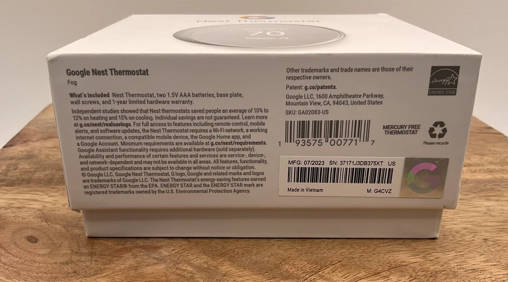 The Google Nest Thermostat G4CVZ in Fog color is a programmable thermostat with smart home compatibility for Google Home/Assistant and Amazon Alexa. It features Bluetooth and Wi-Fi connectivity, a 2.4-inch display, and can be controlled via an app. This thermostat is wall-mounted, round in shape, and compatible with various heating systems such as oil, radiant, heat pump, electric, and more. It is a 2023 model in open box condition, never used. No booklet. See pictures as part of description.