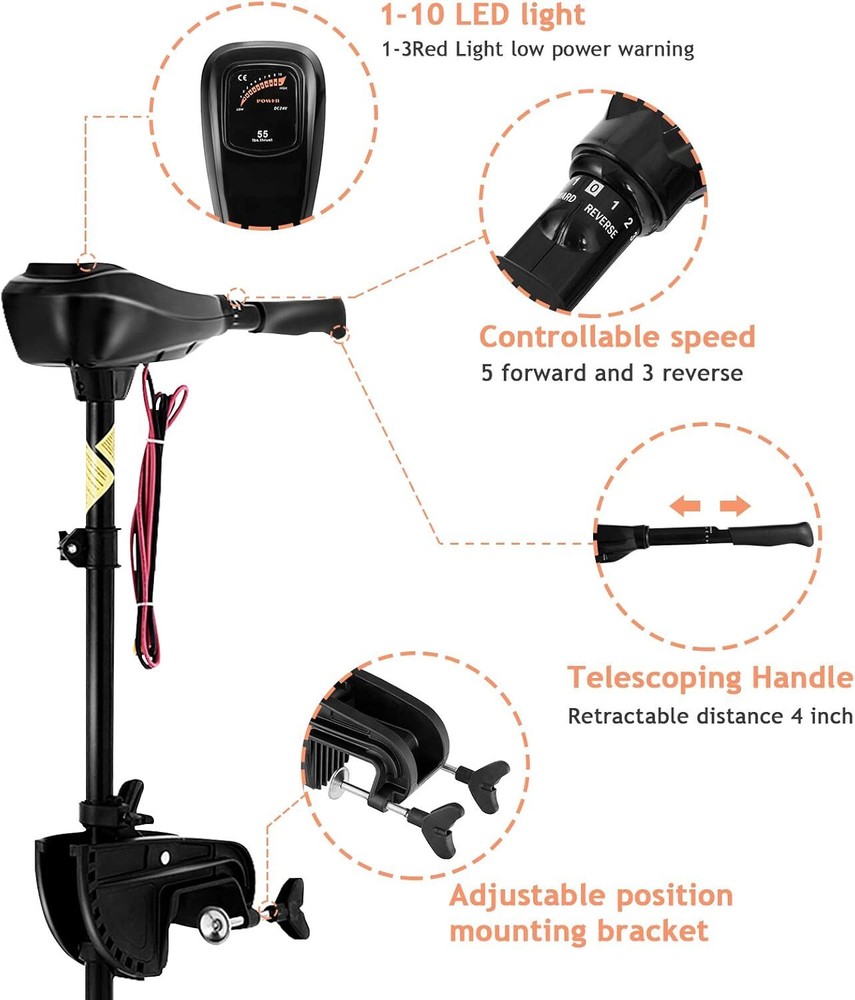 Goplus Electric Trolling Motor 8 Speed, Boat Fishing Motor w/Telescoping Handle, Two-bladed Propeller, LED Battery Indicator and 36" Shaft for Freshwater Saltwater Use Item Description About this item 【Powerful & Quiet Trolling Motor】The 46/55/86LBS pound thrust to this electric trolling motor gives you a lot of power to push the boat with strong force to generate a wake off and on for several hours before requiring a charge. And even at the full speed, the motor can run very quietly. 【Forward & Reverse Speed Adjustments】The 8 speed control system (5 forward speeds and 3 reverse speeds) allows you to fully control the motor through the dial on the ergonomic telescopic handle, so as to achieve a smooth, highly adjustable ride. The reverse speed will let you get rid of any jams! 【Sturdy Built for Salty or Fresh Water Use】Made of glass fiber composite rods, durable die-cast aluminum heads and reinforced composite materials, it can resist bending, warping and damage, and is very suitable for use in fresh water and salt water. When trapped in heavy weeds, it will trip the fuse before it blows to prevent burning the motor. 【Adjustable Shaft for Easy Maneuver】The adjustable shaft allows for proper depth placement in different water conditions. Together with the mounting bracket tilt mechanism, you can set it to desired height and angle to comfortably steer by sitting or standing, so that you don’t have to bend over from your pedestal seat to operate it. 【Portable Design with LED Battery Indicator】The transom mount trolling boat motor is powerful and easy to operate. The battery light on this motor is also a big advantage in helping you know when it's either time to go in and recharge, or take out a second battery. › See more product details You can plug or press the knob to adjust the shaft angle to meet your surfing deamnd. And you can freely reset the normal position to slow down. You can adjust the depth of propeller by moving the position of the clamp to speed up or decelerate and meet your different moving needs. The handle is telescoping to be longer or shorter according to your various needs and likes. And you can move foward or reverse by adjusting the knob. You can lossen the 2 fixing screws to adjust the positions to meet your different moving demands. And the thread screws are not easy to drop down while the calmp is steady and durable. The light LED lights inform you that how much power is left timely, helping you protect the batteries and lasting for long service time. The solid fixed ring is also adjustable according to the position of the boat clamp, avoiding the clamps moving up and keep it stable with security. Payment We accept payment only through PAYPAL Shipping We ship products worldwide through standard express courier service, it will reach within 7 to 10 days to abroad buyers, we ship the product after recieved clear payment and give full information about shipment to the buyer Return We accept product return within 7 to 21 days from delivery date but product should be in original position and not in damaged condition,the return shipping charges will be buyer responsibility