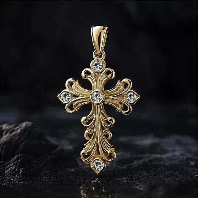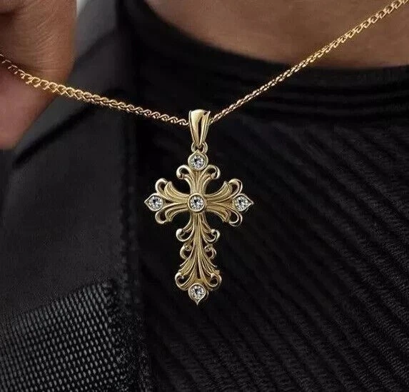 Gorgeous Cross Charm Pendant Round Simulated Diamond In 14K Yellow Gold Plated