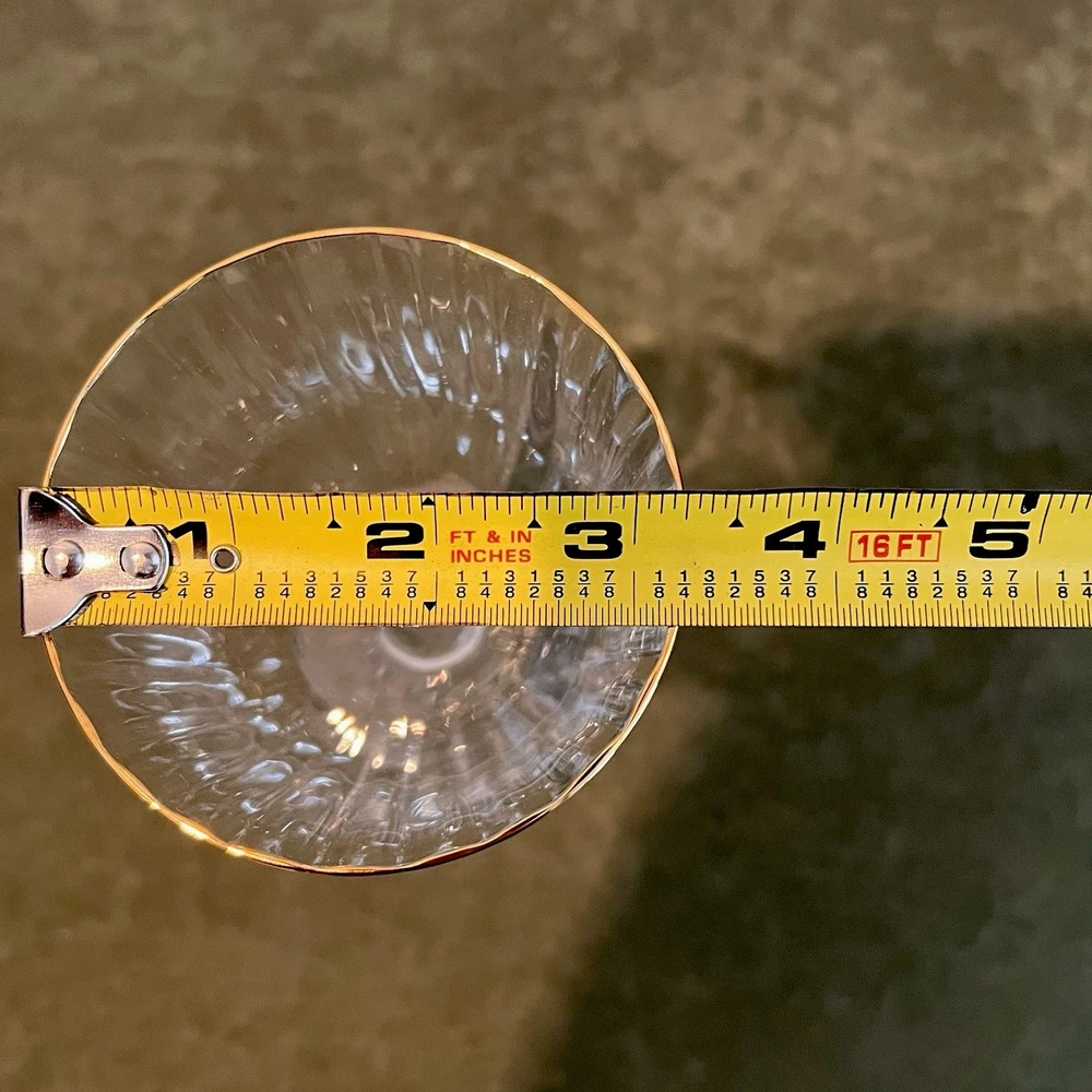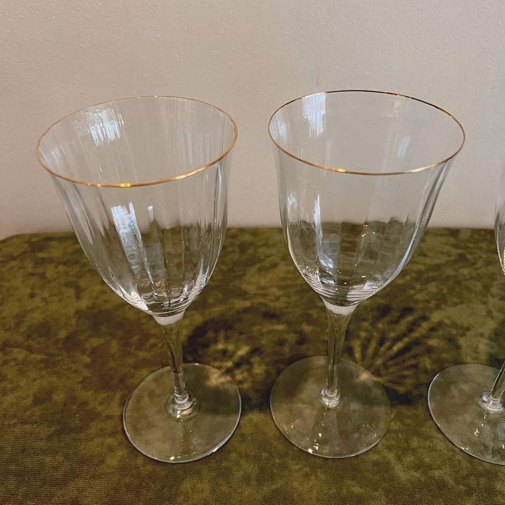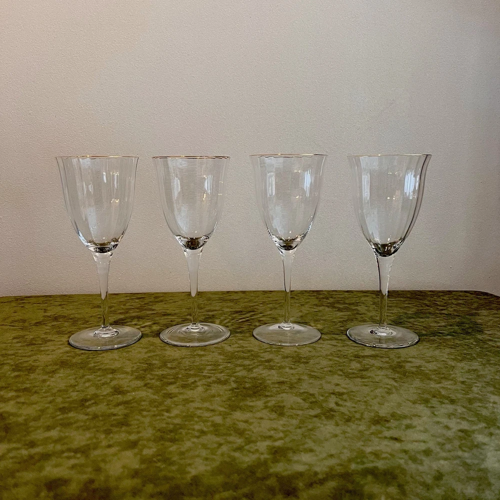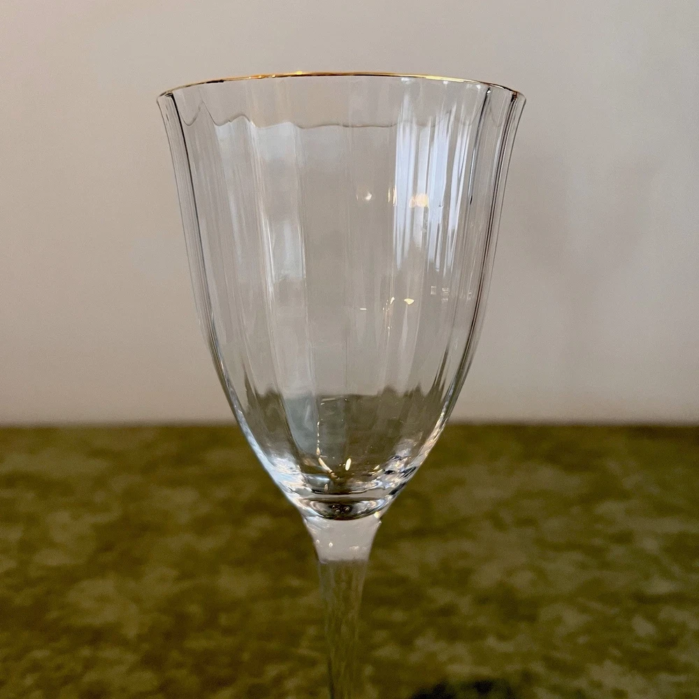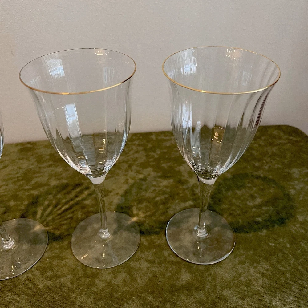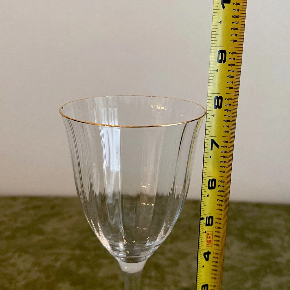 This Gorham wine glass set includes four 7 3/4" red wine glasses made of crystal with a gold rim and fluted design. The elegant glasses are perfect for various occasions such as bachelorette parties, anniversaries, birthdays, and more. Each glass measures 3 3/4" in width and is designed for adults to enjoy their favorite red wines in style. The brand Gorham is known for its high-quality glassware, making this set a luxurious addition to any home bar or dining collection.