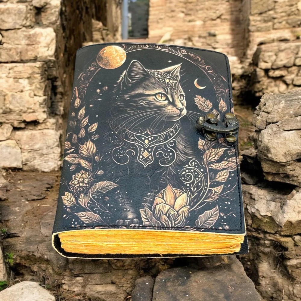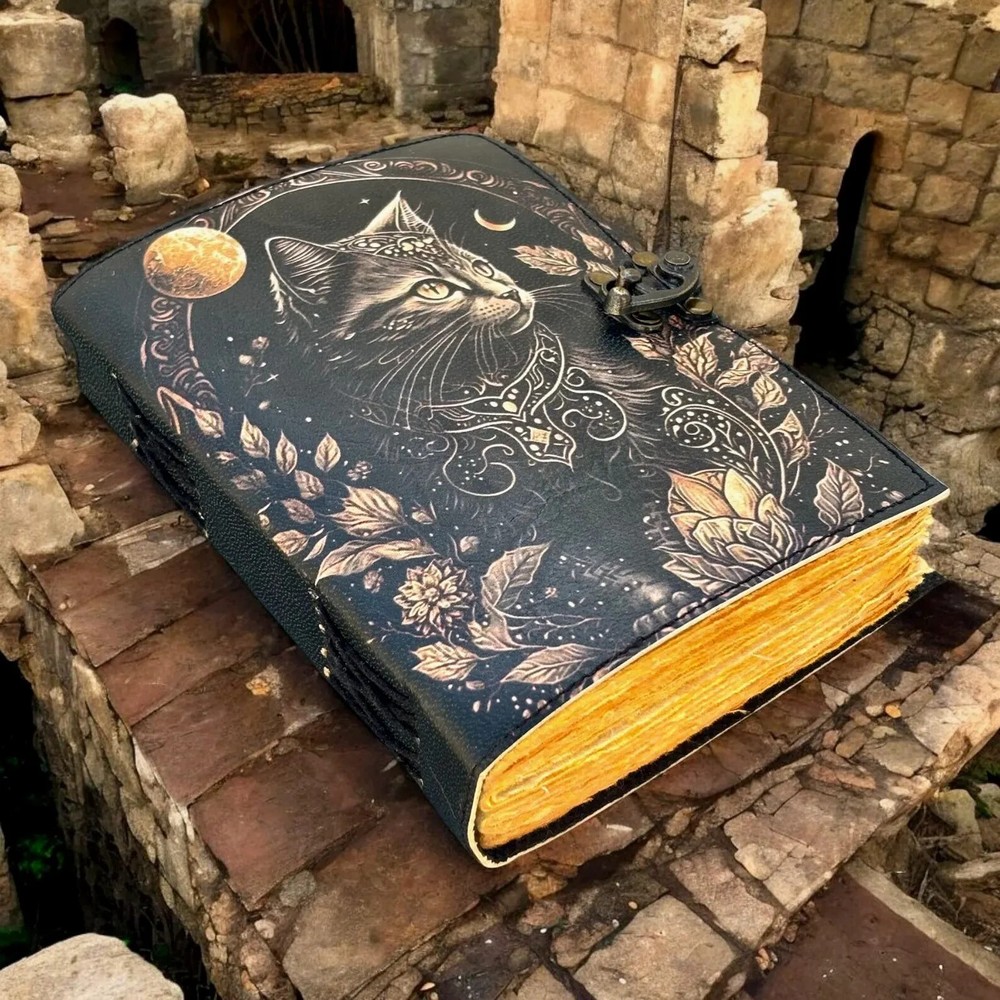 This Leather Journal Gothic Notebook CAT Grimoire Print is a vintage handmade journal with a luxurious and limited edition feel. The journal features a leather cover with unique gothic cat grimoire print, and it is personalized to make it truly special. Handmade in India, this journal is perfect for those who appreciate artisanal and vintage items, making it a unique and special addition to any office or workspace. Cat Journal Notebook by THE UDAIPUR ART Embrace the timeless elegance of The Cat Leather Journal Notebook by THE UDAIPUR ART , a perfect blend of classic craftsmanship and modern functionality. Handcrafted with meticulous attention to detail, this journal features high-quality leather that not only adds a touch of sophistication but also ensures durability for years to come. Key Features: The Phoenix Leather Journal Gothic Notebook - Vintage Handmade Book of Shadows with Name, Personalized Gifts for Men, Dark Academia Gift, Handmade Paper: Each page of The CAT Leather Journal Notebook by THE UDAIPUR ART is made from premium handmade paper, providing a unique texture and a high-quality writing experience. Perfect for writing, sketching, or jotting down your thoughts and ideas. Available in All Sizes: 7x5 inches 8x6 inches 10x7 inches 13x10 inches Whether you need a compact notebook for on-the-go notes or a larger journal for detailed entries and sketches, The Phoenix Leather Journal Notebook by THE UDAIPUR ART is available in all sizes to suit your needs. Secure Brass C-Lock: The journal is equipped with a vintage brass C-lock, ensuring that your thoughts, ideas, and sketches remain secure and private. The elegant lock not only adds a layer of protection but also enhances the overall aesthetic of the journal. Ideal for writers, artists, students, or anyone who appreciates fine craftsmanship, The Phoenix Leather Journal Notebook by THE UDAIPUR ART is more than just a place to write—it's a companion that inspires creativity and captures memories.