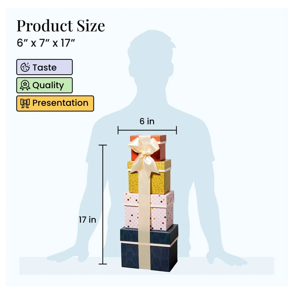 GOURMET GIFT BASKETS: Send joy anywhere with individually wrapped sweets and snacks handcrafted for your recipient. Beautifully packaged, this gift basket is perfect for congratulations, appreciation, thank you, birthday, retirement, or engagement. CUSTOMER FAVORITES: Filled with our bestselling snack assortments with the perfect blend of sweet and savory. Includes chocolate chip cookies, gourmet caramel popcorn, trail mix, soft vanilla caramels, & Himalayan chips. Product Description The Broadway Basketeers Gourmet Gift Tower is stacked to absolute perfection with scrumptious baked goods, candy, & treats – plus pretzels and other savory snacks. Each designer tower assembles into an impressive display for any recipient, delivering on our renowned quality & stunning presentation. Why send a gift box? When you can't be present for an important event or want to show an acquaintance or loved one that you care, we make it simple to select and send delicious food tailored to your recipient, needs, and budget. SPECIAL OCCASIONS: Birthday (such as 16th, 21st, 40th, 50th, 60th, etc The video showcases the product in use. The video guides you through product setup. The video compares multiple products. The video shows the product being unpacked. Check out our other gifts. Add to Cart Add to Cart Add to Cart Add to Cart Add to Cart Add to Cart Customer Reviews 4.4 out of 5 stars 2,873 4.4 out of 5 stars 1,590 4.6 out of 5 stars 2 4.4 out of 5 stars 2,777 4.5 out of 5 stars 1,290 — 4.3 out of 5 stars 416 Price $21.95 $ 21 . 95 $39.96 $ 39 . 96 $44.40 $ 44 . 40 $39.73 $ 39 . 73 $26.00 $ 26 . 00 — $47.41 $ 47 . 41 Container Type 4 Decorative Boxes 6 Decorative Boxes Reusable Tray Tin Basket Wooden Photo Frame Box 5 Decorative Boxes Tin Basket Type of Food Pretzels,Popcorn,Gourmet Candy Pretzels,Popcorn,Gourmet Candy Pretzels,Popcorn,Gourmet Candy Pretzels,Popcorn,Gourmet Candy Pretzels,Popcorn,Gourmet Candy Pretzels,Popcorn,Gourmet Candy Pretzels,Popcorn,Gourmet Candy Certified Kosher ✔ ✔ ✔ ✔ ✔ ✔ ✔ Hand-Assembled in New Jersey ✔ ✔ ✔ ✔ ✔ ✔ ✔ Holiday, Birthday, or Sympathy ✔ ✔ ✔ ✔ ✔ ✔ ✔ Ideal for Men or Women ✔ ✔ ✔ ✔ ✔ ✔ ✔ For Teens, Adults, Seniors ✔ ✔ ✔ ✔ ✔ ✔ ✔ Container Can Be Repurposed ✔ ✔ ✔ ✔ ✔ ✔ ✔ Customer Favorite ✔ ✔ ✔ ✔ ✔ ✔ ✔