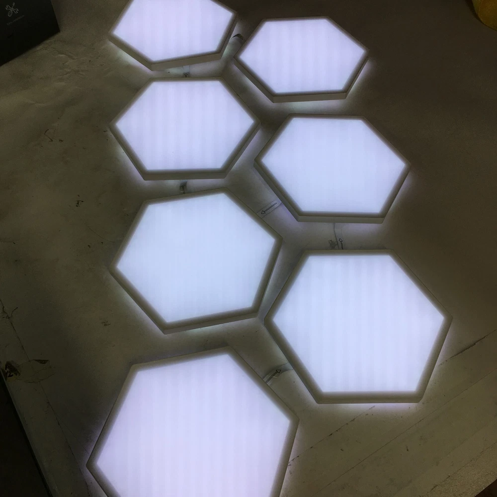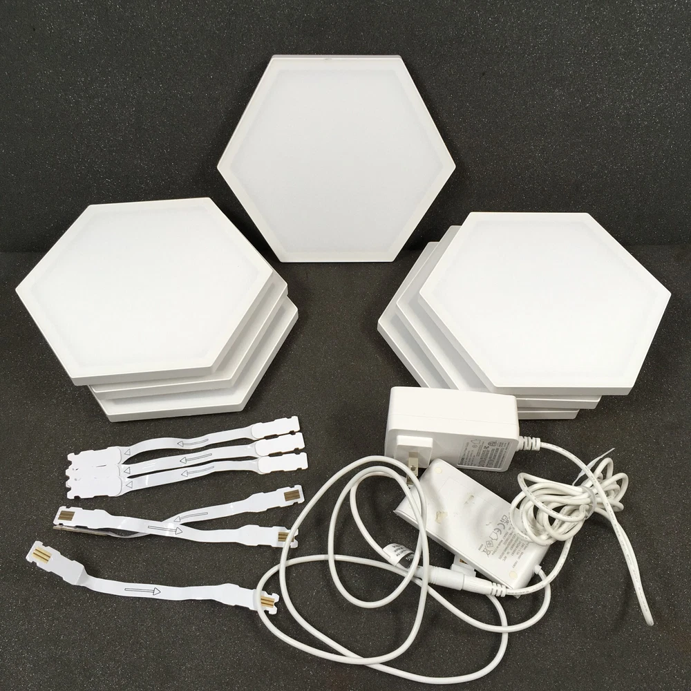 Condition: Used condition. Has scratches, scuffs, etc. Look at the photos what you will get. Tested. Works great! Description: Govee - Hexagon RGBIC Wall Light Panels (7-panels) What's included: Power adapter, Controller, 7 Panels, 6 connectors Only the items shown in pictures will be included. What's not included: Documentation, Mounts and all other accessories. Original box and packaging: No
