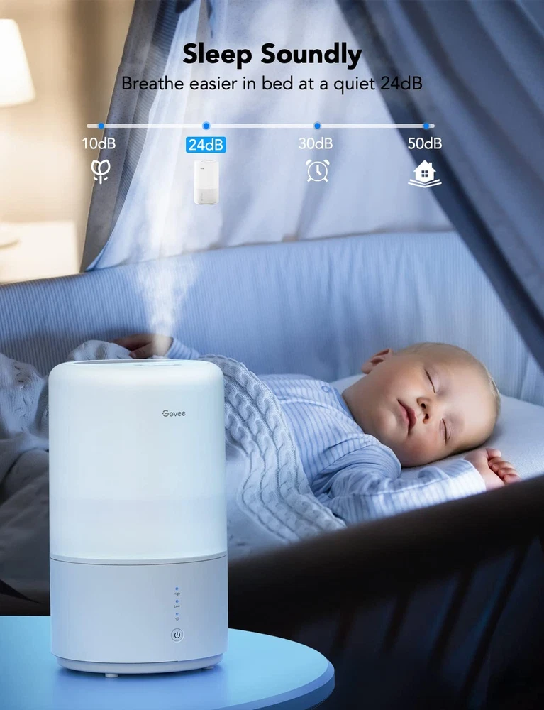 Govee Smart Humidifiers for Bedroom, Top Fill 3L Cool Mist Humidifier, 24 dB Super Quiet, Auto Mode, 30H Runtime, 360°Nozzle with Adjustable Mist Air Humidifier for Large Room, Baby Nursery and Plants Description Features: Humidifying Gets SmarterGovee Smart Air Humidifiers support Govee Home APP or Voice Assistants connection. Easily fully control your humidifier, allowing you to effortlessly customize the cleaning experience to your preferences. Compatible with Alexa, Google Assistant, and IFTTT.(Only Support 2.4G Wi-Fi.) Auto Mode The cool mist humidifiers will turn off at your target humidity, and it will turn back on by itself when it drops below 3% of the target humidity level. Need to connect to a Govee Thermometer Hygrometer to use this function. (Thermo-hygrometer not included)Option to turn off lights, allowing you to sleep comfortably without being affected by light. 30H Non-Stop & Quiet OperationThe baby humidifier with a 3L water tank and up to 30 hours of use, so you don't need to worry about frequent water additions.8 mist Level and up to 200ml/h of ultra-fine cool mist bringing faster moisture to the air in a large room/baby nursery/bedroom. It helps to relieve nasal congestion, cough, and dry skin. The humidifier noise is reduced to 24dB, so you can enjoy a peaceful night's rest. Top-Fill Design & Easy to CleanThe plants humidifiers for bedroom have a water tank design to easily pour water in and out. (Distilled water or purified water is recommended) The bottom design is simple and easy to clean. (We recommend that you clean it every 2 weeks). The 360 nozzle design enables you to customize the direction of the mist, which is more friendly to your plant growth. 2-in-1 Fragrance Therapy HumidifierEquipped with an aroma tray, you can add off your favorite essence when you rest at home to bring a soothing aroma. In addition, Using the App to adjust the custom mode, display off, timers, and schedules, this humidifier can provide you with extra convenience. Product Details: Brand: Govee Special Feature: Voice & App & Touch Control, As Low as 33dB, Auto Mode with Govee Hygrometer Thermometer Color: White Product Dimensions: 6.7"D x 6.7"W x 11.6"H Item Weight: 3.34 Pounds Brand: Govee Special Feature: Voice & App & Touch Control, As Low as 33dB, Auto Mode with Govee Hygrometer Thermometer Color: White Product Dimensions: 6.7"D x 6.7"W x 11.6"H Item Weight: 3.34 Pounds Room Type: Baby,Bedroom,Wifi Model Name: H7141 Voltage: 120 Volts (AC) Wattage: 20 watts UPC: 850030064998 Manufacturer: Govee Item Weight: 3.34 pounds Item model number: H7141 Date First Available: September 30, 2021 Handling We will ship all orders within 3 business days of payment. Delivery We do not ship outside of the Continental US. Feedback We take our reputation seriously, we buy and sell online, so we understand the value of trust. If you are unsatisfied with your order, please contact us and we will work with you to resolve it to your satisfaction.
