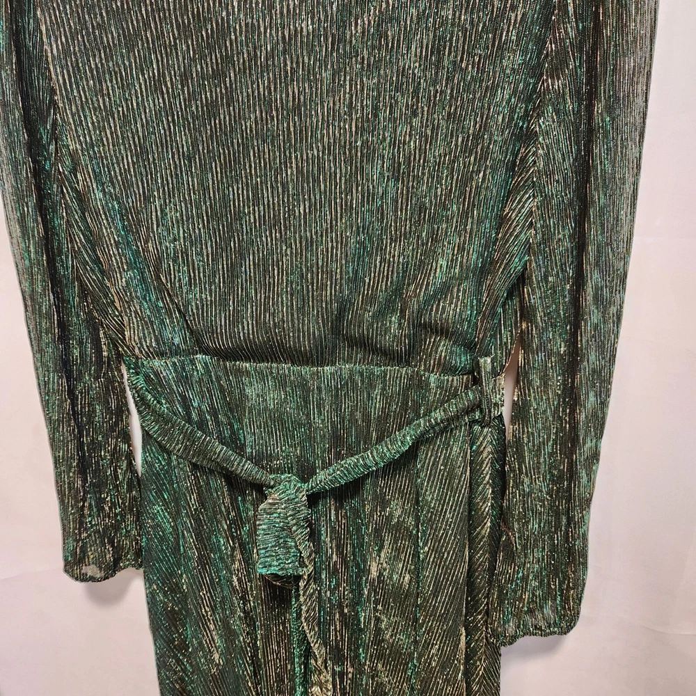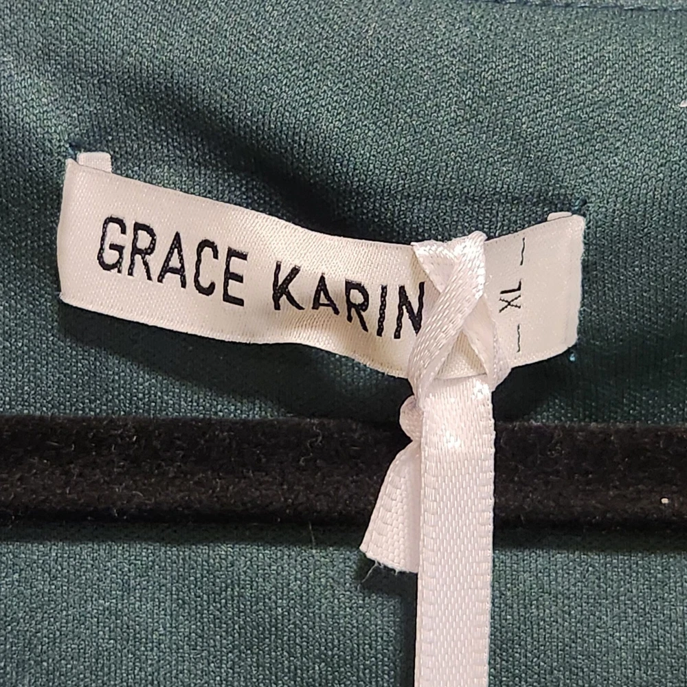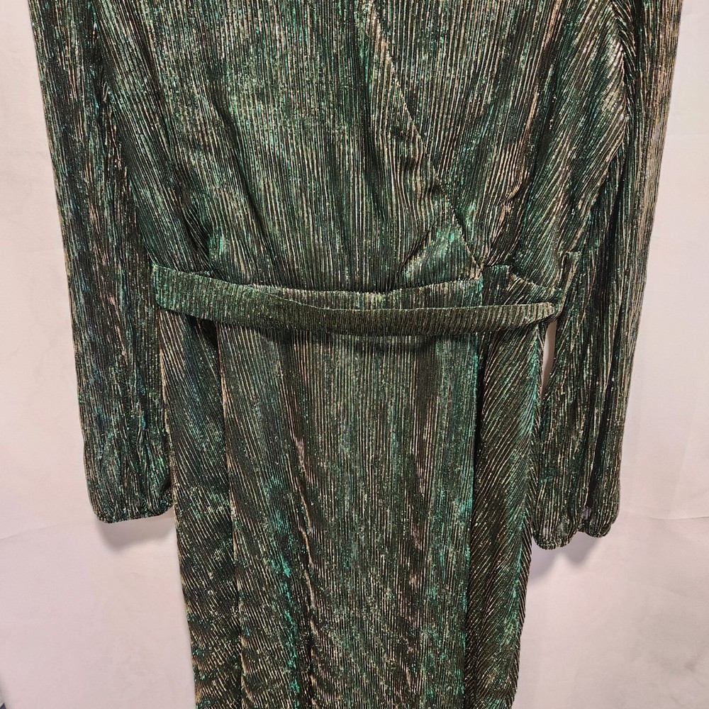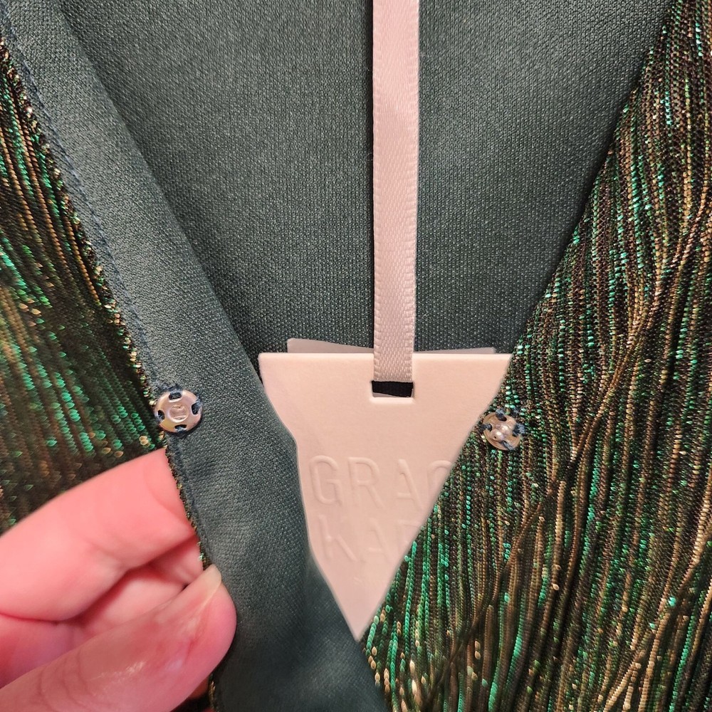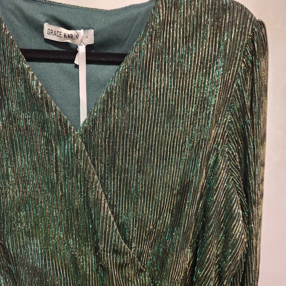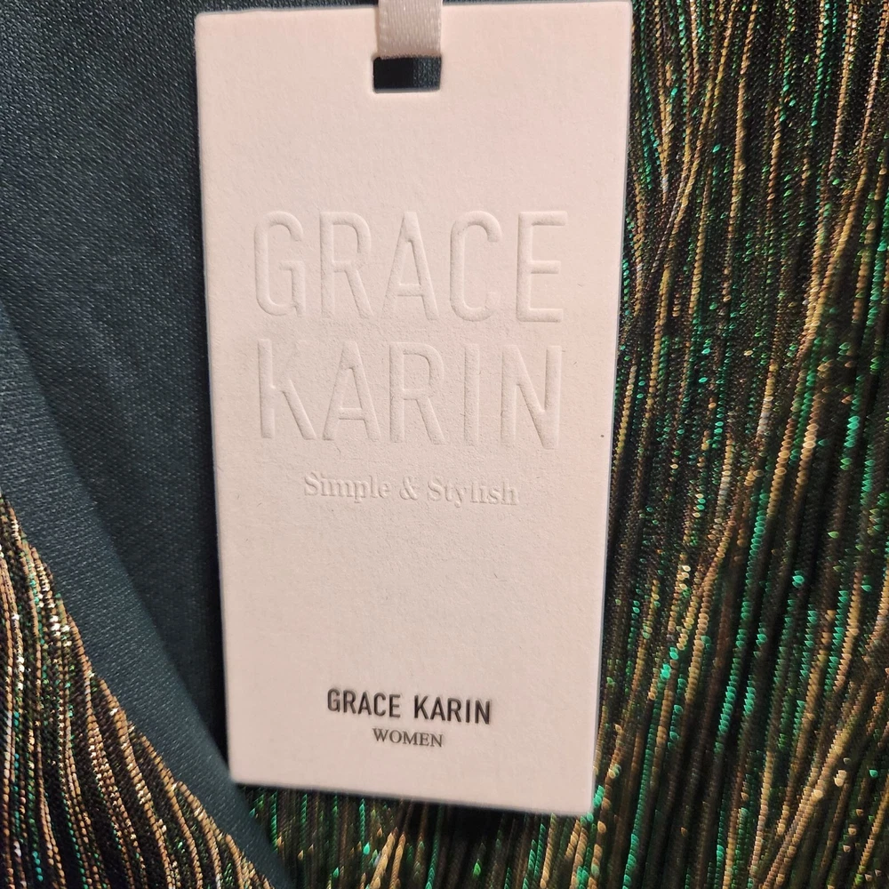 NWT Women's size XL, Grace Karin maxi fashion dress. Green with gold stripe foil, a crossed V-neckline with snap for closure, and long sheer sleeves. The dress is lined with an green lining and has a matching belt. Polyester and viscose, made in China, machine washable. Measurements are approximate: Pit to pit - 21" Shoulder to shoulder - 16" Sleeve length - 25.5" Overall length - 45" Washed per label instructions, stored in a smoke-free and pet friendly environment. Thanks for looking! All orders ship within two business days, reasonable offers accepted.