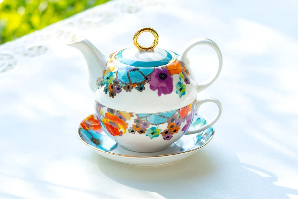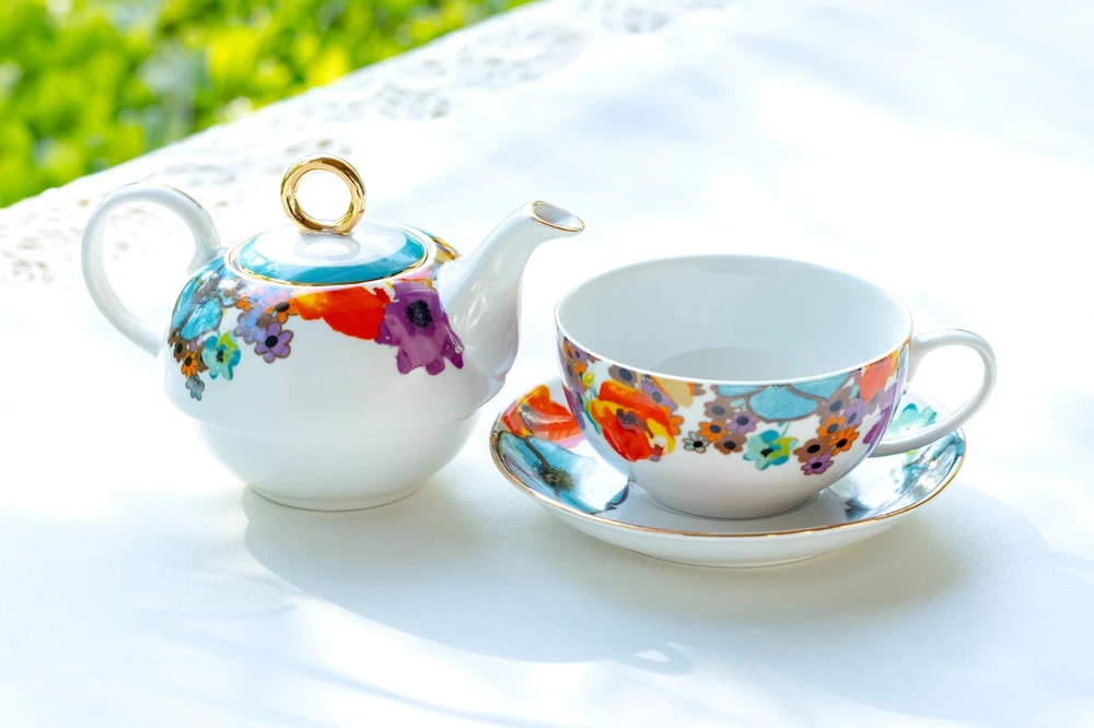 Each one set includes - 1 teapot, 1 cup with 1 saucer Specifications Teapot Dimension: 3.75” Height x 6.5" Width x 4.5” Depth Capacity - 12oz Cup Dimension: 2.5” Height x 5.4” Width x 4.4” Depth Capacity - 10oz Saucer Diameter: 5.85" Material Porcelain Care Advice Dishwasher Safe Hand wash recommended Not microwave safe due to gold trim