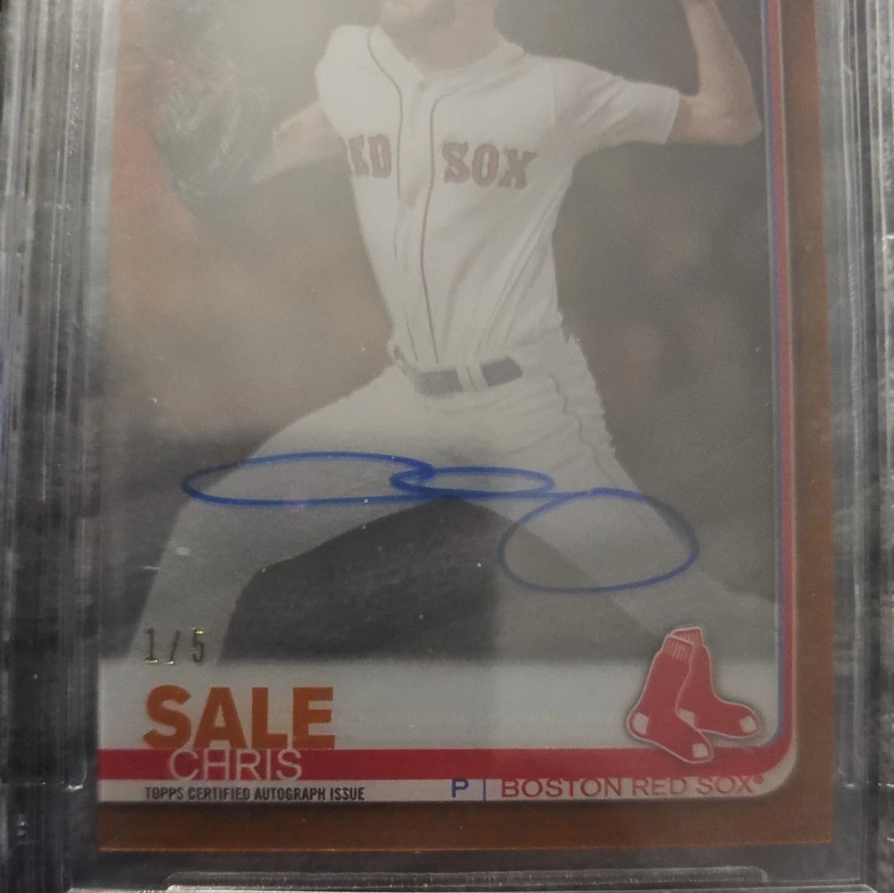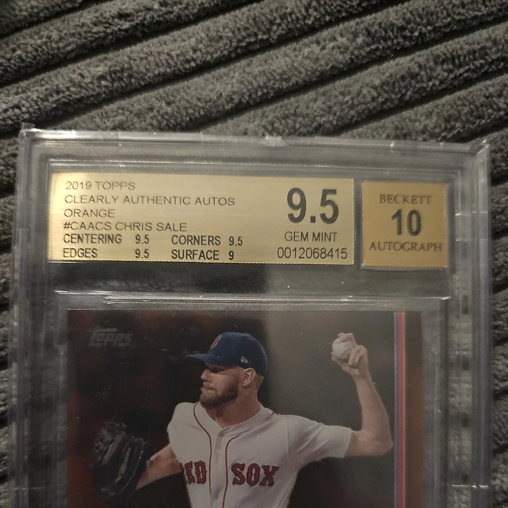 This 2019 Topps Clearly Authentic sports trading card features Chris Sale, a Boston Red Sox player. The card is autographed and has a print run of /5, making it a rare find for collectors. It is also graded 9.5 by Beckett Grading Services (BGS) and comes with an orange parallel/variety. The card is an original from the manufacturer, Topps, and has a serial number. It is part of the 2019 Topps Clearly Authentic set and is a must-have for any baseball card collector. Don't miss out on the opportunity to add this unique card to your collection! Gem Mint 9.5 Beckett Autograph 10 Rare/5
