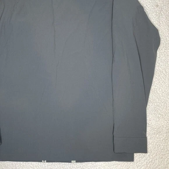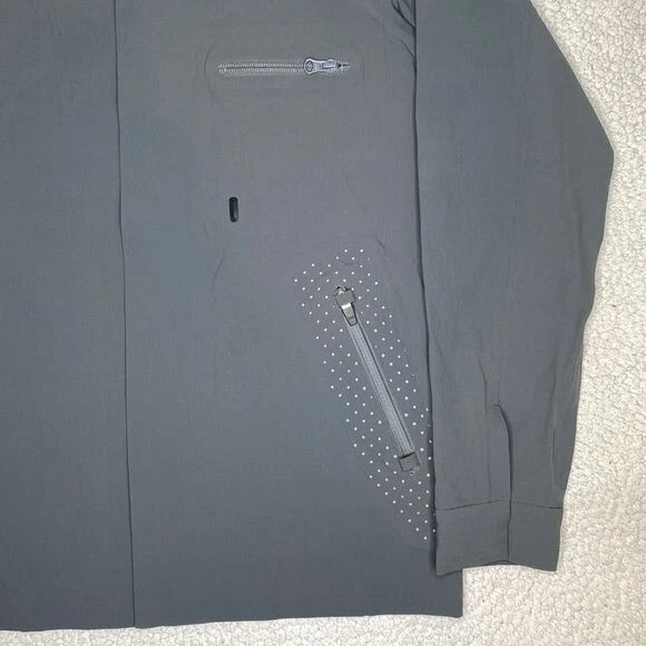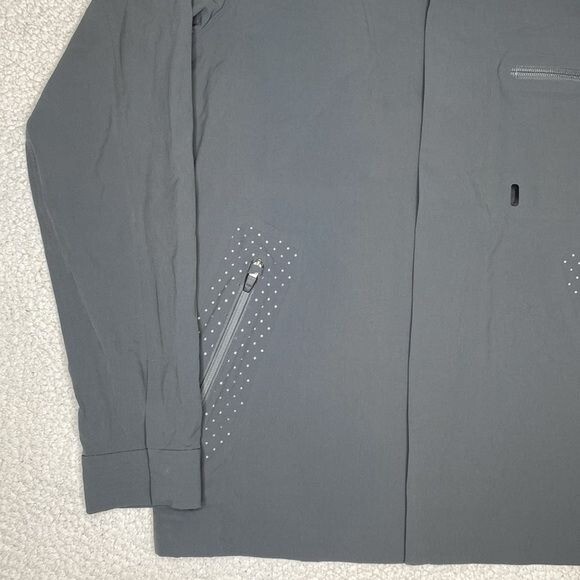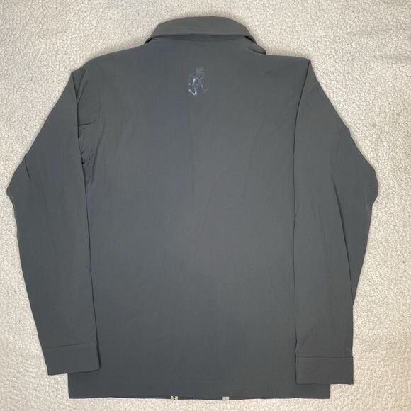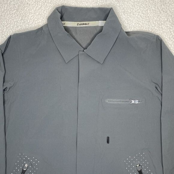 Great condition This grey Gramicci Pertex stretch technical jacket features a classic point collar, concealed press stud fastening, zip chest pocket, zipped side pockets with reflective detailing, long sleeves with concealed buttoned cuffs, logo to the back neck and interior woven logo tape trim Style: GCJK19F086 Length: 28” P2P: 20”