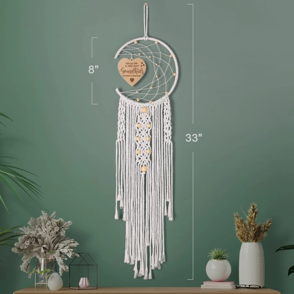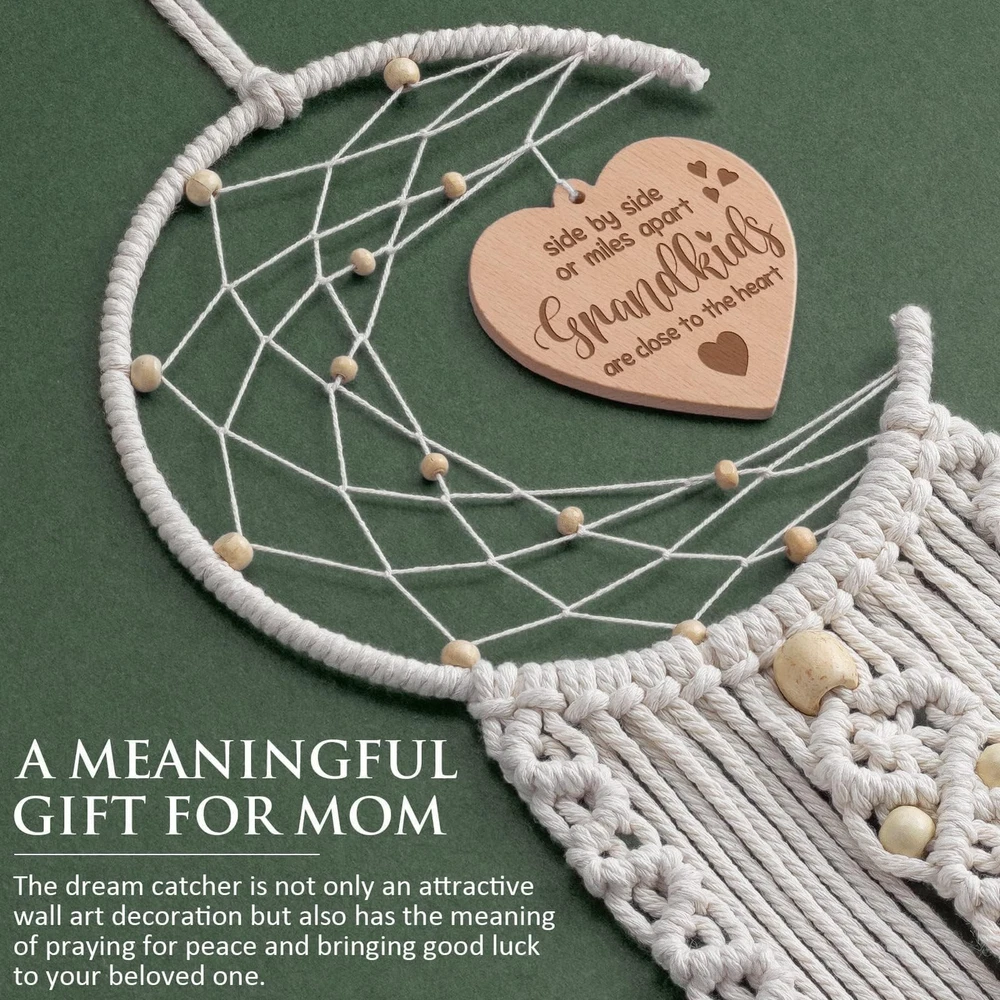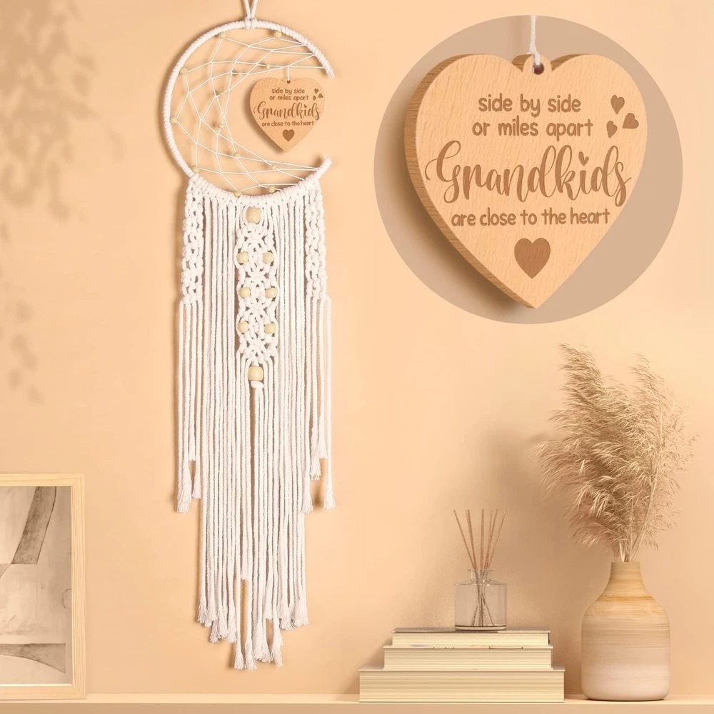 Grandma Valentines Gift, Valentines Day Decoration Gift for Grandma from Granddaughter Grandson Grandkids, Dream Catcher with Heart Pendant Birthday Gift for Grandmother Nana, Boho Home Decor Product Details Size: Grandkids Are Close To The Heart Brand: Trabuono MPN: HK-BMWL-ZH001-01 UPC: Does not apply EAN: Does not apply Package Dimensions: 9.25 x 8.54 x 0.75 inches Item Weight: 6.4 ounces Department: womens Manufacturer: Trabuono Date First Available: March 3, 2022 Perfect Valentine Gift For Grandma: Heart pendant crafted from beech wood with the touching words "Side by side as miles apart Grandkids are close to the heart", Trabuono grandma moon dream catcher is a great mothers day gifts for grandma nana from grandkids to shows how much you love your grandma nana and represents an unbreakable bond between your souls. A personalized grandmother mothers day gifts birthday gifts to your beloved grandma, nana, granny, mimi, gigi or meme and so on A Meaningful Grandma Valentines Day Gifts : Dream catcher Valentine gifts has the meaning of praying for peace and bringing good luck. Hanging the dream catcher in your grandmas bedroom, It will catch bad dreams and drive away nightmares, bringing your grandma nana with good luck and sweet dreams. A meaningful gifts to show your care and love to your grandma on Christmas, Birthdays, Mother's Day, Thanksgiving Day, Christmas, Valentines Day, anniversary, or as a thoughtful thank you present Wall Art Decor: 100% Handmade macrame work on a half moon, heart or circle shape presents a unique design with a small hanging decoration. It's an attractive wall hanging tapestry decoration and suit for any modern interiors concepts: bohemian, Scandinavian, rustic, contemporary and others. With this macrame wall hanging to your grandma home, not only can add a bohemian vibe to her room but also will warm up her space. It is great for a bedroom, living area, workspace, farmhouse, etc Premium Materials: Top Valentine Gifts for Grandma - Trabuono gifts for grandma from granddaughter grandson dream catcher crafted from 100% natural cotton thread & the heart-shaped board is made of thicken beech wood, which printing is vivid and clear, no cutting words for easy reading. Our dream catchers Grandma gifts from grandchildren are carefully handcrafted to ensure strength & durability and the color will never fade, they can last the whole season and continually be used next year Satisfaction Guarantee: No need to repackage! Elegant gift package make it as gorgeous Valentine gifts for grandma from grandchildren. It's an excellent Christmas home decor, Christmas Party decor, Christmas Eve Decor, New Year Decor. Your grandma will be surprise with this funny Christmas dream cattcher! Our team offers superior customer service, high-quality materials. If you are not satisfied with our moon dream catcher wall decor nana gifts for christmas, feel free to send us your issues