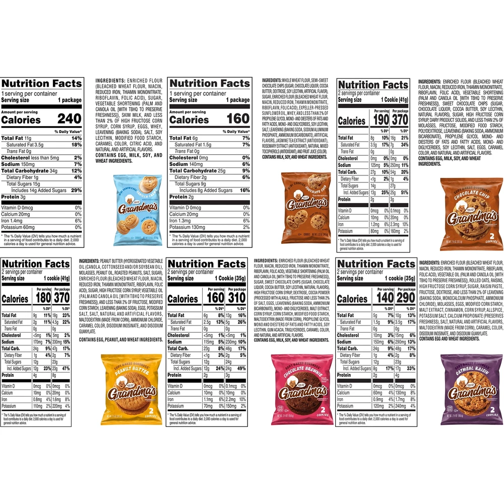 Grandma’s Big Cookie packs include maximum freshness. Enjoy a big, soft, and delicious cookie perfect for lunches, picnics, after school snacks, company gatherings, and more. Grandma’s Cookies are made with a great tasting cookie recipe, baked with love for happiness in every bite. Every Grandma's treat is baked with love to transport you to your happy place and experience a delicious variety of homemade memories with every bite. Includes 30 cookies. Grandma’s Cookies, Oatmeal Raisin, Peanut Butter, Chocolate Chip cookies, Chocolate Brownie, Vanilla Creme Flavor Mini Cookies (30 Pack) Includes 30 packs of Grandma’s Cookies, Oatmeal Raisin (2 count), Peanut Butter (4 count), Chocolate Chip mini cookies (4 count), Chocolate Brownie (6 count), Chocolate chip (6 count) and Vanilla Creme (8 Count) Flavor Cookies Grandma’s Big Cookie packs include 2 cookies per pack for maximum freshness Enjoy a big, soft, and delicious cookie perfect for lunches, picnics, after school snacks, company gatherings, and more Grandma’s Cookies are made with a great tasting cookie recipe, baked with love for happiness in every bite Flavor Descriptions: Grandma’s Peanut Butter Cookies: enjoy the sweet taste of creamy peanuts baked into every delicious cookie. Grandma’s Chocolate Chip Cookies: loaded with chocolate chips and chewy, gooey goodness in every cookie. Grandma’s Oatmeal Raisin Cookies: sweet raisins and chewy oatmeal baked into every delicious cookie. Grandma’s Brownie Cookies: brownie flavored cookie loaded with chocolate chips, chocolatey goodness in every bite For a limited time, packaging may vary. Shelf-stable