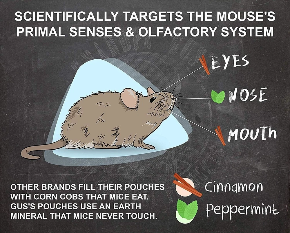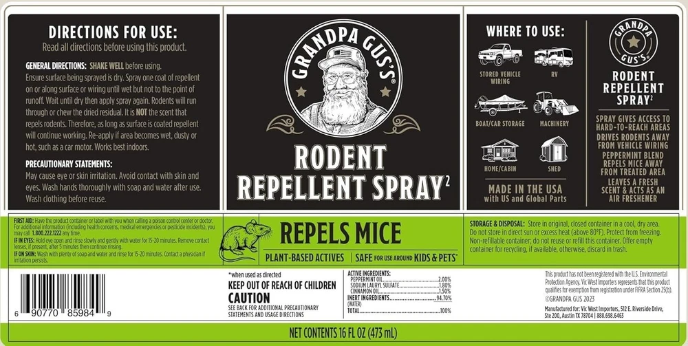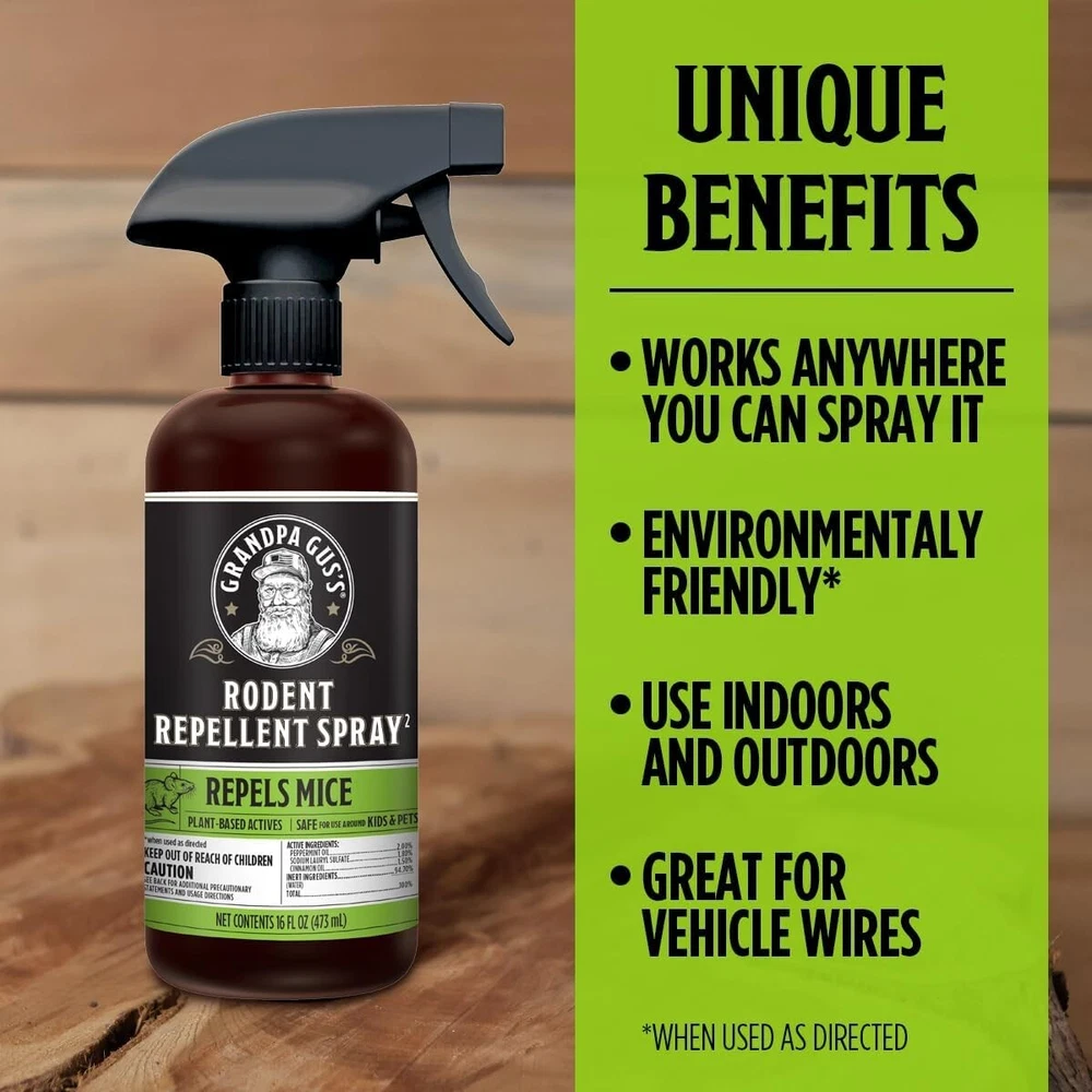 About this item: Extra-strength formula. The hydro-water mix increases the peppermint repellent power and the cinnamon sting prevents mice from chewing. Creates a dry-spray barrier against rodent invasions. It leaves a fresh scent and acts as an air freshener. Works best indoors Deter mouse and rats from chewing on wiring and building nets in your home, shop, RV, machinery, stored vehicles, boat/car storage. The water-based repelling formula spreads faster and leaves no stains. Use it in areas too large or too small for pouches Shake before use. Spray one coat of repellent on or along the dry surface or wiring until wet. Wait until dry and spray again. Rodents will run through and chew the dried residual or get repellent on their paws. Re-apply if area becomes wet, dusty or hot Keep away from children. Store the original, closed container in a cool, dry area, away from direct sun or excess heat. Protect from freezing. Empty the non-refillable container for recycling if available, otherwise discard in trash Grandpa Gus's products are made in the USA and covered by Gus's old-time handshake guarantee