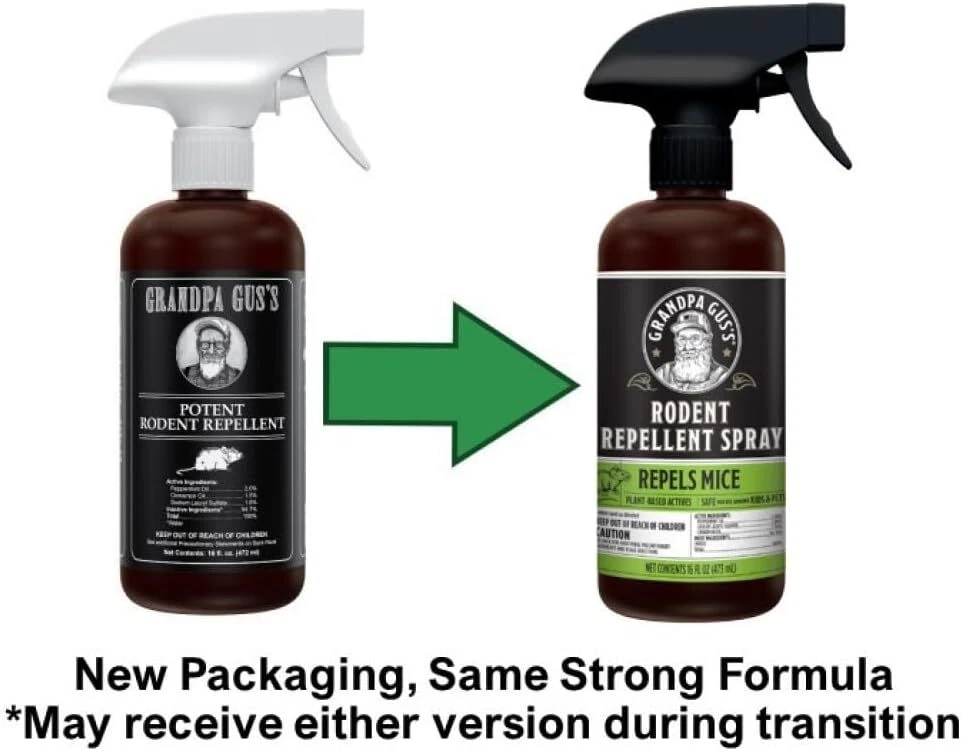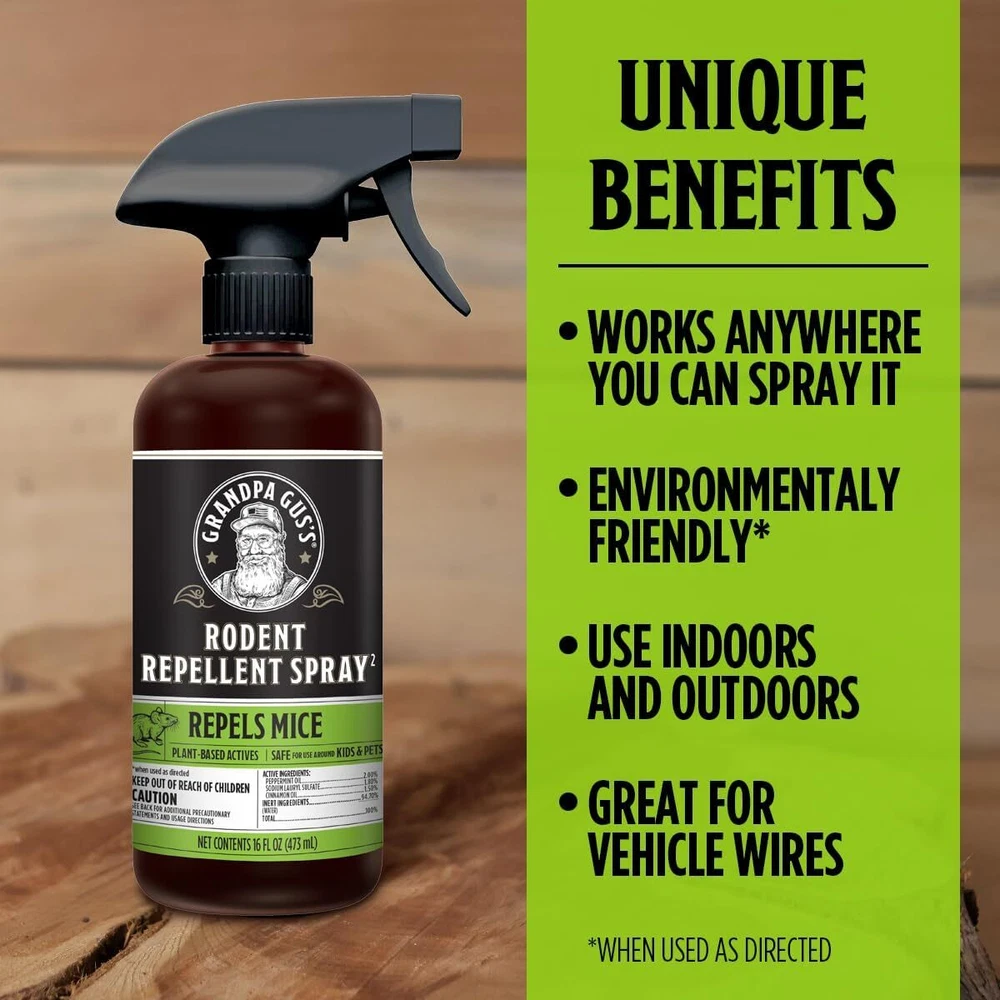 Free eBay listing template designed by dewiso.com Grandpa Gus's Rodent Repellent Spray, Peppermint & Cinnamon Oil, Prevents Mouse/Rats from Nesting & Chewing on Wires, 16 fl oz (Pack of 1) FREE AND FAST SHIPPING! About this item Extra-strength formula. The hydro-water mix increases the peppermint repellent power and the cinnamon sting prevents mice from chewing. Creates a dry-spray barrier against rodent invasions. It leaves a fresh scent and acts as an air freshener. Works best indoors Deter mouse and rats from chewing on wiring and building nets in your home, shop, RV, machinery, stored vehicles, boat/car storage. The water-based repelling formula spreads faster and leaves no stains. Use it in areas too large or too small for pouches Shake before use. Spray one coat of repellent on or along the dry surface or wiring until wet. Wait until dry and spray again. Rodents will run through and chew the dried residual or get repellent on their paws. Re-apply if area becomes wet, dusty or hot Keep away from children. Store the original, closed container in a cool, dry area, away from direct sun or excess heat. Protect from freezing. Empty the non-refillable container for recycling if available, otherwise discard in trash Grandpa Gus's products are made in the USA and covered by Gus's old-time handshake guarantee › Product We offer a 30-Day Return Policy on items which you are not completely satisfied with. You have the option for a full-refund or an exchange of the item. No returns are available on items shipped outside of the US . Shipping We offer Free Shipping to the US and ship within 2 business days of payment, usually sooner. We use UPS express shipping. That's why your products are usually delivered within 3 days . Contact We try our very best to make sure every customer is completely satisfied. If there's a problem , message us! We're happy to help. 24/7 live chat available.