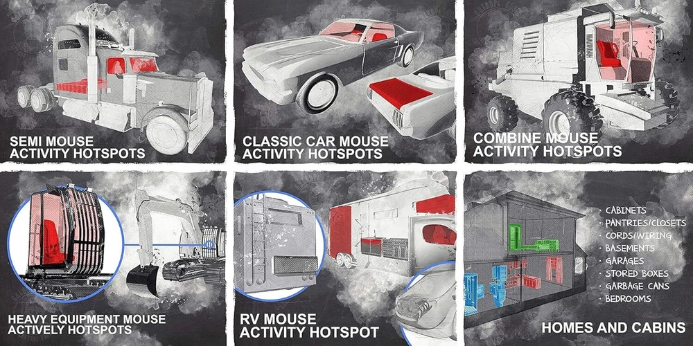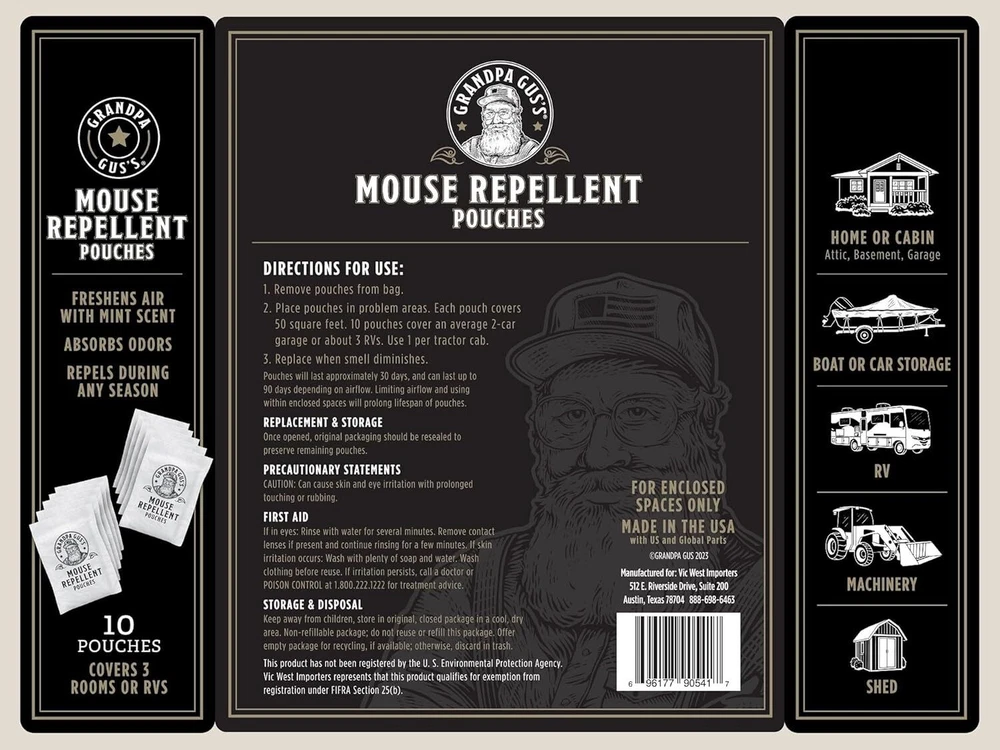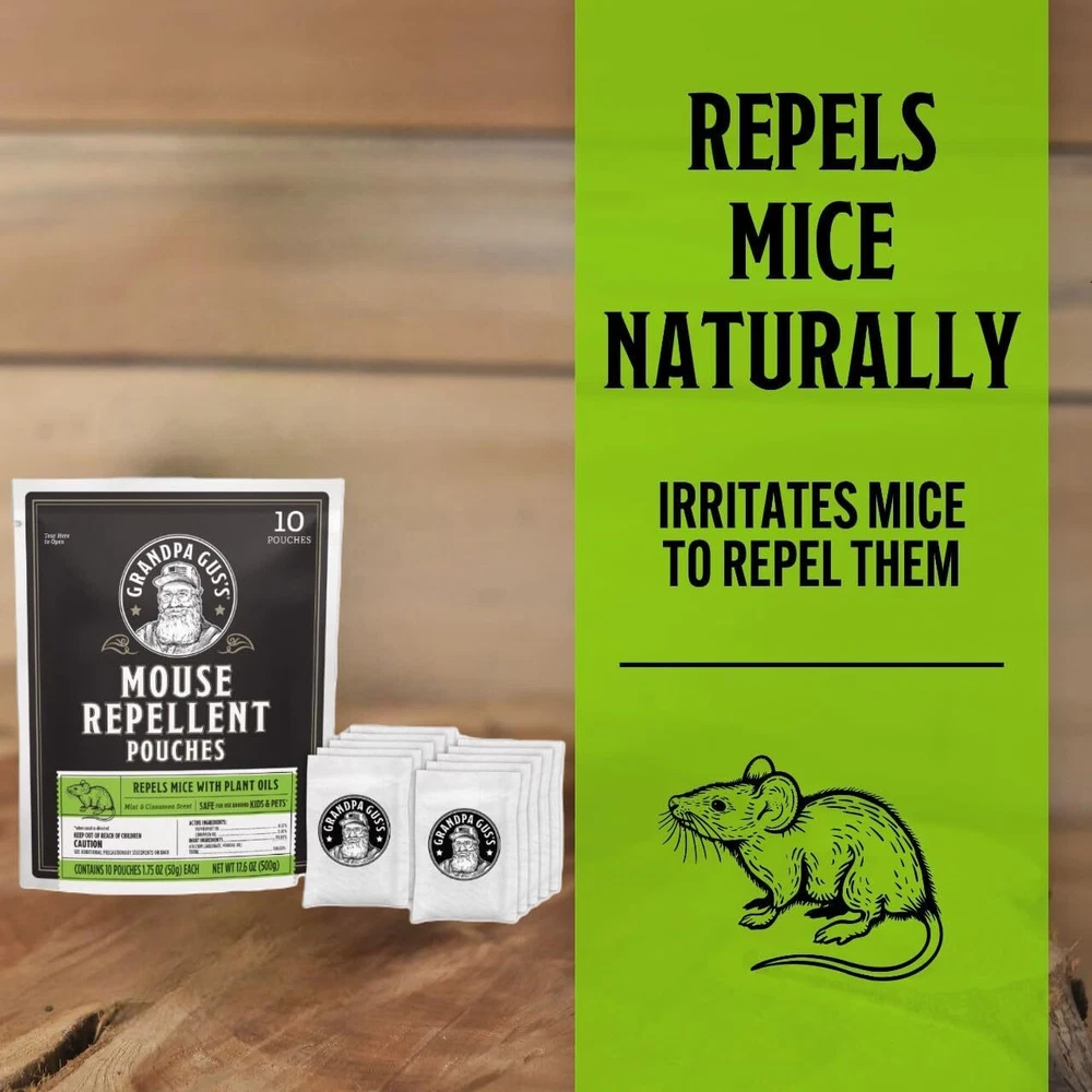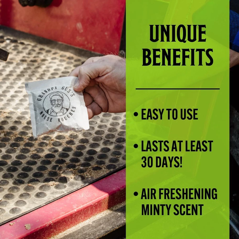 REPEL MICE NATURALLY. Stop mice from invading your home, garage, car, truck or RV through peppermint and cinnamon time-release scent. A hassle-free pest control barrier for any home EFFECTIVE. All natural formula with ingredients from essential oils. Keeps mice out and keep your home and cab fresh. A better pest control solution than harmful poisons or snap traps EASY TO USE. Simply open the resealable bag, place in areas out of wind & air flow and away from bait and go. No mess, no traps to check, no dead rodents to clean or rid off AIR FRESHENER. Leaves vehicles, closets and cabinets smelling minty fresh. No stinky repellent chemicals in your home, just essential oil freshness MADE IN THE USA. Keeps house mice, field mice, deer mice, country mice out of your vehicle or cabinet up to 50 sq ft for 1 - 3 months. Proudly made in the USA Product Description