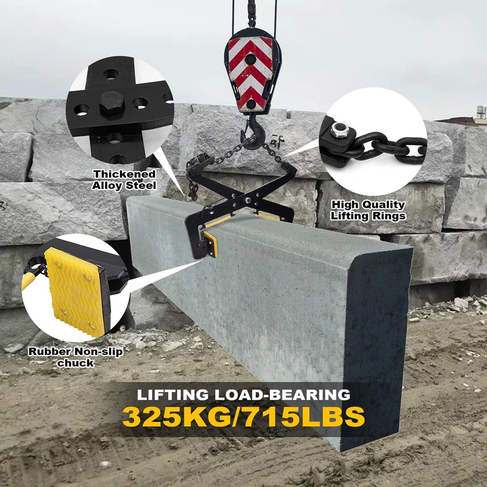 Store category Sign Up Now ! You may also like Product Description Bullet Points: Adjustable Jaw Opening: Equipped with an adjustable jaw opening size of 300-510mm, our granite clamp can accommodate various materials. Its ergonomic design ensures safe and efficient lifting operatings and enables you to quickly adjust the opening size as needed, boosting your productivity Promoted Strength: Crafted from high-quality, thick alloy steel, subjected to high-temperature forging, our granite clamp ensures a longer service life and withstands intense pressure without breaking Effortless Handling: Equipped with a non-slip, rubber chuck that allows for safe and efficient lifting of large prefabricated parts, ensuring a firm grip without damaging the material Safe to Use: With a reinforced self-locking nut and high-strength lifting chain made of manganese steel, our granite clamp ensures stability during lifting, ensuring additional safety and convenience Wide Application Scope: Engineered for stone panels and granite slabs, our granite clamp boasts a wide application range, suitable for lifting concrete blocks with various cranes such as crane trucks, tower cranes, bridge cranes, and mobile cranes. Its seamless operating provides optimal handling for wood materials too Our slab lifter features safe and efficient lifting operations for large prefabricated parts. Its reinforced self-locking nut ensures it will not break or give in under pressure. It allows for easy handling and a practical solution to your lifting needs. Specifications: 17 inches Opening: 30-43cm Lifting capacity: 350KG Self weight: 13KG Color: Black Material: Alloy steel 12 inches Opening: 12-30cm Lifting capacity: 325KG Self weight: 11KG 23 inches Opening: 33-58cm Lifting capacity: 500KG Self weight: 16KG Packing List: 1* Granite Lifting Clamp Notes: 1. Due to different lighting and screen settings, the item color may be slightly different from the picture. 2. Due to different manual measurements, please allow a 1-2cm difference in size. Payment Delivery details Terms of sales About us Feedback & DSRs Payment Before you palce an order, please kindly make sure that you have a paypal account. We accept PAYPAL payment only. Payment should be completed within 2 days after auction closed, or unpaid dispute will be filed for an closing auction. An unpaid case will be filled after 4 days. Delivery details We ship to your eBay address. Each package will be shipped to US by UPS Regular Parcel with tracking number. Please check your shipping address carefully before checkout, it can't be changed if order completed. All items will be shipped within 1-2 business day upon receipt of payment.Orders placed on weekend will be shipped within 3 days. If you do not receive your item in 7-10 business days.please contact us immediately for further assistance. We will be responsible for any damages or losses incurred in the shipping process. About us We maintain high standards of excellence FIVE STAR and strive for 100% customer satisfaction! Positive Feedback is very important to us. We hope that you contact us immediately Before you give us neutral or negative feedback, so that we can satisfactorily address your concerns. We promise to offer the lowest price and high quality produce. Our working time: From Monday to Friday(9:30 am to 18:00pm), we don't working on holidays ,hope you can understand and know that , thank you. Please always talk to us via ebay Message. We appreciate your business and look forward to growing our e-Bay sales with satisfied customers. Feedback Contact us If you have any questions, please feel free to contact with us by ebay Message during our business hours ( 9:30a.m. to 5:30 p.m.), or email us through eBay, we will try our best to help you to resolve it. For any presale or after-sale questions,please do feel free to email us! Due to the time difference, each email will be replied within 1 working day,and weekend will be delayed a bit. Feedback