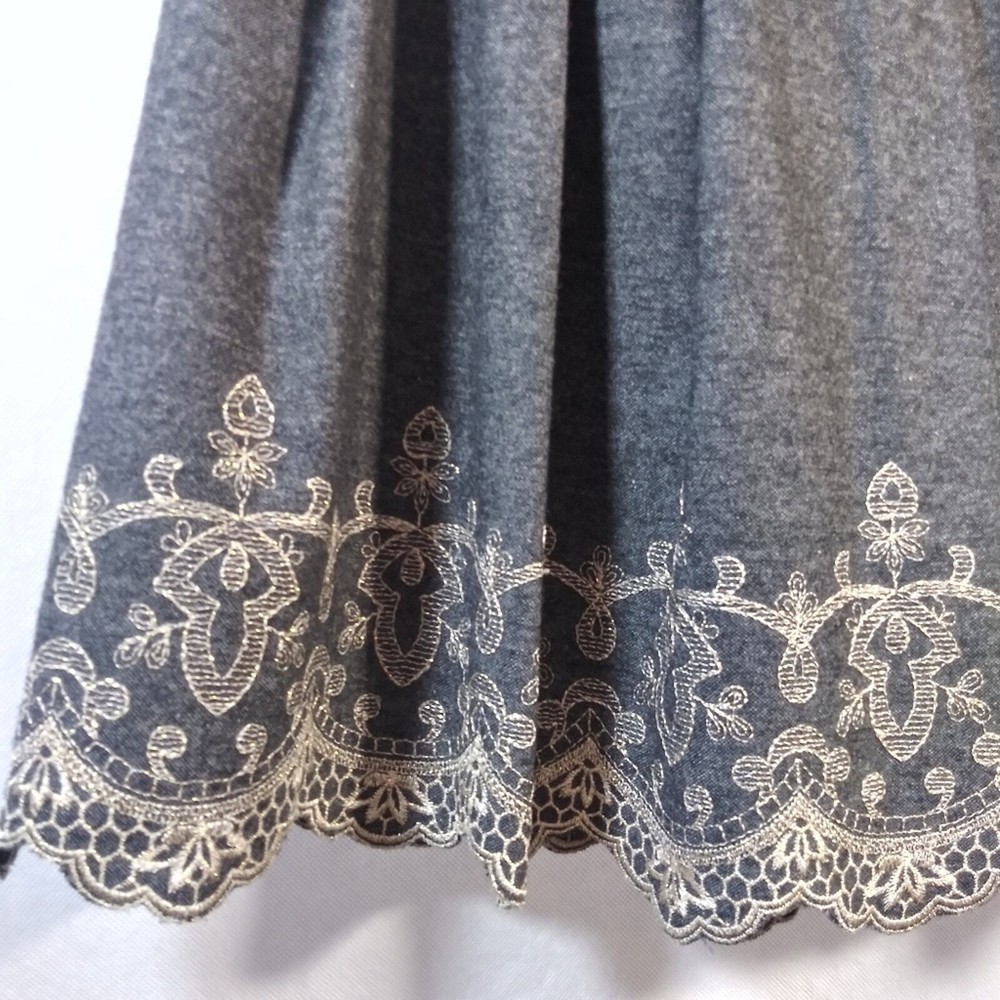 Dee Flavor Gray Pleated Gold Embroidered Skirt Wool Size Small Size Translation is a small (4-6) See measurements Wool blend skirt Pleated Gold metallic thread embroidered detail Lined Side zip Gently worn approximate measurements waist across 13" length 24"