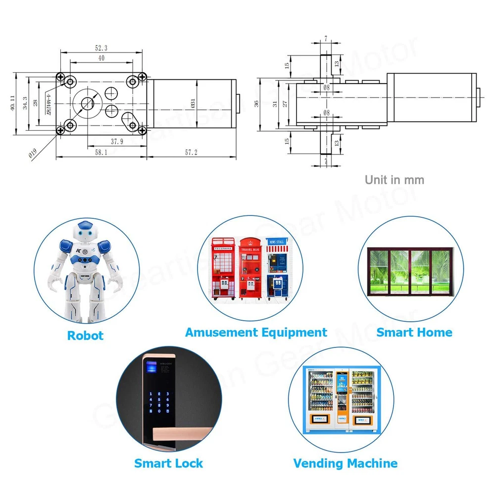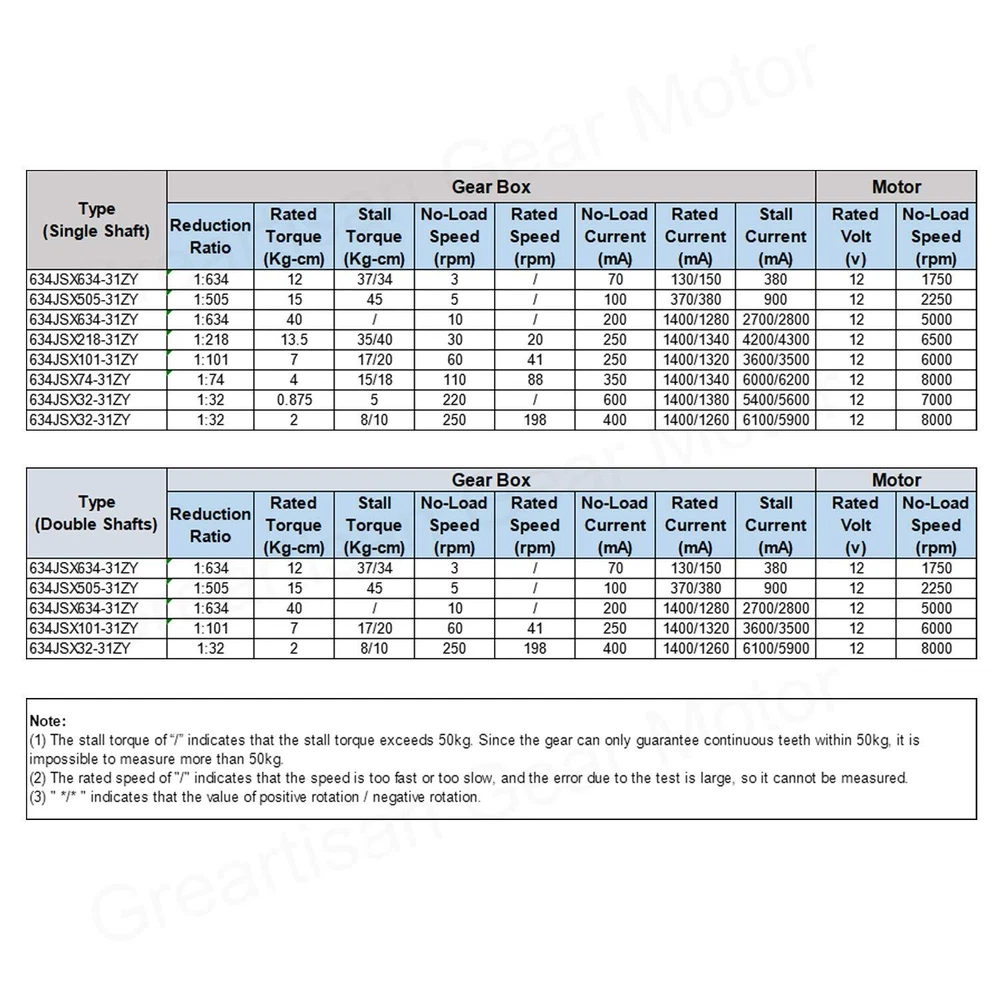 Greartisan DC 12V 5RPM 15Kg.cm 8mm Double Shafts Self-Locking 12 Volt, 5 RPM Product Details Package Dimensions : 5.16 x 3.15 x 2.09 inches; 13.4 ounces Item model number : Greartisan Manufacturer : Greartisan Country of Origin : China Brand: Greartisan Model Name: gear Speed: 5 RPM Voltage: 12 Volts Horsepower: 5 RPM 【High Torque & Lower Noise】: Long carbon brush high life, high precision gear design, small size, high torque, low noise, high efficiency. 【Positive-Negative Rotation】: This type is miniature High Torque Electric Worm Gear DC Motor, which can change shaft rotation direction while the wiring positive andnegative be changed. 【Self-Locking】: Turbo worm geared motor with self-lock, that is, in the case of motor without electric, the output axis is fixed, self-lock. 【Versatile】: The reducer output shaft arranged vertically with the motor shaft, whole motor output is relatively short,can be widely used in various of occasions that require special installation size. 【Application】: Boat, Car, Fan, Home Appliance, BBQ, Machinery and equipment, automation instruments, electric curtain, stage lighting, counter, faucet, safe, wet towel dispenser, vending machines, automatic monitoring and other modern art. Rated Voltage: DC 12V Reduction Ratio: 1:505 No-Load Speed: 5RPM Rated Torque: Rated Current: 370/380mA (Positive Rotation / Negative Rotation) Error: ±10% D Shaped Output Shaft Size: 8*15mm (0.31" x 0.59") (D*L) Gearbox Size: 58.1 x 40.11 x 36mm (2.29" x 1.58" x 1.42”) (L*W*H) Motor Size: 31 x 57.2mm (1.22" x 2.25") (D*L) Mounting Hole Size: M4 (not included) Main Material: Metal, Electronic component Wire Length : 20cm Packages: - 1 x Worm Gear Motor What does motor torque mean? The standard torque of the motor is. If the belt wheel is used for transmission, the belt wheel has a radius of 1cm, and the output tension of the belt is 10kg. If the belt radius is 2cm, the output tension of the belt is 5kg, and so on. PLEASE NOTE: 1.Use tolerance: Pay attention to the use of voltage and current range, otherwise the motor performance and motor life will decline. 2.Handling motors: Gently, as far as possible the use of motor shell part. 3.Motor wiring: Red lead to the positive electrode, black lead to the negative pole, if reversed, the motor rotation in the opposite direction. 4.Overload: As far as possible within the specified load range, prohibit motor blocking or close to the stall state for too long time to runs. Otherwise, the motor will burn out. 5.Motor storage: -- Storage temperature: 0℃ - 40℃; -- Storage humidity: 15% -90% RH; -- Avoid placing in high temperature, high humidity and corrosive gases. 6.Motor use temperature: 0℃ - 70℃