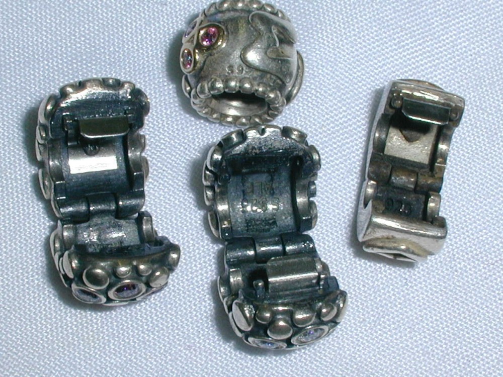 This is a great lot of four PANDORA charms, including three clip stoppers and one charm, with two of them featuring 14k gold accents. The charms are vintage and crafted from 925 silver with pink CZ stones. The style is classic PANDORA, perfect for adding to a charm bracelet or necklace. Ideal for those who appreciate high-quality fine jewelry with a touch of luxury, these charms would make a stylish addition to any collection. The one charm is MOM with 14K and pink cz's. The double heart clip has 14K and pink sapphires. The 2 larger clips have clear and pink stones- possibly topaz. DESCRIPTION: Hallmarked: 925 and 925S ALE Weight: 15 Grams Width: 3/8" They look Great on! Free First class shipping Domestic United States only, international shipping is available at actual first class rates. Please see my other listings for more great jewelry.