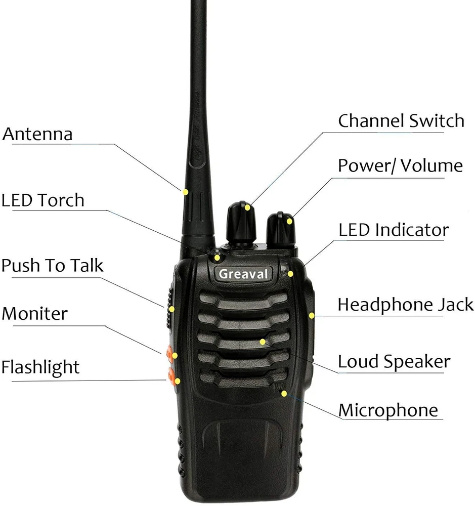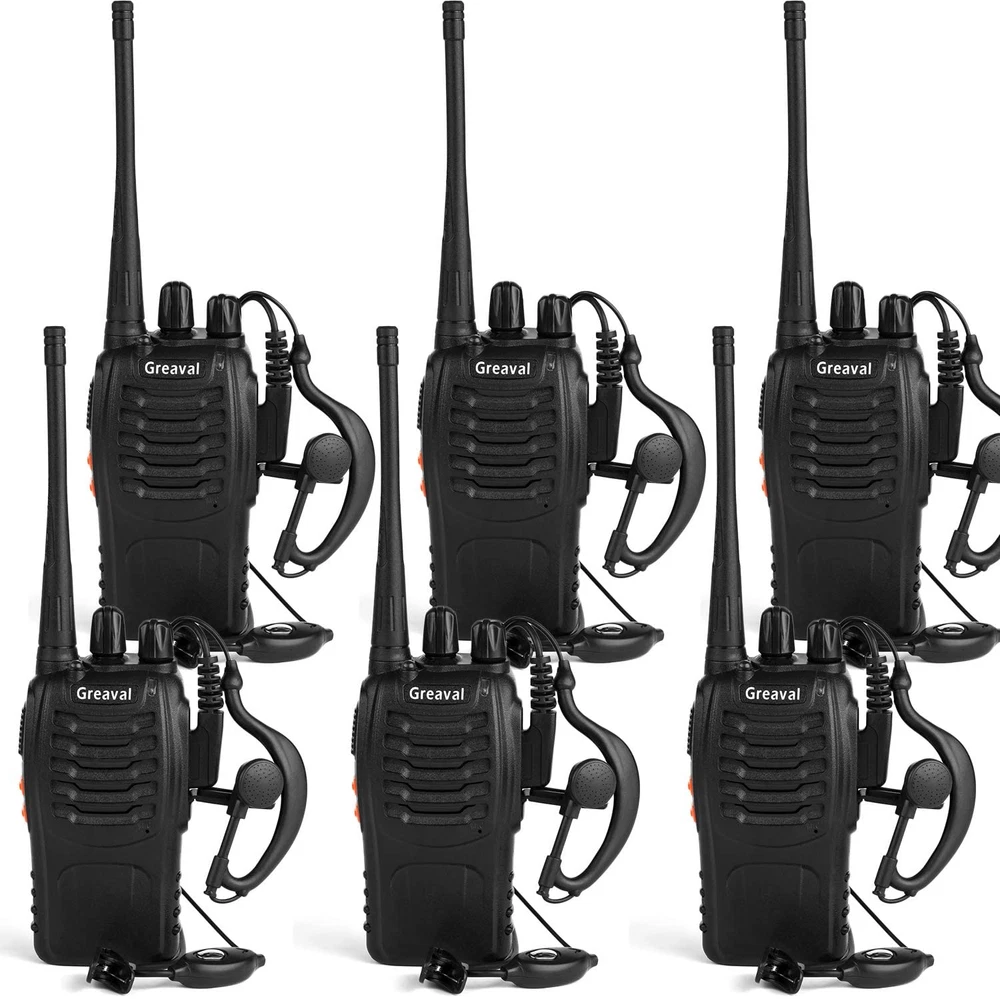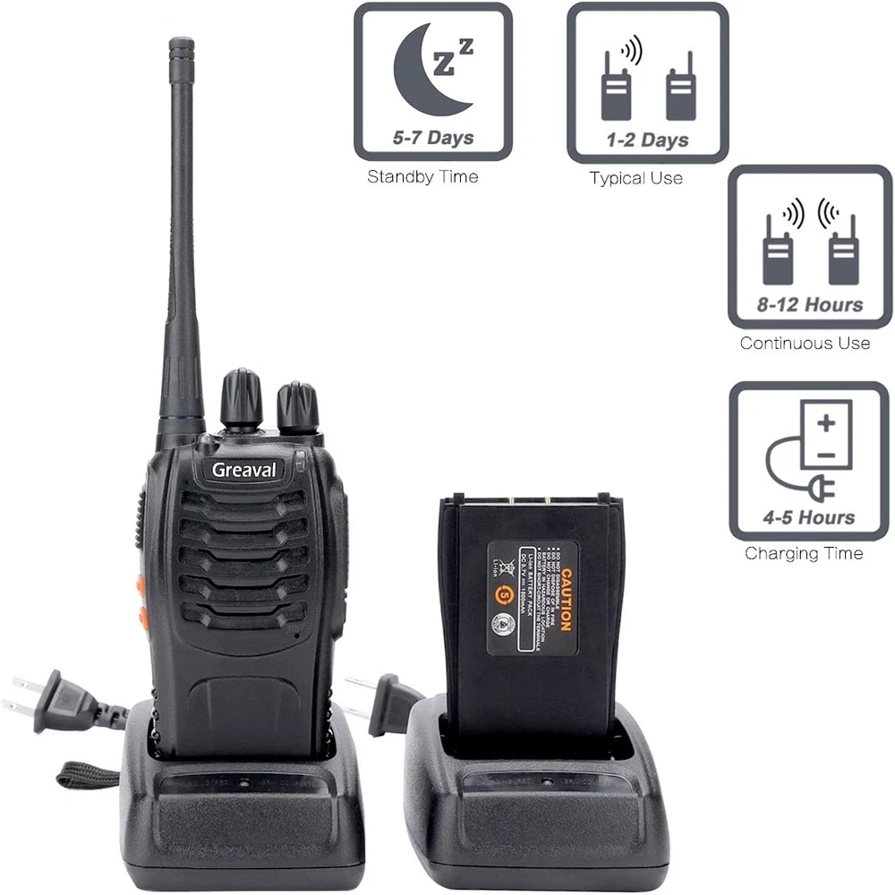 【Multi-function radio】16 channels, 50 CTCSS audio and 105 CDCSS audio on each programmed channel, Programmable with PC, VOX hands-free function, squelch adjustment, scanning, low battery alarm and night LED flashlight, etc. 【Long-Rang】1-4 Miles Range (Depends on working environments). 【Greaval GV-8S】 This walkie talkie has been tested by an FCC accreditted lab and complies with the limits for a Class B digital device. FCC ID: ZP5BF-888S, Frequency range: UHF 400-470 MHz. 【Suitable for Multiple Scenes】Lightweight and compact, Widely used for Outdoor /Home /Workplace, such as restaurant, hotel, camping, hiking trip, etc. 【 】30-day hassle-free return and customer service. Feel free to through the message if you encounter any issues, our support team is always there to help. Product Description Reliable & Inexpensive, good for your growing business Frequency Range: UHF 400-470MHz Extra Features: Built-in LED Flashlight CTCSS/DCS tone: 105 CTCSS/50 DCS Battery performance (Full Charge): Charging Time: 3-4 hours Continual Use: 7-12 hours Typical Use: 1-2 days Standby Time: 5-7 days It has 1500 mAh rechargeable Li-ion battery, typically over 12 hours working time, built-in privacy codes. Supports the communication in your safety team, construction site, warehouses, factories, restaurants, hotels and supermarkets and so on. Handy Design, Easy Operation, Suitable for Various Scenarios. Splash proof housing Working temperature: -22~140℉/-30~+60°C Item Weight: 160 gram/ 5.6 Oz Item Dimension: 60[L]×33[W]×115[H]mm(Excluding antenna) Range: Open Fields: 2-3 miles, Residential Area: 0.6-1.5 miles Inside Buildings:1-50 stories and 5000㎡ (Except basement) These radios weigh only 5.6 ounces, easy to carry along, essential communication features. Ideal for communications in large events, road trips, hiking, camping, hunting and workplaces like warehouses, school campus etc. Technical Specifications: Channel Memory: 16 (Preset) Output power: ≤5 Watt Modulation: F3E Spurious Emission: 65dB FM Noise: -45dB(W) -40dB (N) Audio Distortion: 5% Transmitting Current: 1.3A Frequency Range: UHF 400-470MHz Features: CTCSS/DCS Codes: Supported Emergency Alarm: Supported VOX Function: Supported (Preset) Low battery alarm: Supported Power saving function: Supported English voice prompt: Supported Channel Programmable: Yes Extra Features:Built-in LED torch Why choose Greaval walkie talkies? L ED Flashlight Helps to light up the dark in outdoor or in case of emergency. Clear Voice & VOX Built-in speaker, loud and clear voice with adjustable volume level. Voice Operated Transmit (VOX) supports the hands-free operation. 50 CTCSS/ 105 DCS Codes 16 GMRS/FRS channels plus 50 CTCSS/ 105 DCS codes (Privacy codes) provides up to 2480 channel combinations to extend the frequency usage. Package Content: 6 × Walkie-talkie 6 × Li-ion Battery 6 × Antenna 6 × Belt Clip 6 × Hand Strap 6 × Earpiece 6 × Charging Base 2 × User Manual