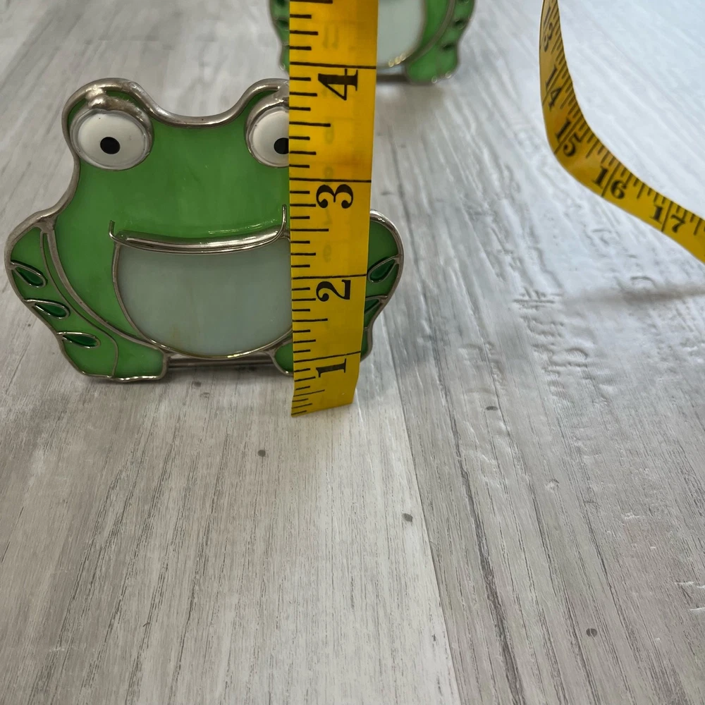 Pair of stained glass frog tea light votive candle holders Stained glass outlined with metal Glass candle holder is attached The mouths of the frogs use to be yellow but has worn off Still in great condition Approximately 3.5" W 3.75" H Measurements are approximate Colors may differ based on others computer/phone/etc settings