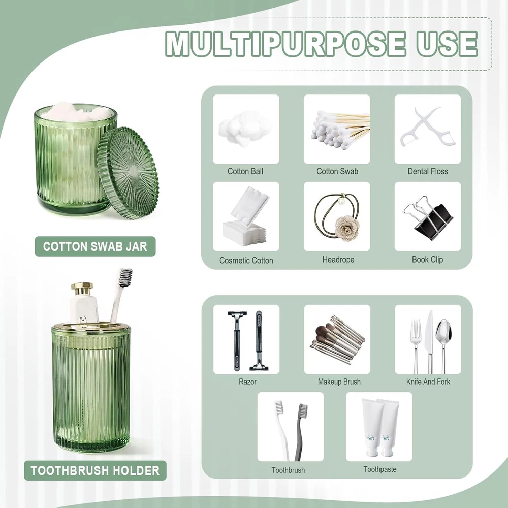 Green Glass Bathroom Accessories 4 Pcs, Set, Soap Product Details Number of Pieces: 4 Finish Type: Brushed Manufacturer: KASUNTING Product Dimensions: 3 x 3 x 7.7 inches Item Weight: 3.63 pounds Country of Origin: China Item model number: Green Bathroom Accessories Fabric Type: Green Bathroom Accessories Set Finish types: Brushed Batteries required: No Material: Glass Color: Green Brand: Kasunting Style: Green-Ribbed Included Components: bathroom soap dispenser*1, green toothbrush holder*1, qtip holders*2 Green Bathroom Accessories Set 【4 Piece Green Bathroom Accessories Set】Our bathroom accessories sets complete includes 1 x bathroom soap dispenser, 1 x green toothbrush holder, 2 x qtip holders with lids. With a stylish design, this bathroom accessory set meets your daily bathroom needs and keeps your bathroom counter organized and tidy. 【Premium Sturdy Heavy Cut Glass】The green bathroom set is made of thick and durable glass, which adopts a retro ribbed design, and the glass uses diamond cutting technology. Green glass bathroom accessories are exquisite and translucent with bright colors, creating a retro and warm atmosphere in the bathroom. The plastic pump prevents leakage and rusting over time and also ensures that the soap dispenser is easy and comfortable to use. 【Glass Bathroom Accessories Set】Vintage and fashionable green bathroom decor can be matched with any room such as master bedroom, guest room, dressing table, adding high-grade elegance and charm. The green soap dispenser is suitable for hand soap, dish soap, conditioner, lotion, etc. The cotton swab jar is equipped with a lid, which effectively prevents dust and water stains from entering, keeping cotton swabs and cotton balls clean. The clear glass and green color add a touch of sophistication to any bathroom decor. 【Cute Bathroom Accessories Perfect Present】The exquisite ribbed glass bathroom set is an ideal decoration for every style: country, western decor, modern, vintage, luxury style. The luxury bathroom accessories are also a present for family, friends and co-workers; Great as a housewarming present, wedding present, or for renovators looking to upgrade the bathroom in their home or apartment; Bathroom essentials for new apartment; Guest bathroom decor. 【Customer Service】KASUNTING aims to provide the best product and service to every customer and make every customer have the best shopping experience. If you have any issues with the green bathroom accessory set, please email us. We will reply to you ASAP and provide you with satisfactory solutions.
