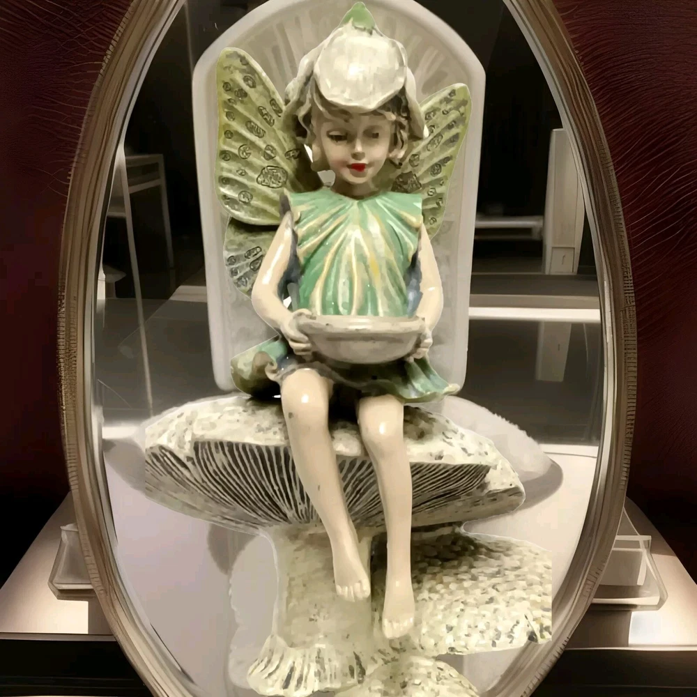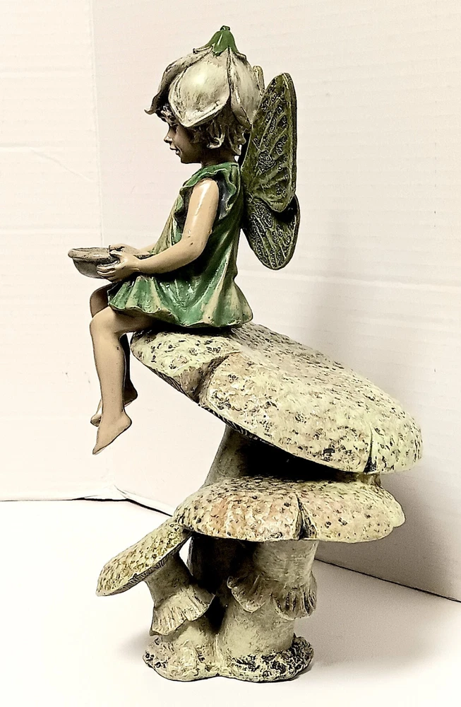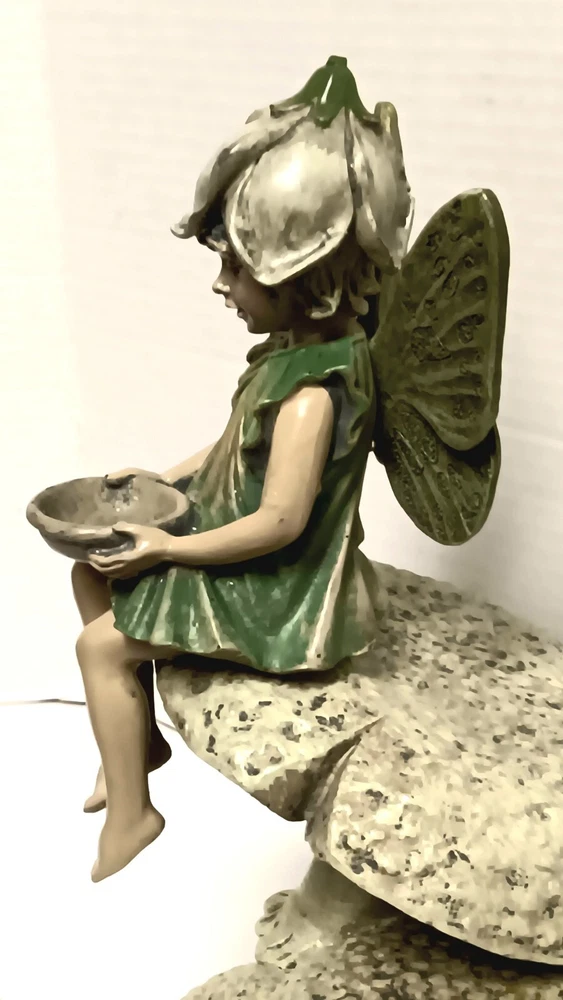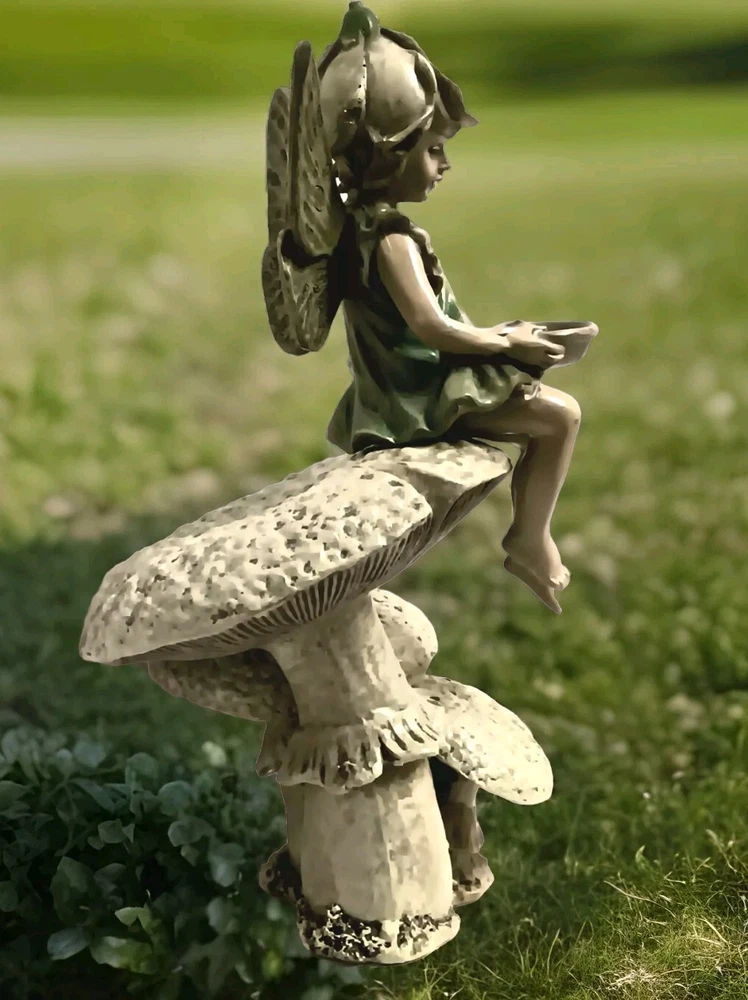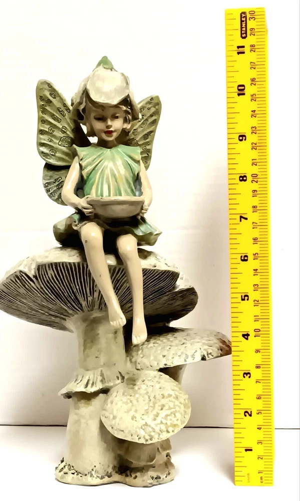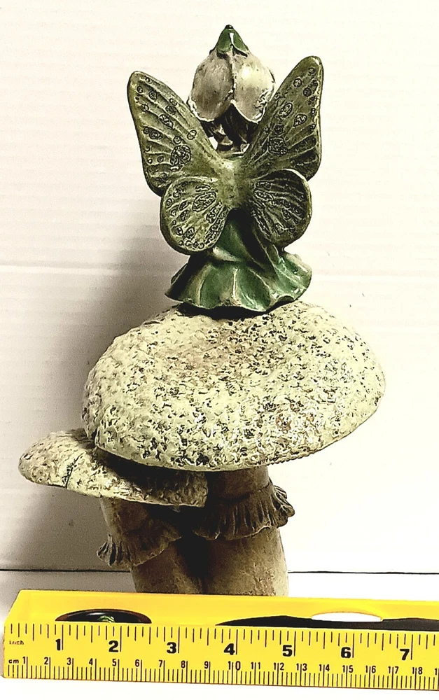 Green Resin 3 Mushroom Lucky Fairy Garden Room Angel. Measures approximately 11" H X 7" W X 5" D. Gently pre-loved good condition. She has minor hard-to-see thumb imperfections, which appear to be a manufacturer flaw or missing paint. See photos for close-up view. Weighs approximately 2.2 lbs. Can be used indoors or outdoors. She is absolutely stunning! I will ship with extra padding to ensure the integrity of the piece.