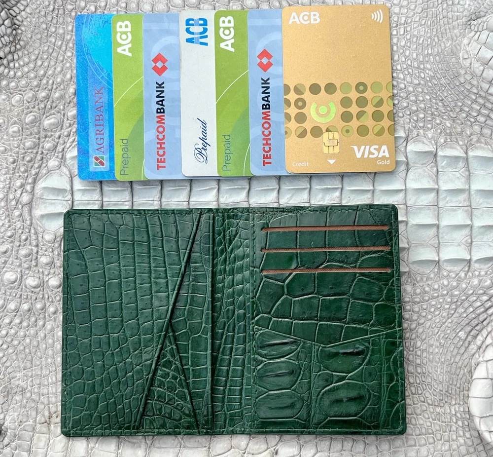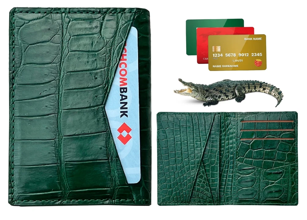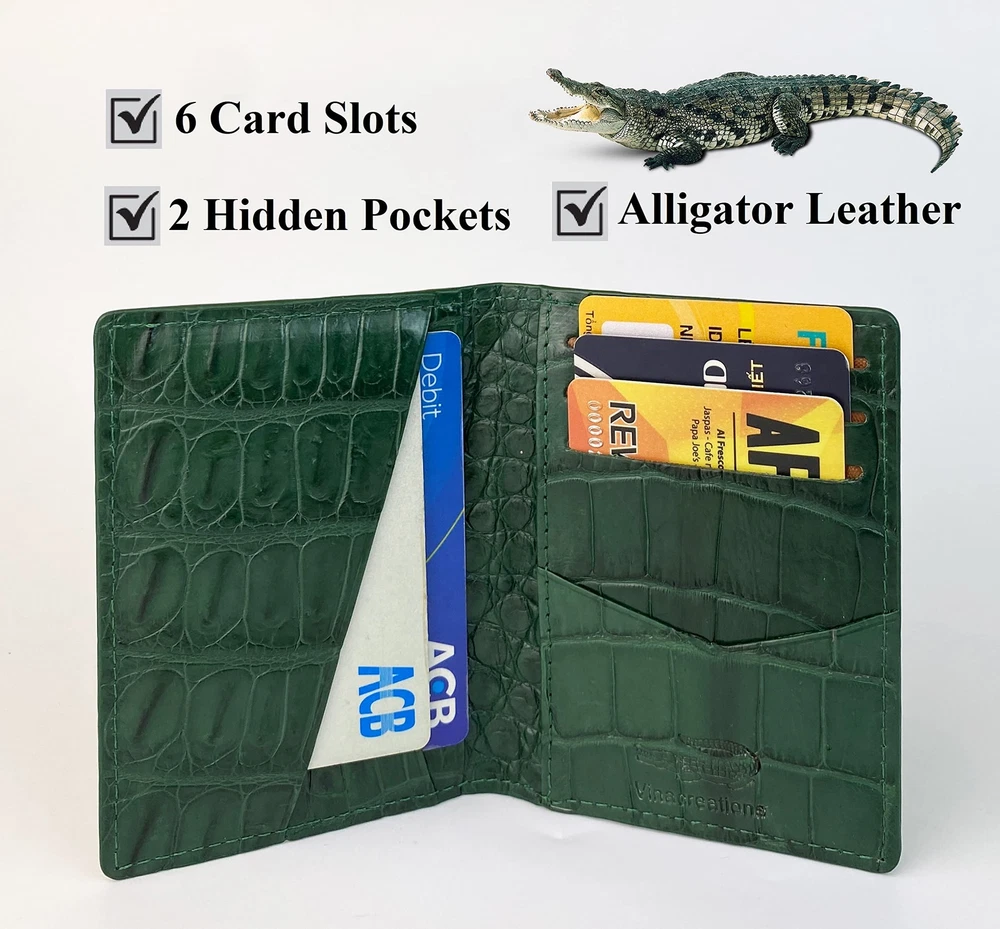 ✅ Green Bifold Credit Card Holder - Made of Alligator belly leather on surface & underside is nice and really soft & comfortable to use & luxurious feel. This slim wallet ensures durability after using many years. ✅ Ultra Slim Design: 4"H x 3"L = 10cm x 8cm (When closed) with the extended layer design, this thin men's wallet could hold more cards but it is not bulky. Its Smaller Size makes for a Comfortable Fit in either the Front or Back Pocket ✅ Slim Card Wallet Features: This alligator minimalists card wallet has 6 cards slots, 2 cash accessible slots, and 1 quick access cart slot outside. This Minimalist belly leather wallet for multiple destinations: travel, outdoors, sports, work or dating & suitable with all out fits. It brings to vintage style, fashionable and luxurious feel. ✅ RFID BLOCKING: Keep your data, personal information, and identity safe and secure whether traveling or working. That's why our Small Cardholder wallet has advanced Rfid protection, which effectively prevents thieves from accessing your personal and financial information electronically. ✅We can guarantee our Business credit cards are handmade from alligator belly leather with superior quality and beautiful design as a result of very neat craftsmanship in Vietnam. We are the maker so if you want to have a custom or personalized leather wallet please contact us with detail.