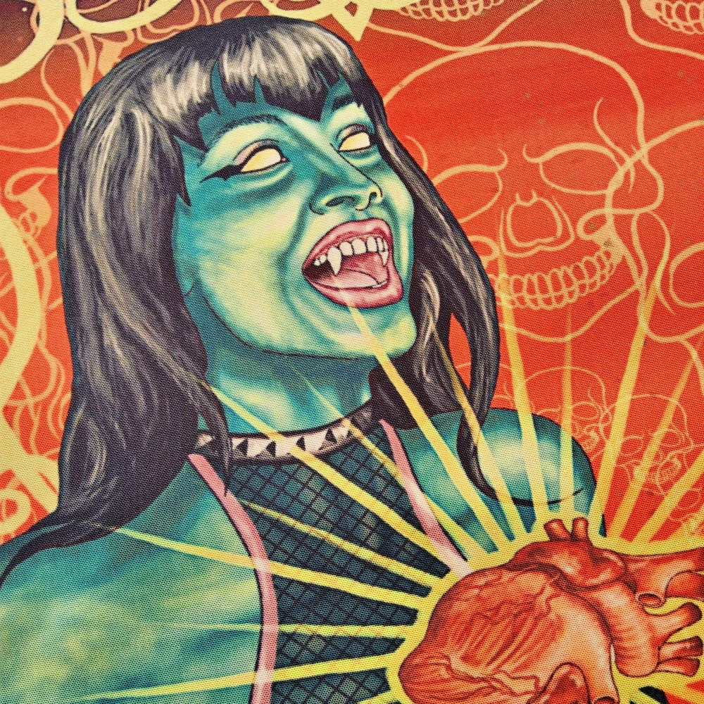 ***Treasure Suite offers you many pieces of my art prints now*** ###This section is for large sized sublimation prints of my digital art. measurements are 15"hx12"w. ### Green sci-fi fantasy vampire type pinup girl manipulating a levitating beating heart. I know some of you would risk it all for a shot with her. You don't have to, just own the print. *Welcome to my unique collection of digital art, where creativity meets craftsmanship! Each piece in this category features my original designs, heat pressed into vibrant sublimation prints on polyester canvas material. These art pieces are not just decorations, they are collectibles that bring a touch of gothic, rock and roll, horror, pin-up, and lowbrow art into your space. *I leave extra fabric border so you can gallery wrap on frame,cut to size, or sew onto clothes. Sublimation printing is what's done on clothing, like all over sweaters,tshirts,banners,etc. So that means it can be used on clothing and washed. If print gets wrinkled, you can steam it. *These pieces are perfect for adding a distinctive edge to your home or office, and they make fantastic gifts for art enthusiasts and collectors alike. Who doesn't enjoy vibrant digital art of out of this world space huntresses, demon witches, cyberpunk vixen cyborgs, spooky mistresses,and so on?