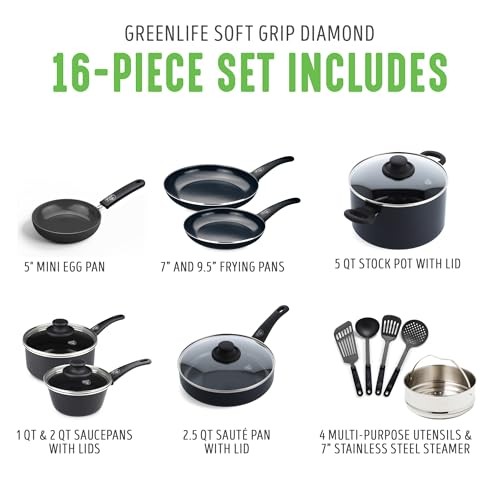 Return Policy Fast Delivery Trusted seller GreenLife Soft Grip Diamond - Juego de batería de cocina, ollas y sartenes antiadherentes de cerámica saludable de diamante con asas de agarre suave, 16 piezas, color negro Product Description El juego de batería de cocina incluye: Mini sartén de 4 pulgadas, sartenes de 7 pulgadas y de 9.5 pulgadas, olla de 1 cuarto y de 2 cuartos con tapa, cacerola de 5 cuartos con tapa, sartén de 2.5 cuartos con tapa, vaporera de acero inoxidable de 7 pulgadas, y 4 utensilios de cocina. Nuestro revestimiento antiadnte de cerámica saludable y fácil de limpiar es derivado de arena y libre de PFAS, PFOA, plomo y cadmio, para cocinar sin esfuerzo y limpiar rápidamente. Las asas de baquelita de agarre suave están diseñadas para mantenerse frías sobre la cocina para una máxima comodidad. Hecho de aluminio reciclado y reforzado con una base sin bamboleo para mayor resistencia y calentamiento uniforme. Apto para lavavajillas, aunque la mayoría de las suciedades pueden limpiarse con un trapo. Interior sin remaches para evitar enganches y acumulación de alimentos. Tapas de vidrio duraderas para un buen aspecto en cualquier comida en progreso. Shipping Returns Payment Shipping Shipping is FREE to all addresses other than APO/PO boxes in the lower 48 states. All our stock ships from US-based warehouses. Shipped via USPS or UPS (depending on location and package weight) Unless stated otherwise, all orders will ship within 24-72 hours of your payment being processed. Check our feedback to see the great reviews of FAST shipping we offer. Returns Seller does not accept returns Payment We currently accept payment via eBay managed payments only. Once payment is cleared, we will dispatch your shipment within 1-3 business days. Please refer to the "Shipping" tab for more information regarding shipping speed to your destination.