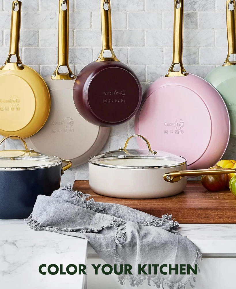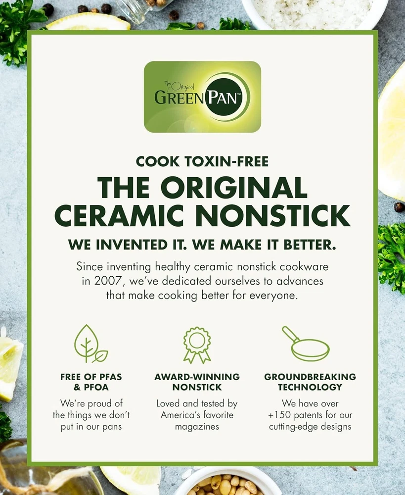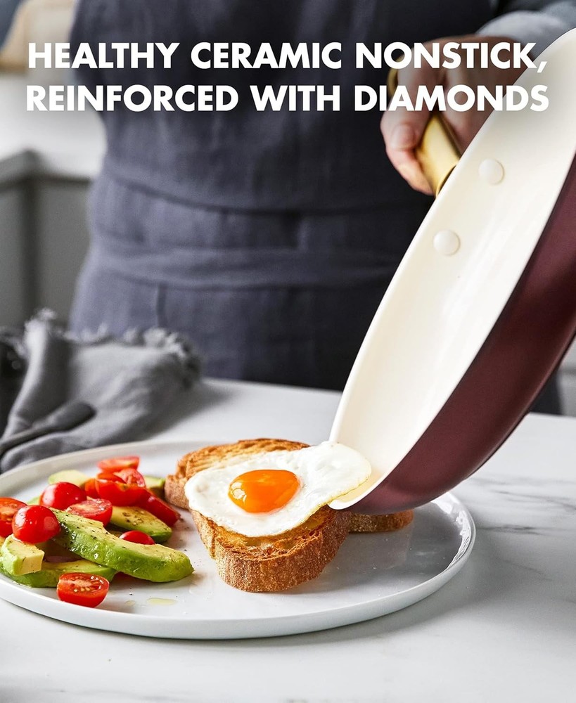 GreenPan Reserve Hard Anodized 8" and 11" Skillet Set, Merlot Red Product Details Brand: GreenPan Material: Ceramic, PFAS Free Nonstick, Hard Anodized Aluminum, Gold-tone Stainless Steel Handles Special Feature: Electric Stovetop Compatible Color: Merlot Red Capacity: 2 Quarts Compatible Devices: oven Product Care Instructions: Dishwasher Safe, Hand Wash Maximum Temperature: 6E+2 Degrees Fahrenheit Handle Material: Stainless Steel Is Oven Safe: Yes Model Name: Reserve Has Nonstick Coating: Yes Is Dishwasher Safe: Yes Specific Uses For Product: Kitchen cooking, high-temperature cooking, health-conscious cooking, long-term use, regular use Item Weight: 5.94 pounds Manufacturer: GreenPan Item model number: CC005387-001 Diameter: 11 Inches Mildew-resistant: Cadmium Free, Perfluorooctane Sulfonate (PFOS) Free, Perfluorooctanoic Acid (PFOA) Free, PFAS Free, Bisphenol-A (BPA) Free, Lead Free Assembly required: No Number of pieces: 2 Batteries required: No Included Components: 8" and 11" Frying Pan Skillet Set SET INCLUDES: 8" and 11" frypans REINFORCED WITH DIAMONDS: GreenPan's original diamond-infused nonstick coating offers remarkable durability, balanced heating, and effortless cleanup TOXIN-FREE: GreenPan's Thermolon healthy ceramic nonstick coating is free of PFAS, PFOA, lead, and cadmium DUOFORGED ARMORED BODIES: Pretreated before they’re hard anodized, these pans deliver extraordinary strength and scratch resistance with uniform heat BUILT FOR OVEN COOKING: Oven and broiler safe up to 600°F and suitable for all stovetops, except induction STYLISH FLAIR: Gorgeous gold-tone handles add a pop of color to any kitchen STAINLESS STEEL HANDLES: Riveted matte-finished handles offer a safe and secure grip EASY TO CLEAN: These pans are dishwasher safe for easy cleanup, but most messes will wipe clean World-class tech meets minimalist style in the GreenPan Reserve collection. This sleek collection is designed to stay beautiful—the duoforged hard anodized aluminum construction makes each pan extra tough and scratch-resistant while also promoting even heat distribution for consistent cooking. This set features our Thermolon healthy ceramic nonstick coating, which is reinforced with diamonds to make it ultra-durable and heat responsive. Our ceramic nonstick coating helps you make any meal healthier because it’s free of PFAS, PFOA, lead, and cadmium and will never release toxic fumes, even when overheated. Durable glass lids give you an easy view of your meals while the gold-tone stainless steel handles add an incredible contrast and make transferring easier than ever. Oven safe up to 600°F, glass lid up to 425°F. Dishwasher safe. This cookware set includes: 1 .5-quart and 3-quart saucepans with lids; 6-quart stock pot with lid; 8", 10", and 12" frying pans; 4.5-quart sauté pan with lid; 11" grill pan with lid; small, medium, and large pan protectors.