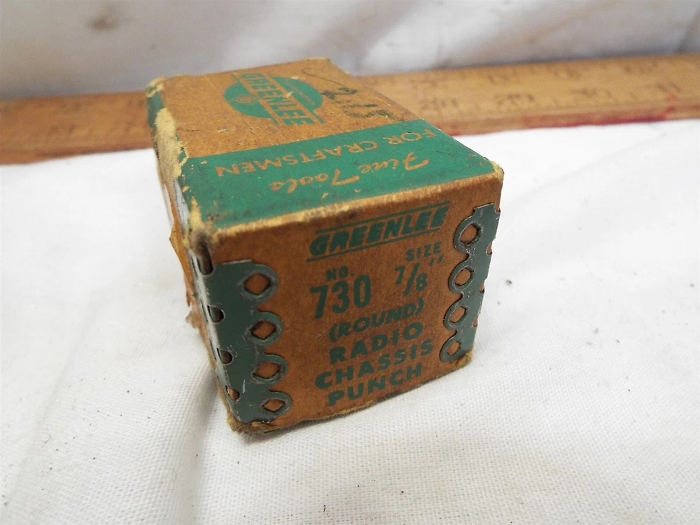 Item Description A Greenlee Knockout Punch tool # 730. It has the original box. The punch is sizes 7/8". Everything is in good, used condition as pictured. 030524 - OE We sell mostly USED and UNIQUE items. Expect minor evidence of use or imperfections, dings etc. from age. We take many photos of our items to assist with the description. Please use the photos to help judge content and condition. BUY WITH CONFIDENCE : We have sold over 25,000 antiques on-line since 1997 with over 15,000 positive customer feedback. We have been giving quality service to the on-line collector community for over 19 years. Our selling history speaks for itself so that you can buy with confidence. RETURNS : Accepted, full purchase price refunded upon return. Buyer to pay return shipping. Please inspect your item, and notify us of a return within 3 days of receiving it. SHIPPING : 99% of items shipped within three business days. Powered by SixBit's eCommerce Solution