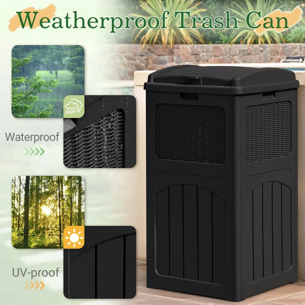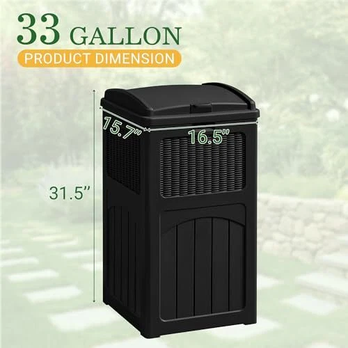 Greesum 33 Gallon Outdoor Trash Can for Patio Feature: The trash is in imitation rattan weaving design. Made of high quality resin material, the trash can is waterproof and UV proof. And it is suitable to be used as a mailbox. Specification Color: Black Package Dimensions: 31.69"(L) x 17.72"(W) x 7.87"(H) Package includes: A trash bin A manual of installation and usage Notice: There may be some differences between photos and items in term of color, because of the influence of lighting during the shooting or the settings of the computers’ display screen. Outdoor Patio Trash Can: Designed with imitation rattan weaving patterns, this outdoor waste bin not only looks beautiful, but also has strong practical functions. It is waterproof, UV-resistant, fade and warp-resistant, and can meet the needs of different scenarios Multi-Functional Use: This resin outdoor trash can withstand the effects of various outdoor elements, preventing the entry of water and dust. It can also be used as an outdoor storage bin, suitable for patio, swimming pool and other multi-scenario use needs Large Storage Space: This trash can has a storage capacity of 33 gallons and measures 16.5”(L) x 15.7”(W) x 31.5”(H). It can fit garbage bags in 30-33 gallon Dual Lid Desin: On the top, there is a securely latched lid, and you can easily open it by simply pressing the position with the logo “press” printed. You can easily change the garbage bag by lifting the external lid. Also, the external lid holds the trash bag in place so it won't move around easily Easy to Assemble: The trash can is easy to assemble within 10 minutes with no screws needed