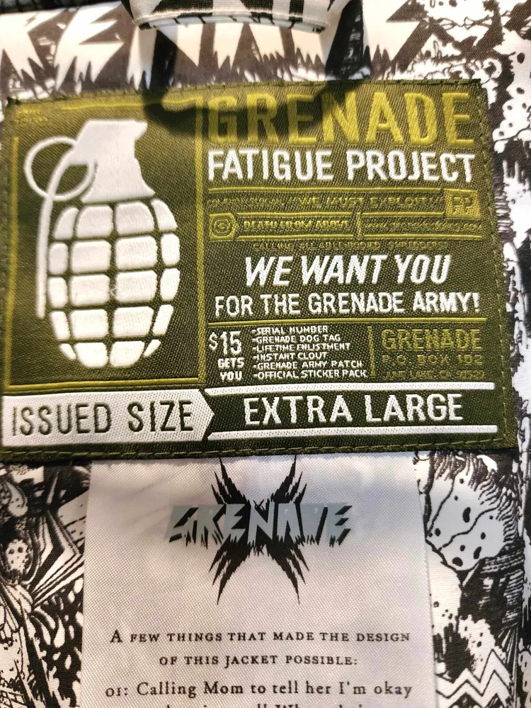 This Grenade Fatigue Project Y2K Full Zip Activewear Jacket is the perfect addition to any action-sports enthusiast's wardrobe. The jacket is made of softshell nylon fabric that is breathable and water/wind resistant, making it ideal for winter, fall, and spring seasons. The jacket features a stand-up collar which can also be turned down, 5 zipped pockets, and a limited edition design with the limited edition Grenade Army Membership product line. The jacket is designed with a full zip closure, snap accents, and underarm ventilation ports, technical cuffs and is available in men's size XL. It is machine washable and comes in mid-length with an all-over black and white pattern. This jacket is perfect for skiing, snowboarding, and skateboarding, and is a must-have for anyone who wants to look stylish while staying comfortable and protected from the wind and water. This jacket is an exclusive line from Grenade Gloves when you join their "Grenade Army" paying a membership. This jacket is similar to the collaboration with the band The Misfits and their jacket featuring black & white Misfit printing. Measurements: Shoulder to hem (front): 32.5" Shoulder to hem (back): 32.25" Shoulder to cuff: 35" Pit to pit: 27"