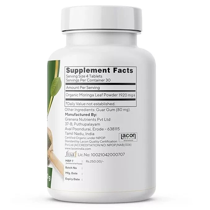 From the brand EXPLORE GRENERA PRODUCTS > Previous page Grenera Nutrients is a company that produces and sells organic super-foods, herbal extracts, and nutritional supplements. Our product line includes moringa, turmeric, amla, ashwagandha, triphala, wheatgrass, spirulina, and other superfoods, as well as herbal extracts such as ashwagandha and turmeric. Our factory operates in adherence to ISO 22000 standards, GMP standards. Guaranteed high quality ingredients delivered to our customers on time. How we get our start? Founded in the year 2010 Grenera Nutrients is the largest vertically integrated manufacturer of Moringa products globally. We pride our self on using only the highest quality, organic ingredients. What makes our products unique? Grenera’s strategy is being focused on providing nutritious, and sustainable products that support the well-being of consumers. Why we love what we do? At Grenera, we believe organic farming is the catalyst for a truly sustainable. We use third-party audits and verification for ensuring that our company’s standards. Next page Product Description ORGANIC MORINGA TABLETS - 120 TABLETS / BOTTLE (500mg PER TABLETS) ORGANIC CERTIFIED MORINGA TABLETS Grenera is a pioneer in manufacturing organic supplement products. Grenera's moringa tablets are certified organic. Moringa is a superfood that means all the parts of the tree are rich in nutrients. We source organic moringa leaves from our own certified organic moringa farms. These leaves are dried in a very hygienic method and we ground the moringa leaves. Each bottle consists of 120 moringa tablets and the weight of each tablet is 500mg. Every bottle is packed in a very hygienic way and properly sealed. We also have a shrink wrap over the bottle which indicates that the bottle is not opened yet. You can check the batch number, manufactured date, expiry date at the bottom of the bottle. CERTIFIED ORGANIC MORINGA TABLETS Moringa leaves have been consumed by the Asian people for millennia. People may add these leaves in their salads and curries. In the modern world everyone would not be able to have the moringa leaves. So Grenera wants everyone to get the benefits of Moringa by launching Organic Moringa Tablets.