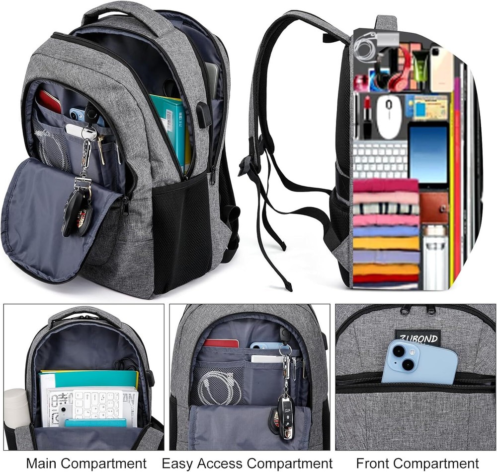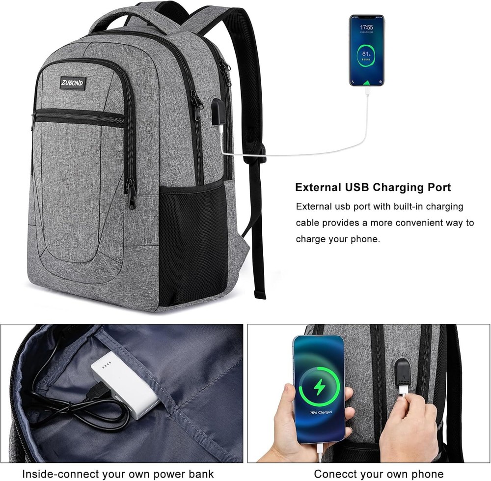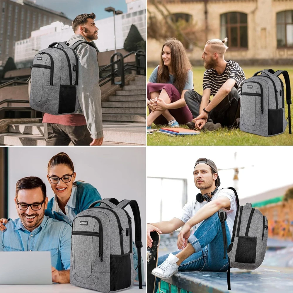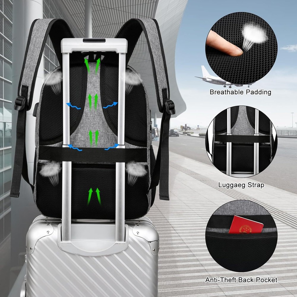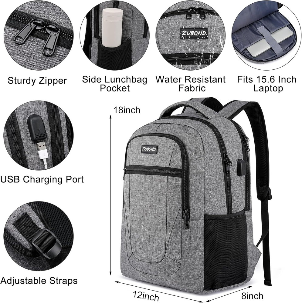 Grey Backpack, School Backpack for Teen Boys and Girls, 15.6 Inch, Product Details ▶︎ Classic Multi-Pockets Design -One separate laptop compartment hold 15.6 Inch Laptop as well as 15 Inch,14 Inch and 13 Inch Laptop. One spacious packing compartment roomy for daily necessities,tech electronics accessories. Front compartment with many pockets, pen pockets and key fob hook, makes your items organized and easier to find ▶︎ Lightweight but sturdy- Made of high quality waterproof oxford fabric, sturdy and wearing-resisting. But it only weighs about 2lbs. Ideal for short trips, daily travelling and business work ▶︎ USB charging port - With built in USB charger outside and built in charging cable inside,this usb backpack offers you a more convenient way to charge your phone while walking. It's a great tech gift for him from wife, daughter and son. Please noted that this backpack doesn't power itself, usb charging port only offers an easy access to charge ▶︎ Back Multi-Functional - A luggage strap allows backpack fit on luggage/suitcase, slide over the luggage upright handle tube for easier carrying. And with a hidden anti theft pocket on the back protect your valuable items from thieves. Well made for international airplane travel and day trip as a travel gift for men ▶︎ Breathable & Comfortable-Padded and breathable mesh back panel of this computer rucksack design help for the air convection, ventilation and heat elimination. Comfortable wide S breathable mesh shoulder straps with plentiful sponge pad help relieve the stress from your shoulder