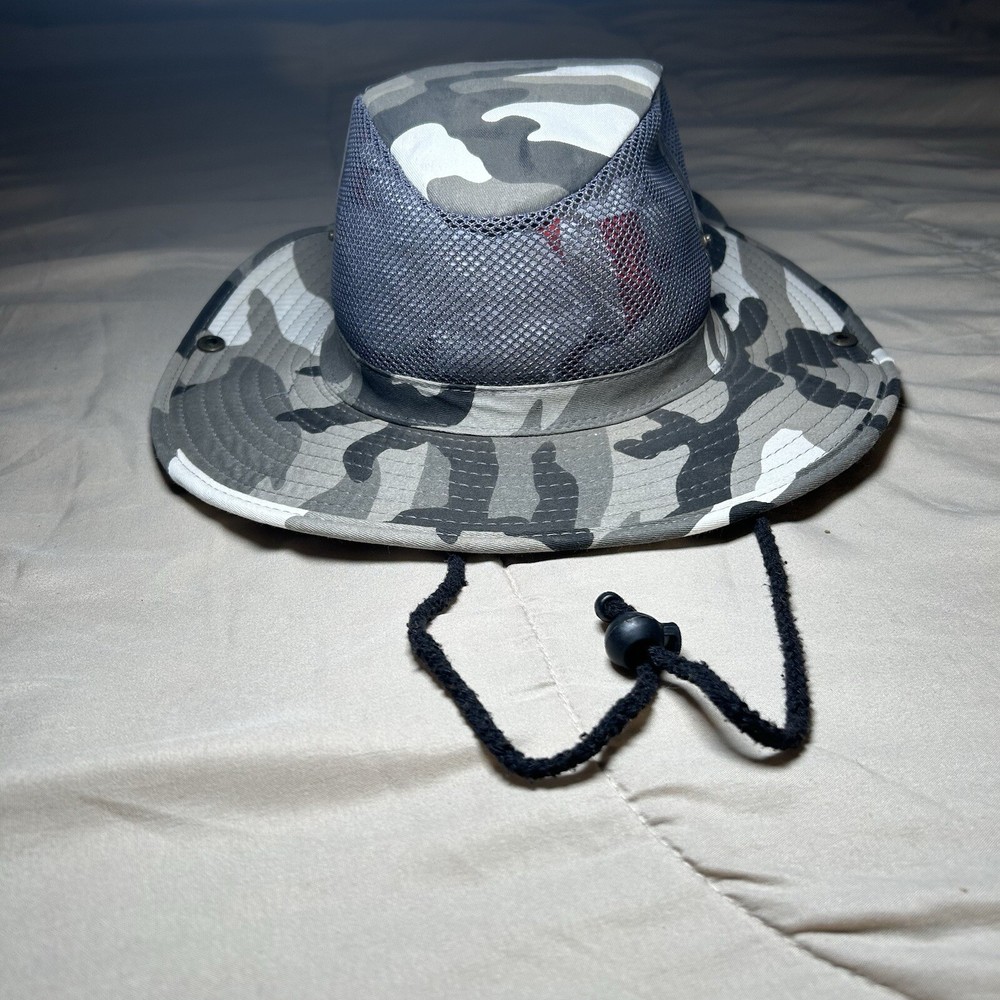 This Grey Camouflage Camo Hunting Fishing Adult Large Hot Weather Bucket Hat cap by Sunsations is perfect for any outdoor enthusiast. The hat is made of lightweight cotton canvas material, making it breathable and comfortable to wear in the summer, spring, or fall seasons. The wide brim and adjustable strap provide additional protection from the sun and heat. The bucket hat features a camouflage pattern, making it a stylish addition to any casual or workwear outfit. It is perfect for hunting, fishing, or any other outdoor activity. The hat is not signed or personalized and is made in China. Get ready to explore the great outdoors with this practical and stylish bucket hat!