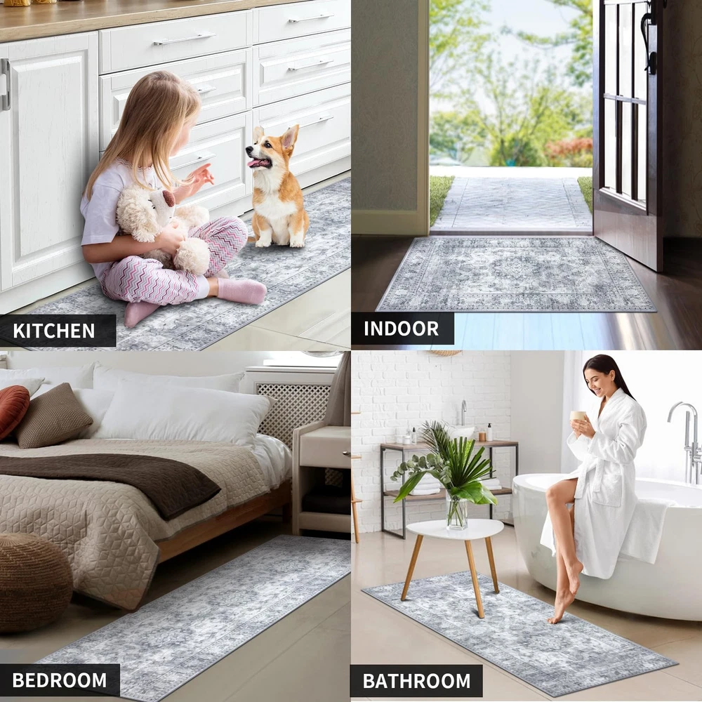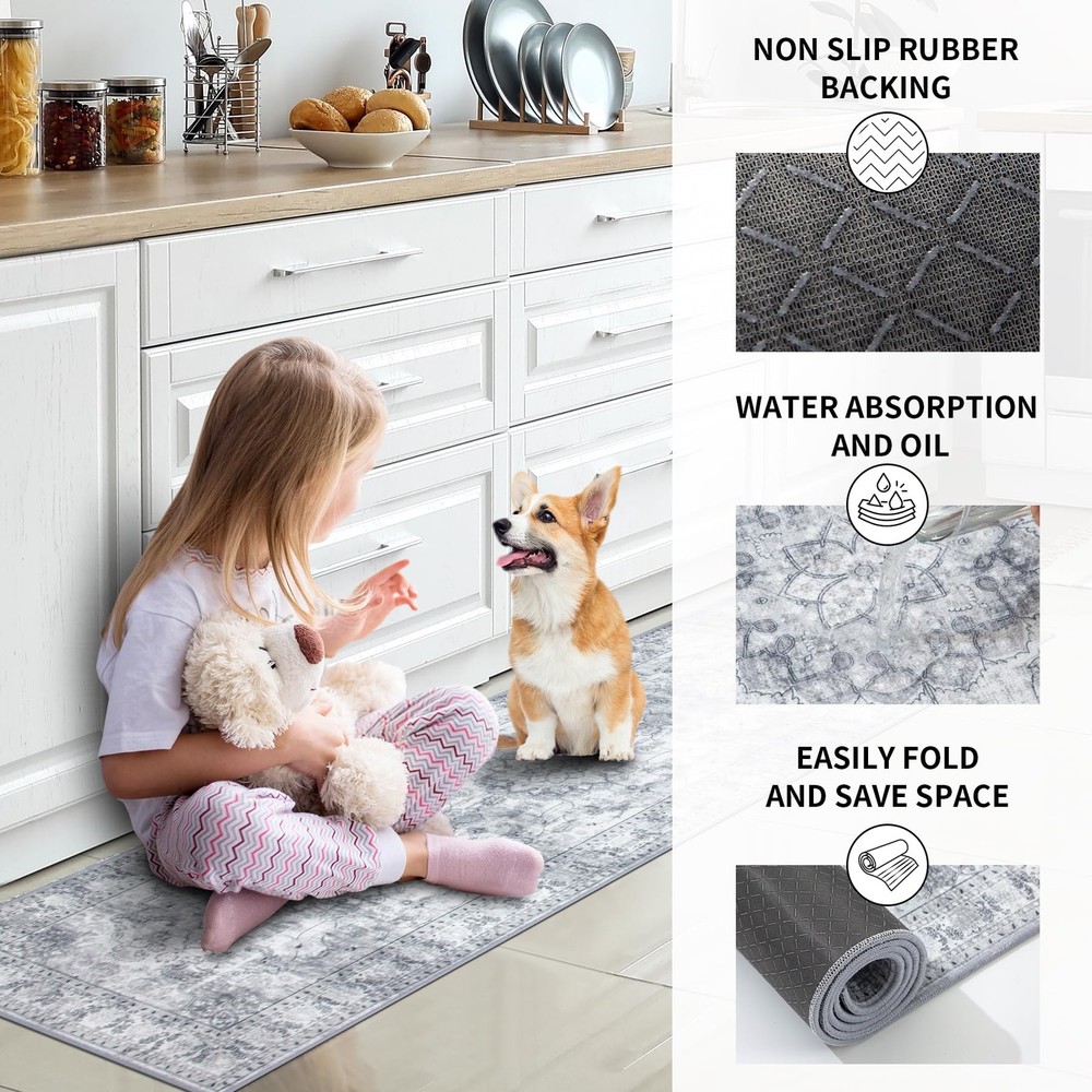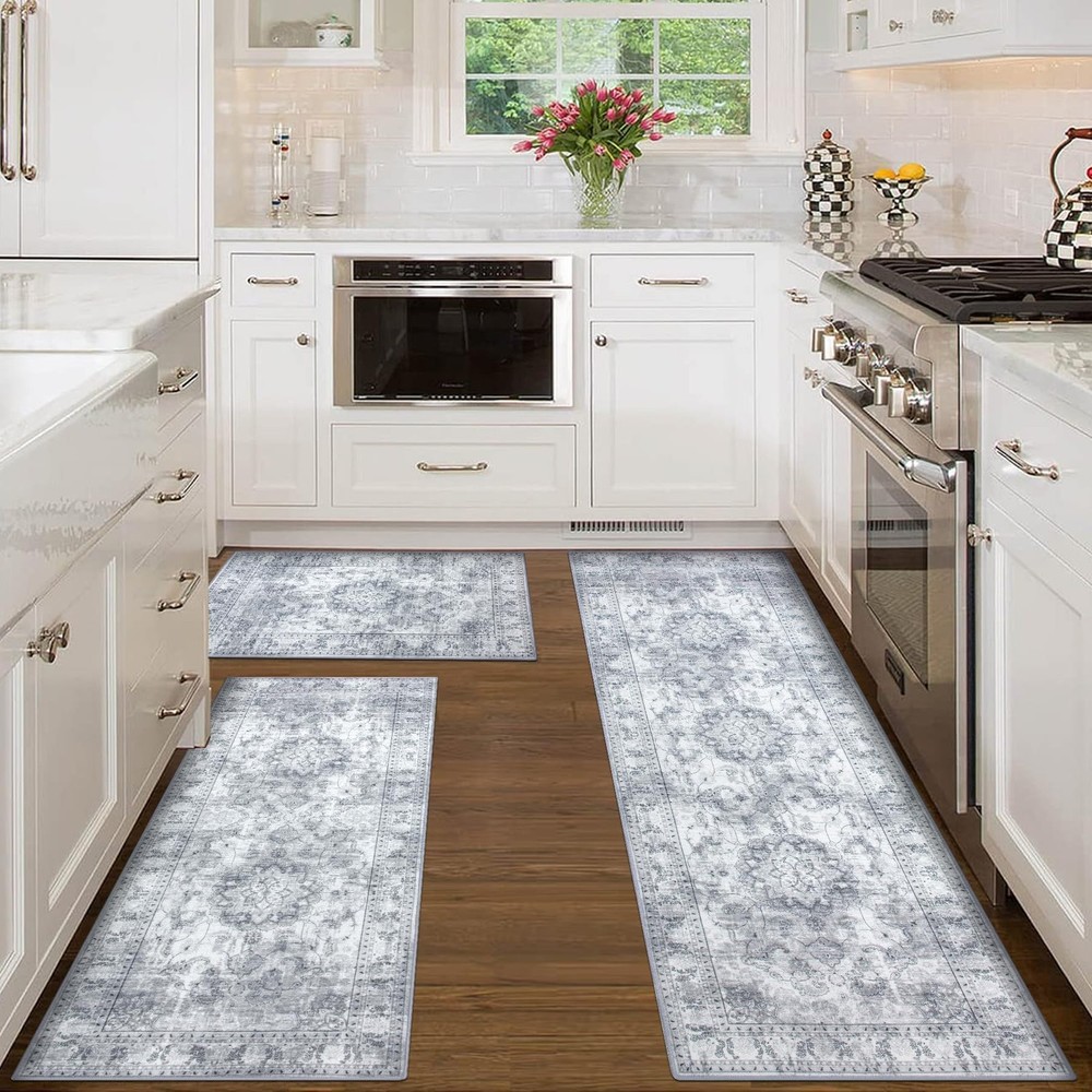 These kitchen rugs are a game-changer! The soft, durable material feels great underfoot, and the non-slip backing keeps them securely in place. Perfect for high-traffic areas like the sink, hallway, or laundry room, they absorb spills and wipe clean easily. The neutral grey color blends with any decor, and the 3-piece set offers great coverage. I love how they stay flat with no curling edges—no tripping hazards! The moisture-absorbent surface handles spills and oil splatters effortlessly. After weeks of use, they still look new. Highly recommend for anyone needing stylish, functional rugs that last!