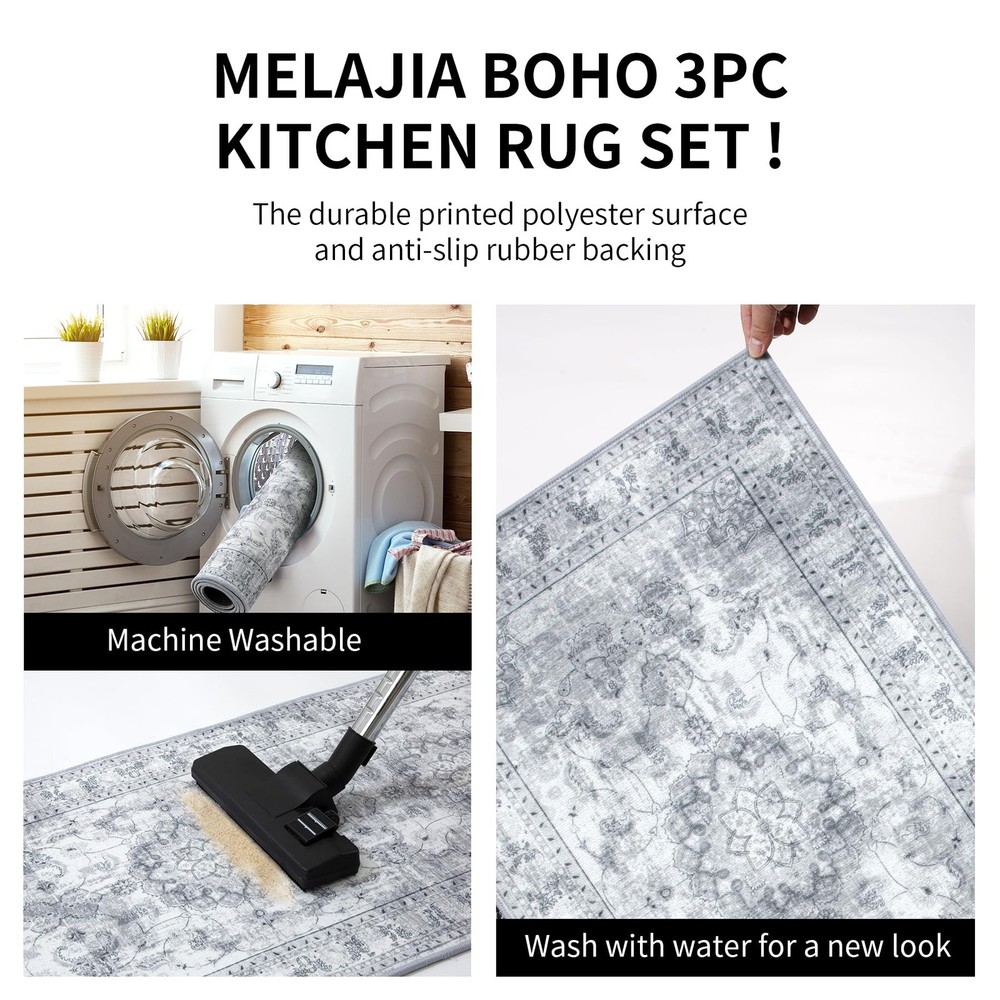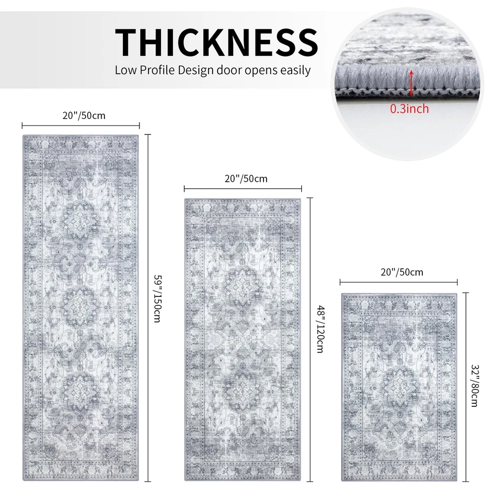 The kitchen rugs sets of 3 is very comfortable and durability, which is perfect for kitchen floor in front of sink, laundry room in front washer or dryer, door entrance, hallway, wash room, bathroom floor beside the tub, garage. Why Choose runner rug for hallway ? - It is non slip rubber backing and the surface is flat, no pile or texture;Easy to wipe clean. - Durable printed flocking Surface is absorb moisture and oil. -Slip-resistant backing for added safety This kitchen floor mats will provide ample support for your foot &knees when you are cooking or working. Comfort and elegant design kitchen rug will bring you better mood. After Sales Service: With 100% satisfaction and money back guarantee! If you have any problems with our kitchen rugs, please feel free to contact us! Perfect Normal Size:Package Includes 3 piece rug set kitchen. The 20"x32"+20"x48"+20"x59" size is wider and larger than other kitchen rugs set; Easy to Clean: Keep your floors looking spotless with our kitchen rug sets with runner. Simply machine washable or wipe it clean with a damp cloth, and it's good as new! Non-Slip & Low Profile: Our rugs feature non slip rubber backing that keeps them securely in place, so you don't have to worry about slips and falls. Plus, their low profile design allows doors to easily open over them. Durable Material:The boho kitchen rug set is made of polyester material. The 0.3inch thickness is comfortable to stand on while cooking and doing dishes and absorb moisture and oil. Versatile Use: Our kitchen rugs and runners are perfect for a variety of spaces, including the kitchen, laundry room, hallway, bathroom, bedroom,sink and more. Easy to Unfold: Our kitchen rugs set of 3 may arrive folded in the package. Simply iron them at a suitable heat to remove any creases.Hope this helps!