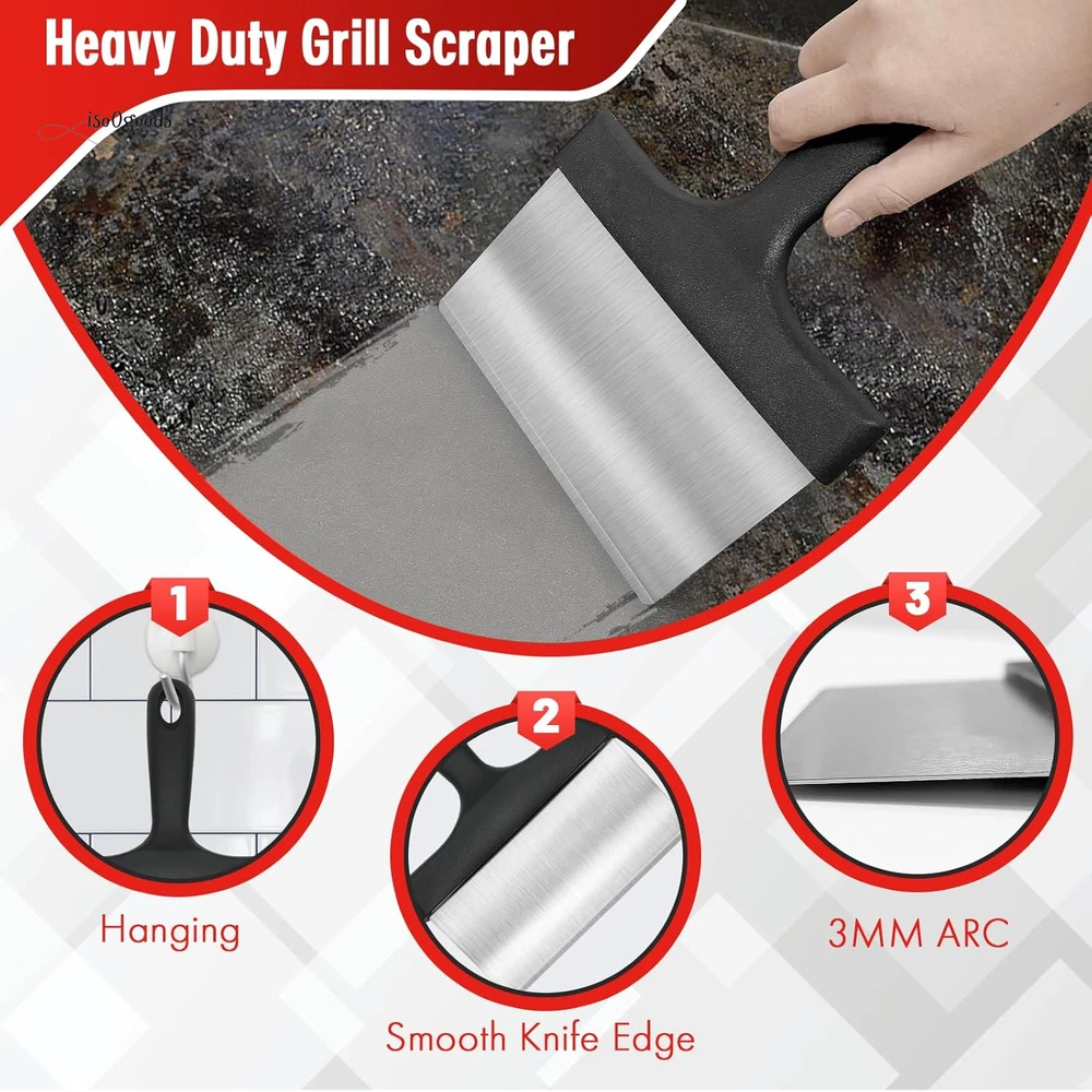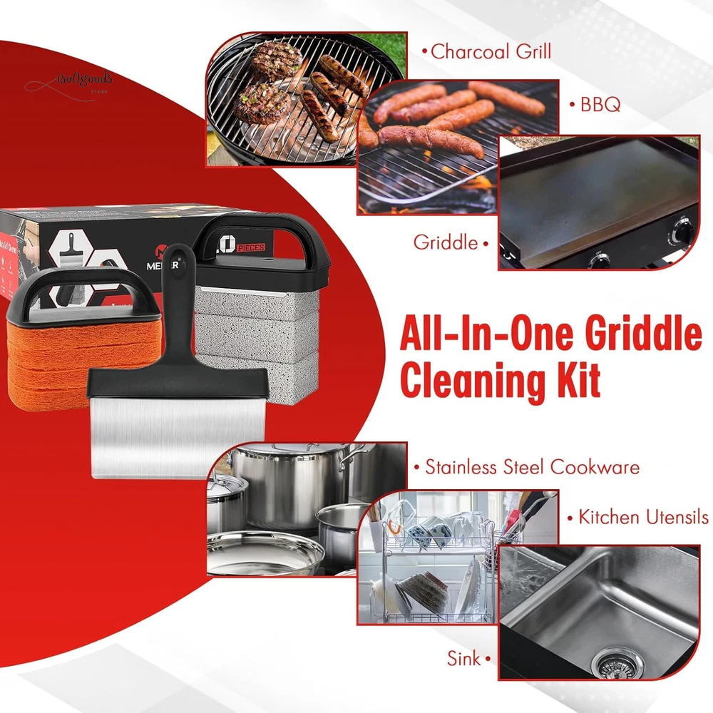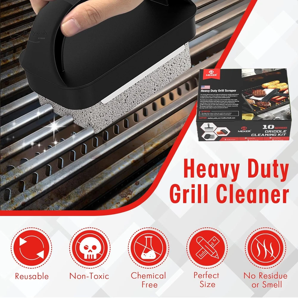 Extend the Life of Your Griddle: Kickstart a healthy lifestyle with spotless kitchen tools! Use MEKER's griddle cleaning kit before and after cooking to prevent your griddle from flaking and damage. Proper re-seasoning ensures long-lasting use and optimal performance. Multipurpose Scraper: The versatile pan scraper is perfect for cleaning your skillet and griddle. Barbecue turners make flipping food a breeze, and the heavy-duty BBQ scraper can even chop food. Discover endless uses in your outdoor barbecue area—cleaning has never been this fun! Safe & Scald-Free: The flat top grill cleaning kit comes with scouring pads and an easy-to-install handle, perfect for use on hot or cold surfaces. Protect your hands from scalding and enjoy a hassle-free cleaning experience. Efficient Cleaning: A clean griddle surface is key to optimal cooking. Our BBQ Grill Bricks are made from 100% natural pumice stone, specifically designed for flat top grills. They won’t scratch ceramic tiles or metal surfaces, and they effortlessly remove residue, stains, and dirt. Effective on cast iron, pots, stainless steel griddles, and grills—say goodbye to stubborn residue! 10 Essential Tools: Looking for a thoughtful gift? This griddle cleaning kit is a must-have for any backyard kitchen. It complements griddles and grills like Weber, Charbroil, and Coleman. Treat yourself and your loved ones to the ultimate cleaning solution! Year-Round Use: The Griddle Cleaning Kit for Blackstone is perfect for both residential and commercial griddles. Whether you're a professional chef or a weekend grilling enthusiast, this kit ensures a clean and sanitary cooking surface. Product Description: Easy to Store All Purpose Ideal Gift Healthy Life