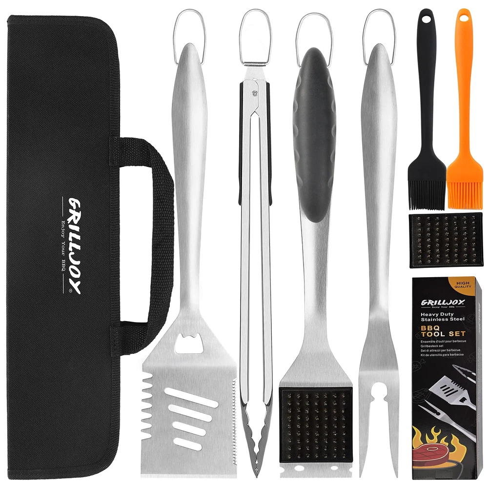 Grilljoy 8PCS Heavy Duty BBQ Grill Tools Set with Extra Thick Stainless Steel Spatula, Fork, Tongs & Cleaning Brush - Complete Barbecue Accessories Kit with Portable Bag - Perfect Grill Gifts for Men Complete Barbecue Accessories - BBQ spatula, fork, tongs, 2 basting brushes, grill cleaning brush, extra brush head and storage bag. Practical tools for barbecue, these tools are easy to clean, dishwasher safe. Premium Quality - Our bbq tools are made of high-quality stainless steel. As a set of heavy duty barbecue tools, it is extremely thick and difficult to bend by hand, don't worry about rusting or cracking. You can't find a better barbecue tool set than this. Elegant Design - As soon you remove these deluxe tools from the portable bag, you'll immediately notice the perfect heft and comfortable rubber grips. Ergonomic grips and exquisite balance will make them feel like an extension of your arm. Convenient Storage - Compared to the single-use packaging box, the carrying bag is more practical. You can easily protect your grilling tools in the portable storage bag and take them with you when you travel or camping.It is a perfect present for Father’s Day, birthdays, Christmas, wedding and housewarming. Satisfactory After-sales Service - We are very confident that you will love our grill accessories. If you are not satisfied with the product, please let us know and we will give you a satisfactory result. Shipping We offer FREE shipping on all orders! We use a selection of shipping services such as UPS, FedEx, USPS etc. We only ship to the lower 48 states, no APO/FPO addresses or PO Boxes allowed. Local pickups and combined shipping options are not provided at this time. Return You can return a product for up to 30 days from the date you purchased it. Any product you return must be in the same condition you received it and in the original packaging. Please keep the receipt. Payment We accept payment by any of the following methods: PayPal Please pay as soon as possible after winning an auction, as that will allow us to post your item to you sooner! Feedback Customer satisfaction is very important to us. If you have any problem with your order, please contact us and we will do our best to make you satisfied. Contact Us If you have any queries, please contact us via ebay. We usually respond within 24 hours on weekdays. Please visit our eBay store to check out other items for sale! Thank you for shopping at our store.