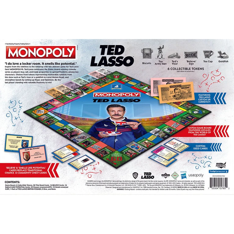 Inspire from the sidelines to the tabletop with this ultimate game for Ted Lasso fans! MONOPOLY: Ted Lasso celebrates the Emmy Award winning comedy series as players buy, sell, and trade properties to spread Positivity among key characters. Choose from tokens representing memorable symbols from the show such as Ted's visor or a goldfish to travel Nelson Road, and strengthen bonds by setting up MVPs and Cups. Be the last player standing with valuable Positivity to win! AGE: 8+ 2-6 Players 60+ Minutes ||DPSP-TO74B8E9A4 Our Store We have more items available. Please check them out. Shipping & Handling Flat shipping rate, if specified, does not apply to Canadian territories and remote areas. For U.S., flat shipping rate only applies to lower 48 states. Please contact us for shipping rate if flat shipping rate does not apply to you. Upon receipt of payment, item will ship via Canada Post surface or UPS, Fedex Ground service or another economic service within the timeline specified in item listing. If possible, we will combine shipping for multiple items. International Orders Import duties, taxes, customs fees and charges are not included in the item price or shipping charges. These charges are normally collected when you pick up the package. Please check with your country's customs office on what these additional charges will be prior to buying the item(s). International buyers are responsible for these charges. Please note that package shipped from outside your country can be held up in customs and it can cause delay in shipping time. This is beyond our control and there is nothing we can do to speed up the process. Sales Tax For the Canadian buyer, applicable retail sales tax will be charged. Taxes are charged on both Item Price and Shipping & Handling charges if applicable. Store Policy Sales Agreement Upon purchase, you have entered a binding contract under the terms of the listing. If an item is out of stock or on backorder , you will be notified and given the option to wait for the item to become available, choose another item, or a full refund. Backordered items are shipped as they become available. Return and Refund Unless specified otherwise, every item purchase (except health, hygienic, food products and items with No Return Accepted specified in the listing) comes with unconditional money back guarantee minus shipping & handling charge and 20% restocking fee . Before returning, please contact us for a RMA number. All returns must come with a RMA number. Return without a RMA number will NOT be accepted. Buyer is responsible for the shipping cost of returning the item(s) to us and all original shipping, handling, insurance, and other fee associated with the returned item(s) are not refundable. For free shipping item(s), we still pay for shipping when sending item(s). The shipping cost associated with free shipping item(s) is not refundable. All merchandise returned must be in its original states with tag intact, undamaged, clean and unused. Any return must be made within 30 days of receipt. Upon receipt and careful examination of the returned merchandise, refund will be issued and you will be notified after the refund is processed. Please allow 5 business days from the time we receive your returned item(s) for your refund to be issued. Communication All communication must be conducted via online message. We do not offer customer service over the phone. We answer all messages promptly, usually within 1-2 days. As a general note, if you do encounter a problem with your item(s), please contact us as soon as possible before leaving a negative feedback. We will do our best to help you. Contact Us For local pickup, special requests and special offers, please contact us.