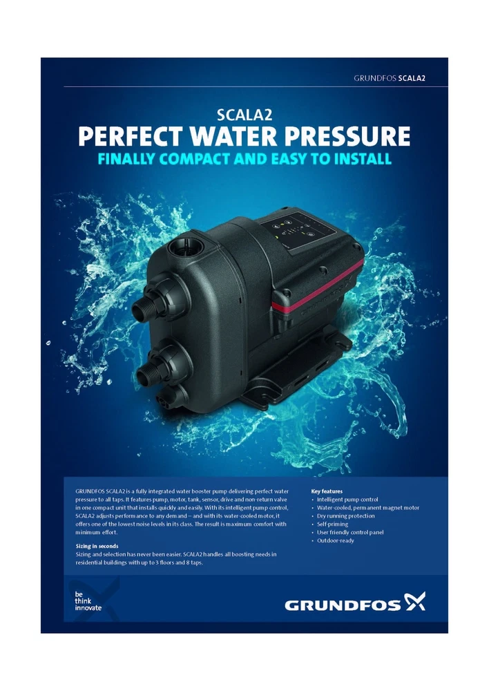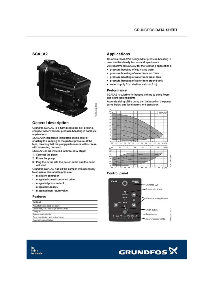 Grundfos 98562818 SCALA2 3-45 AVCBDF 1x115V 60Hz Pressure Boosting Pump Description Grundfos 98562818 SCALA2 3-45 AVCBDF 1x115V 60Hz Pressure Boosting Pump Features: Perfect water pressure: intelligent pump control adjusts operation automatically Low noise: as quiet as a modern dishwasher (47 dba) in typical use) Easy selection: one variant for all domestic boosting needs Easy installation: compact, all-in-one solution, plug-and-pump. Easy to operate: user-friendly control panel Boosting from wells: Pumps water from a depth of 8 meters Product Details: Brand: Grundfos Color: Black Material: Stainless Steel Style: Above Ground Product Dimensions: 15.9"L x 7.6"W x 11.9"H Power Source: AC Adapter Item Weight: 22 Pounds Maximum Flow Rate: 3500 Liters Per Hour Maximum Lifting Height: 8 Meters Voltage: 115 Volts Brand: Grundfos Color: Black Material: Stainless Steel Style: Above Ground Product Dimensions: 15.9"L x 7.6"W x 11.9"H Power Source: AC Adapter Item Weight: 22 Pounds Maximum Flow Rate: 3500 Liters Per Hour Maximum Lifting Height: 8 Meters Voltage: 115 Volts Global Trade Identification Number: 75 Manufacturer: Grundfos UPC: 860000700252 735090201401 Part Number: 98562818 Item Weight: 22 pounds Item model number: 98562818 Is Discontinued By Manufacturer: No Wattage: 550 watts Item Package Quantity: 1 Sound Level: 45 dB Included Components: Pressure Boosting Pump Batteries Included?: No Batteries Required?: No Date First Available: August 11, 2016 Delivery We Do Not Ship Outside of the Continental US. Return Policy All items qualify for returns within 30 days of receipt. Buyer is responsible for return shipping on any item that is not damaged. Feedback We take our reputation seriously, we buy and sell online, so we understand the value of trust. If you are unsatisfied with your order, please contact us and we will work with you to resolve it to your satisfaction.